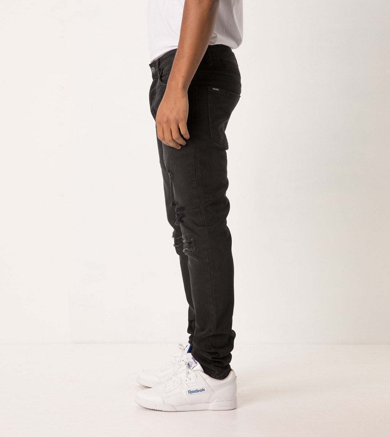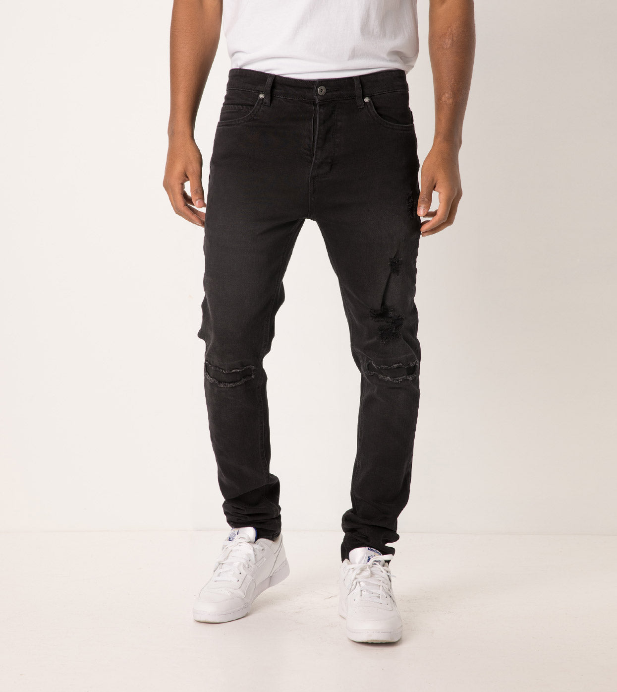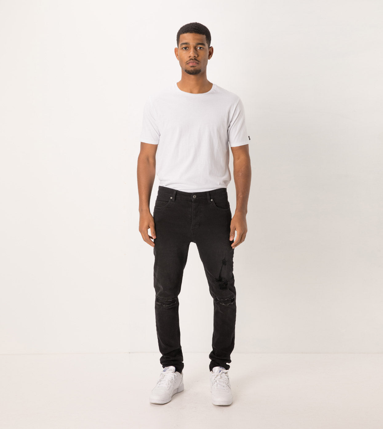 The ZANEROBE Joe Blow Denim in Archive Black Repair - ZANEROBE's signature Jean fit, classic 5-pocket construction, tailored straight fit, knee rips, regular rise and button fly. We wear with our classic Flintlock Tee.