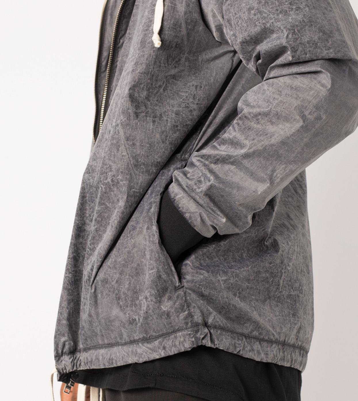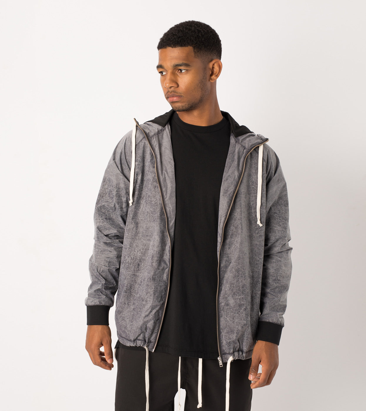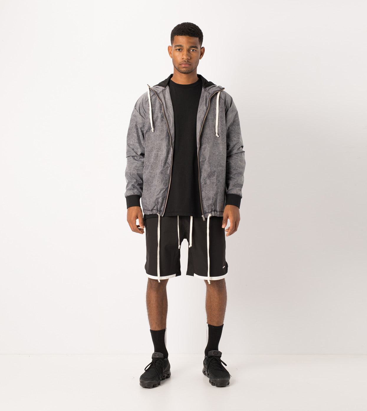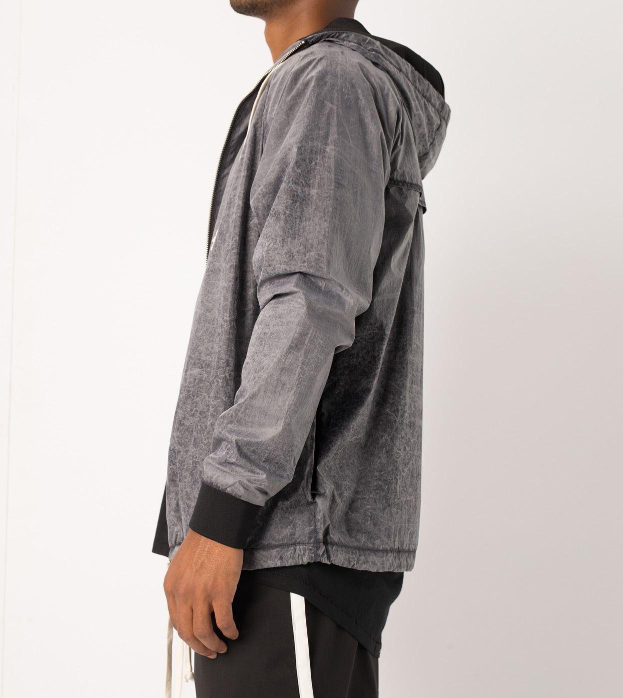 The ZANEROBE Storm Spray Jacket in Scratched Grey - 100% nylon outer, 100% polyester lining, concealed zip pockets, contrast ribbed cuffs, aluminium eyelets, custom developed drawcords, regular fit. We wear with our Goaline Shorts. NOTE: Scratched fabric throws a steel-purple colour effect under certain lighting conditions.