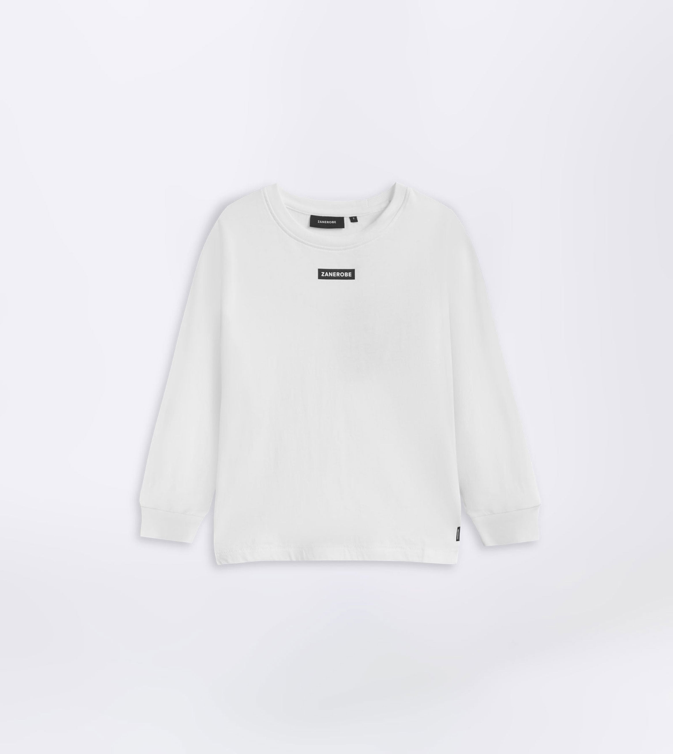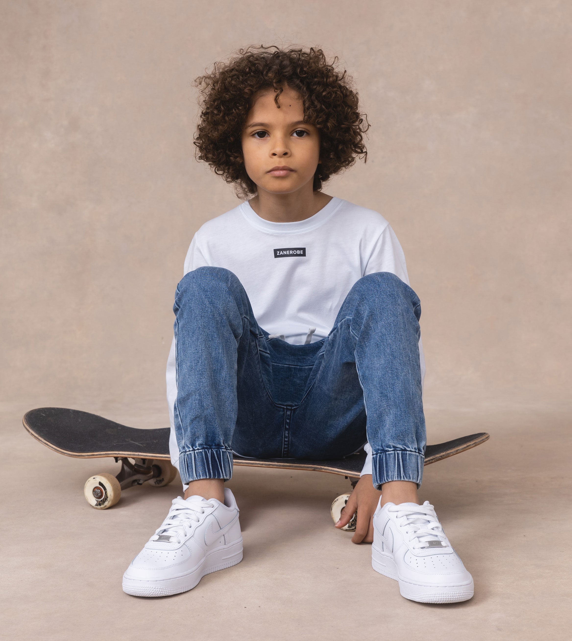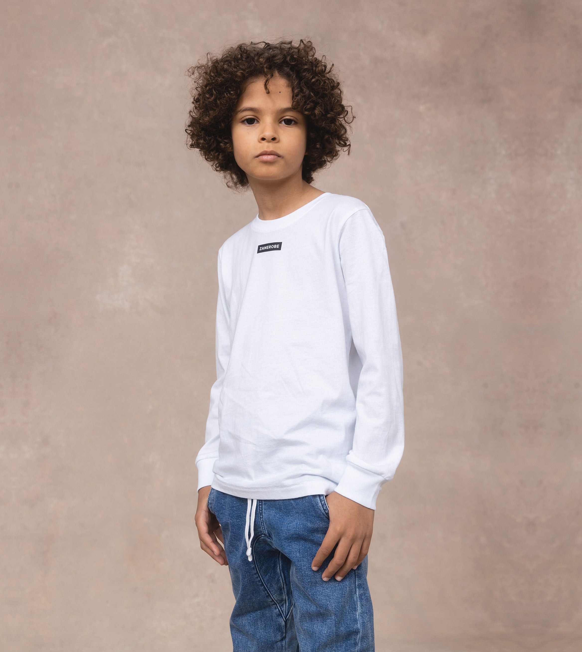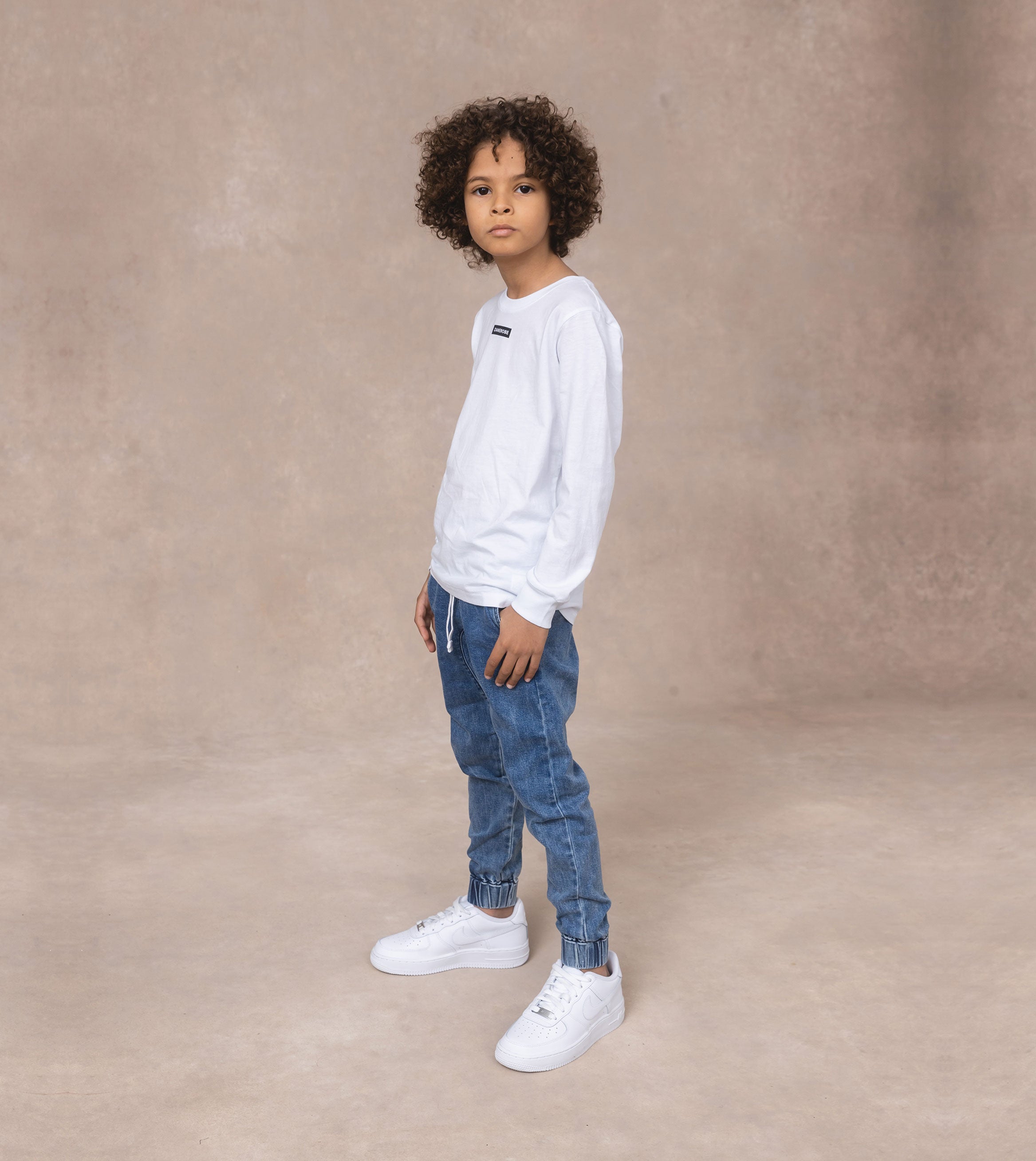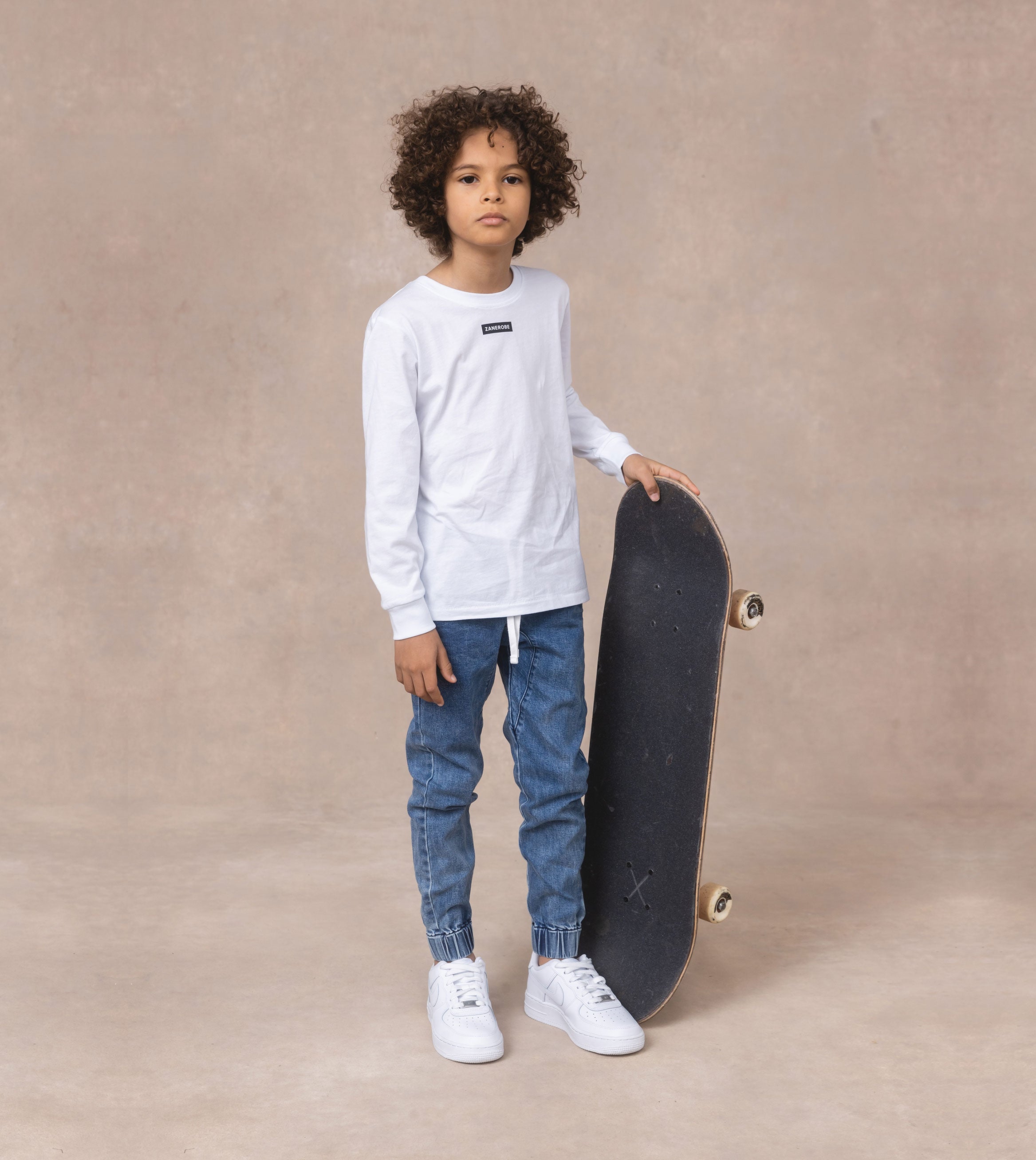 'LIL ZANE premium quality, organic long sleeve tee. Sustainable, super-comfortable, ultra-durable construction - wear, play, wash, repeat with absolute confidence. Looks great paired with our Smallshot Denim Jogger Essential Blue (featured) and Orgo Hoody Black.