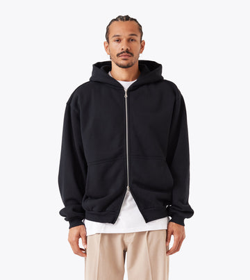 The ZANEROBE Box Zip Hood in Black is made from a heavy-weight brushed back fleece fabric, containing 80% cotton and 20% polyester for ultimate comfort and durability. The large hood features minimal stitching and seams, offering a sleek and modern look. The high dense 2x2 rib at cuffs and hem add sophistication to this relaxed fit hooded sweater, which also includes a slightly cropped length, a double-ended aluminum zipper at the center front, and a signature 'X' stitch in the side seam.