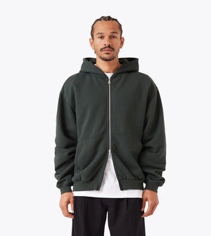 The ZANEROBE Box Zip Hood in Forest is crafted from a heavyweight brushed-back fleece blend of 80% cotton and 20% polyester, delivering exceptional comfort and lasting quality. Designed with a clean, contemporary aesthetic, this hooded sweater features a spacious hood with minimal seams for a refined finish. High-density 2x2 ribbing at the cuffs and hem enhances the relaxed fit, which is slightly cropped for a modern silhouette. Additional details include a durable double-ended aluminum zipper at the front and the signature 'X' stitch on the side seam for a distinct touch.