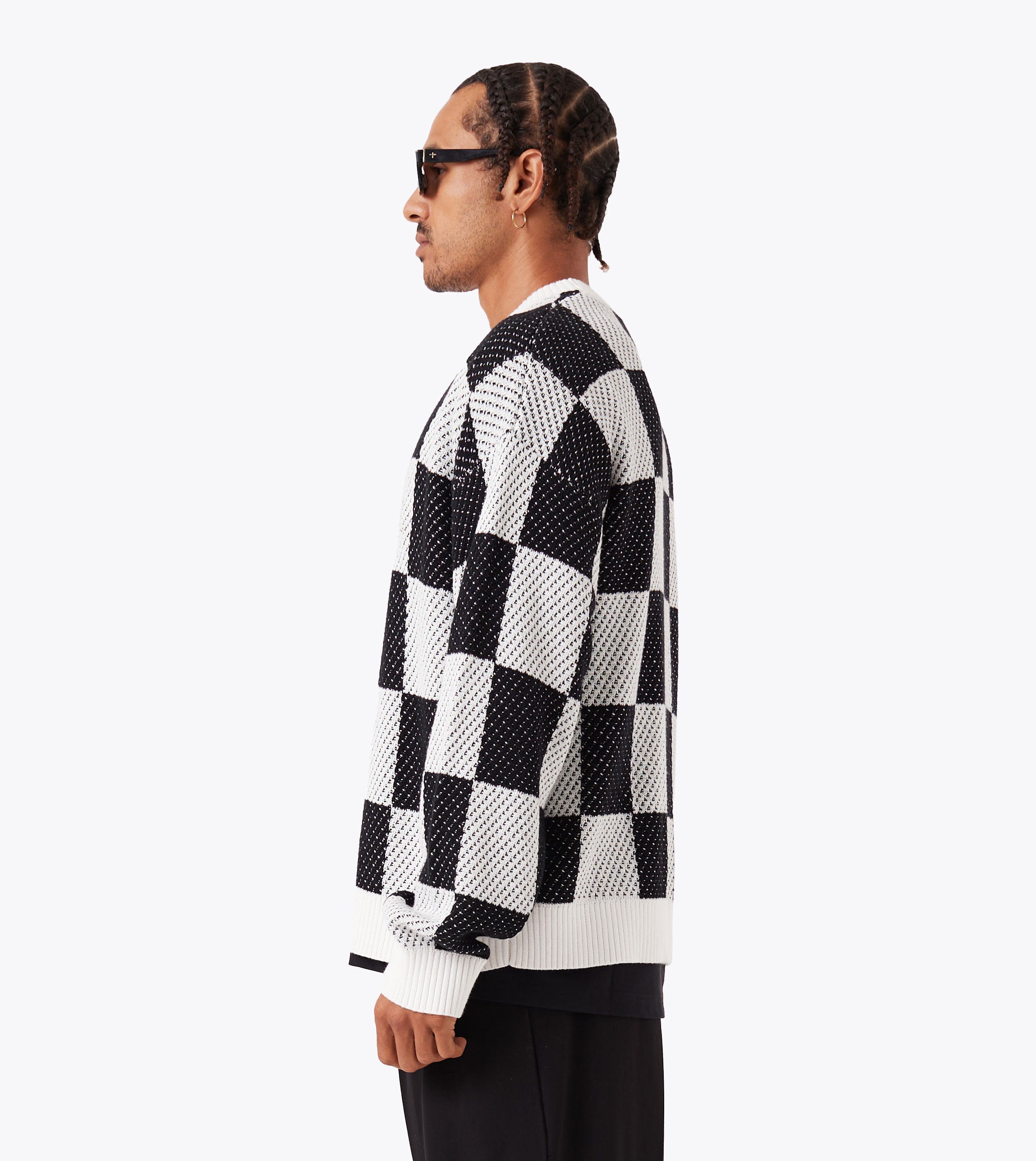 The ZANEROBE Checker OS Knit in Vintage White/Black is crafted from 100% cotton for a soft, elevated feel. Designed with a bold jacquard checker pattern and finished with a signature ZR embroidered emblem, this knitted sweater makes a statement with ease. Chunky ribbed detailing at the hem, cuffs, and neckline enhances structure and comfort, while its wide-body fit and standard length create a perfectly balanced silhouette.