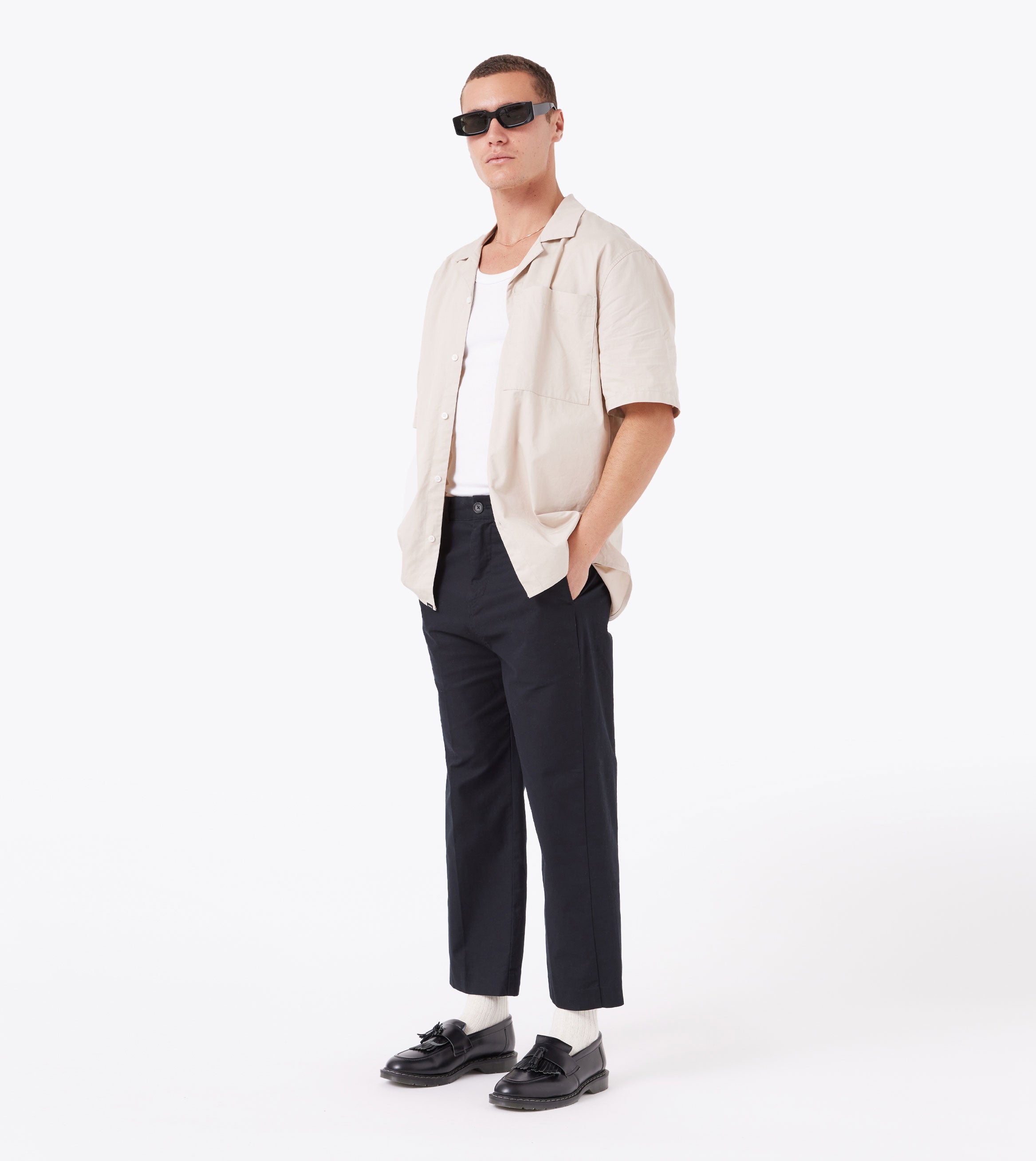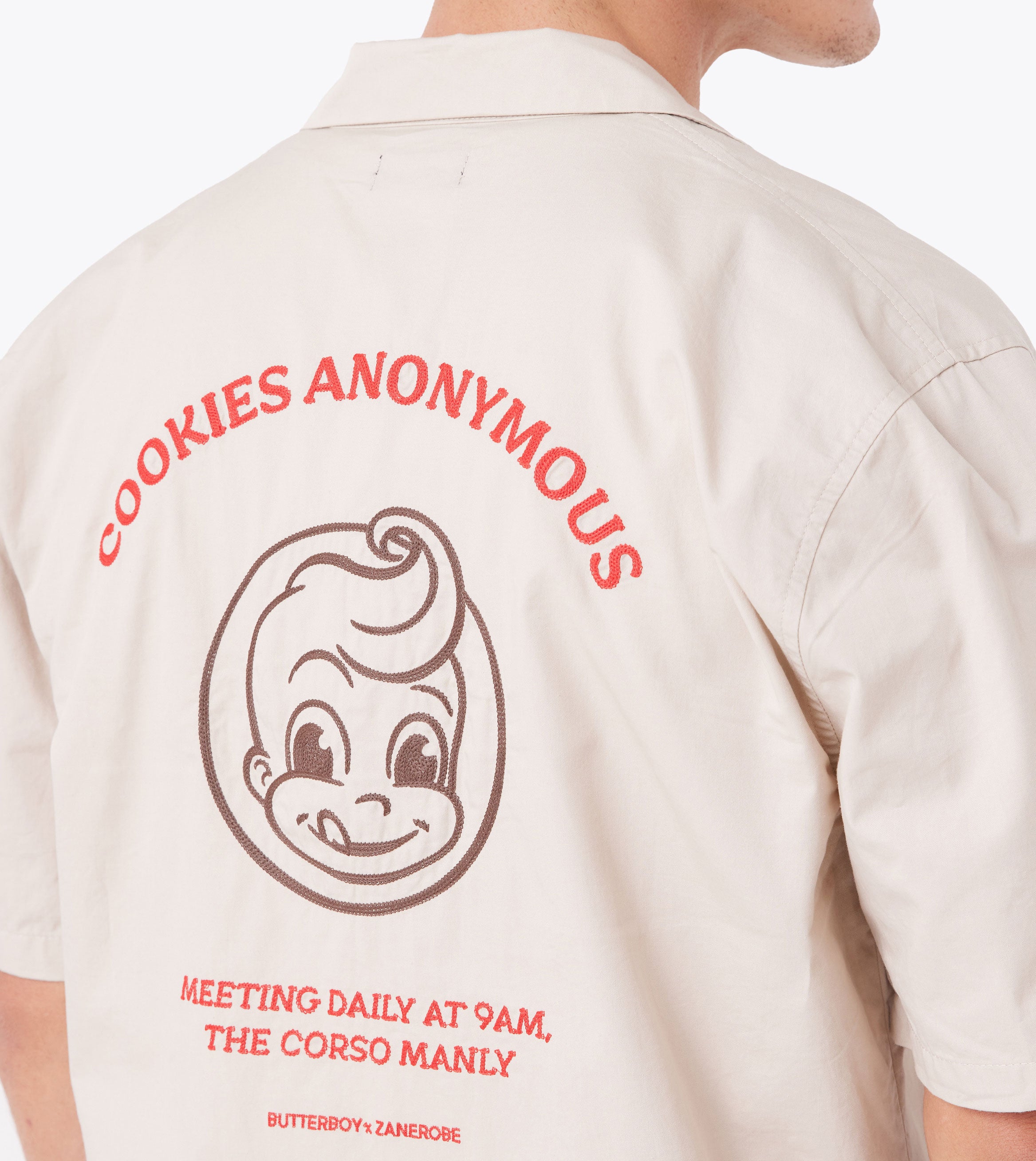 Introducing the ZANEROBE Cookies Orgo Hood Sweat in Black - a must-have from our exclusive limited edition collaboration with Butter Boy Cookies. This special collection is only available on zanerobe.com and directly through Butter Boy, both in-store and online. Crafted with comfort and breathability in mind, this shirt showcases a stylish camp collar, oversize patch pocket and a large chain stitch embroidery on centre back. With its standard fit, it's a versatile choice for a clean and polished look. Pair it with relaxed-fitting cropped chinos to complete your ensemble and make a statement.