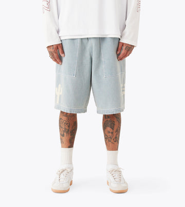 The ZANEROBE Design House Denim Shorts in Lt Blue offer a contemporary take on classic denim with a relaxed, comfortable fit. Crafted from 100% cotton lightweight denim, these shorts provide breathable comfort for warmer days. The multi-placement screen print adds a unique touch, while the large patch pockets with flatlock stitching offer practicality and style. Designed with a wide leg for a laid-back silhouette, these shorts feature a standard rise and an elasticated waist with an internal drawcord for a customizable fit. A perfect blend of ease and modern design, ideal for casual wear.