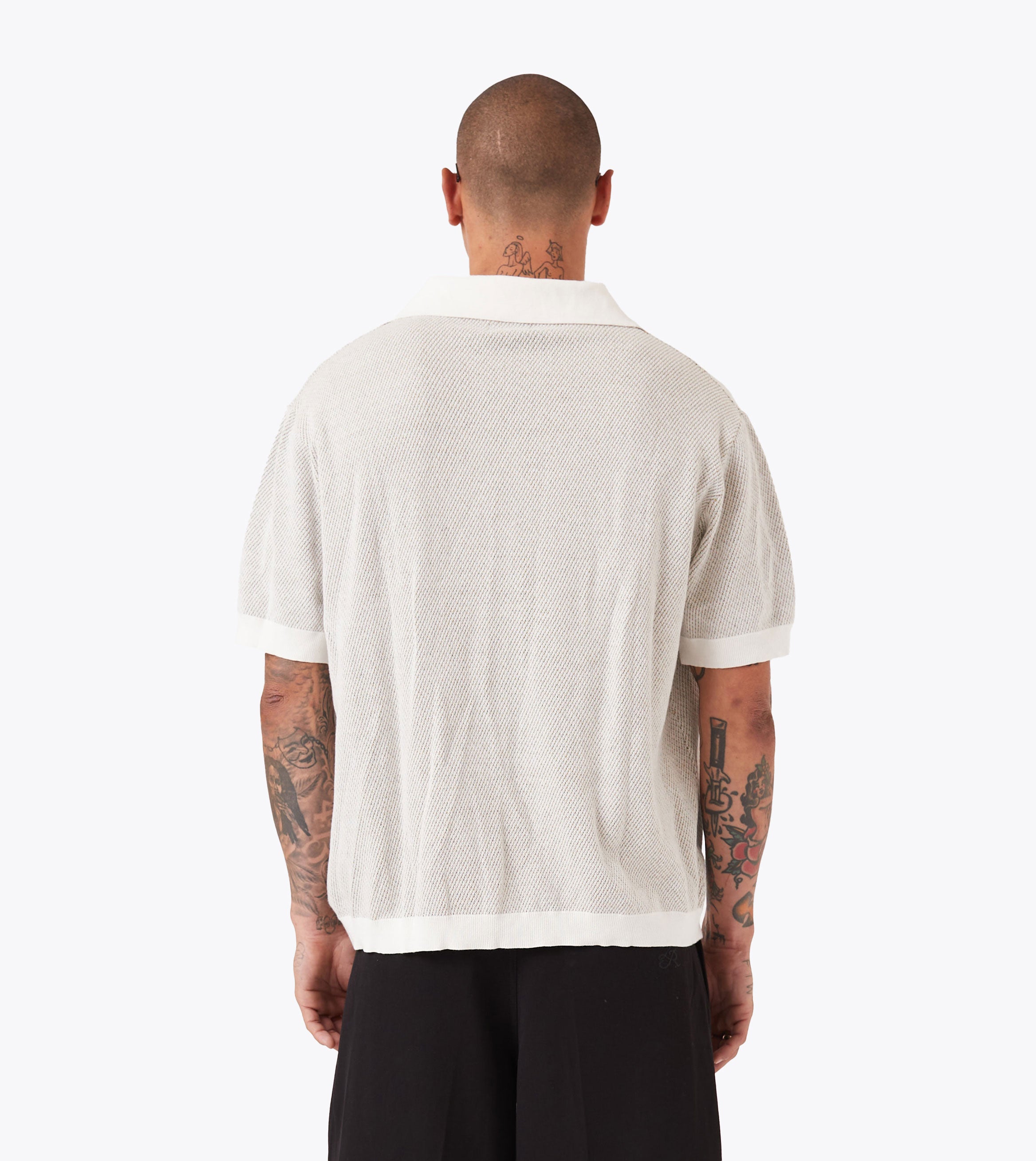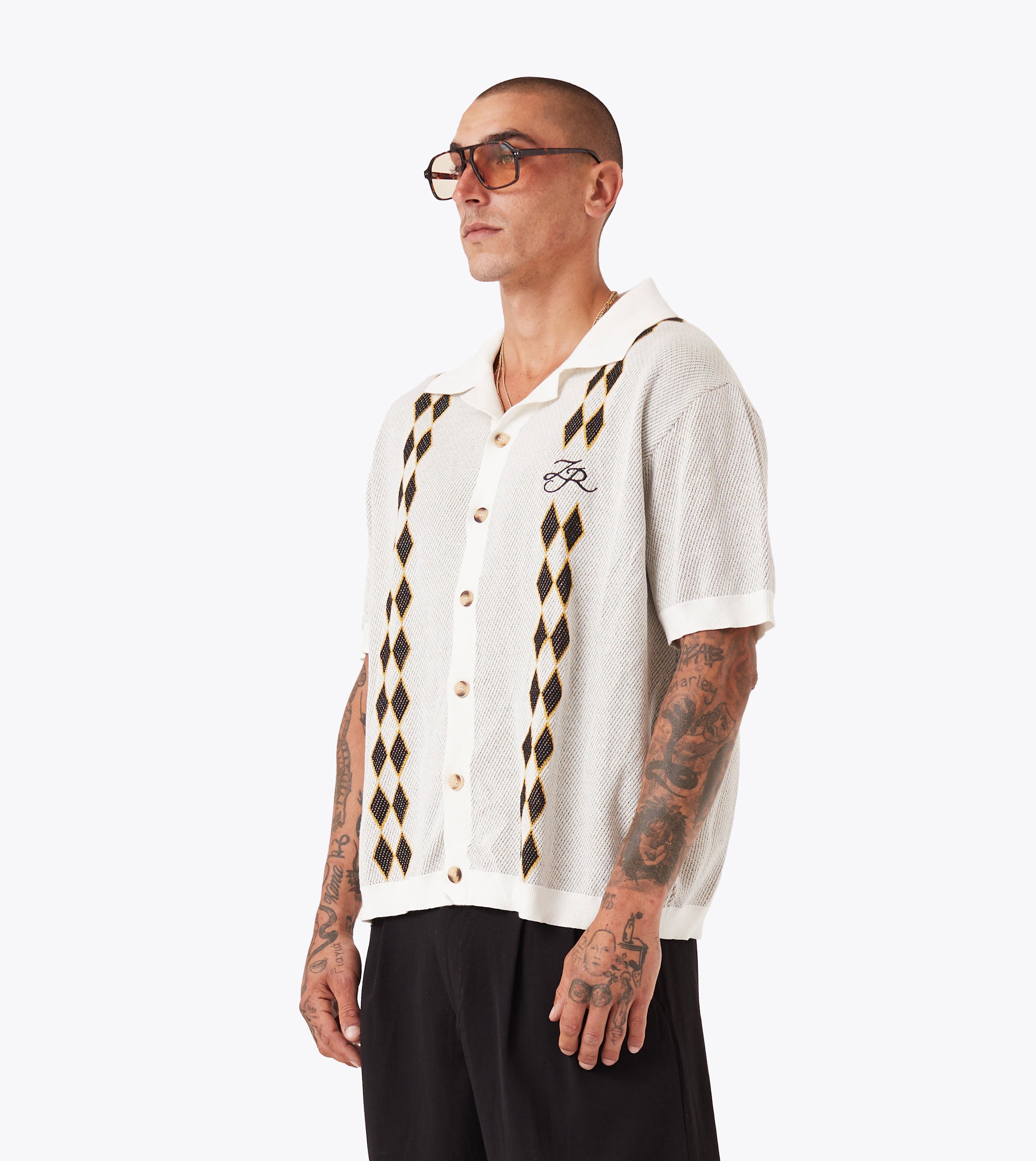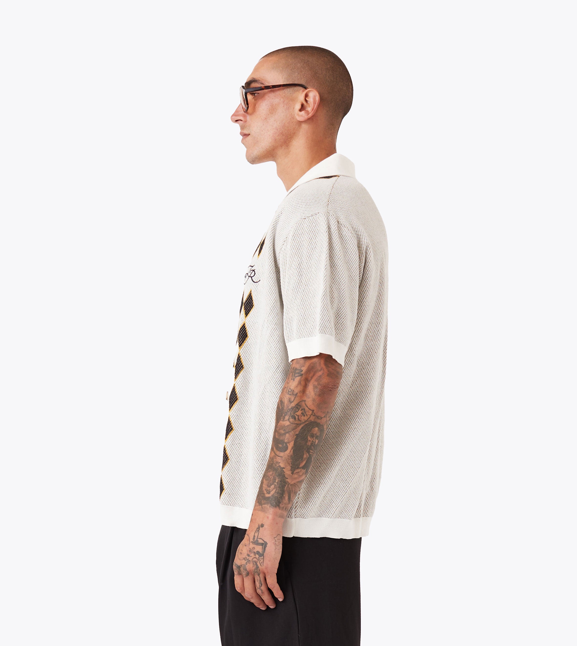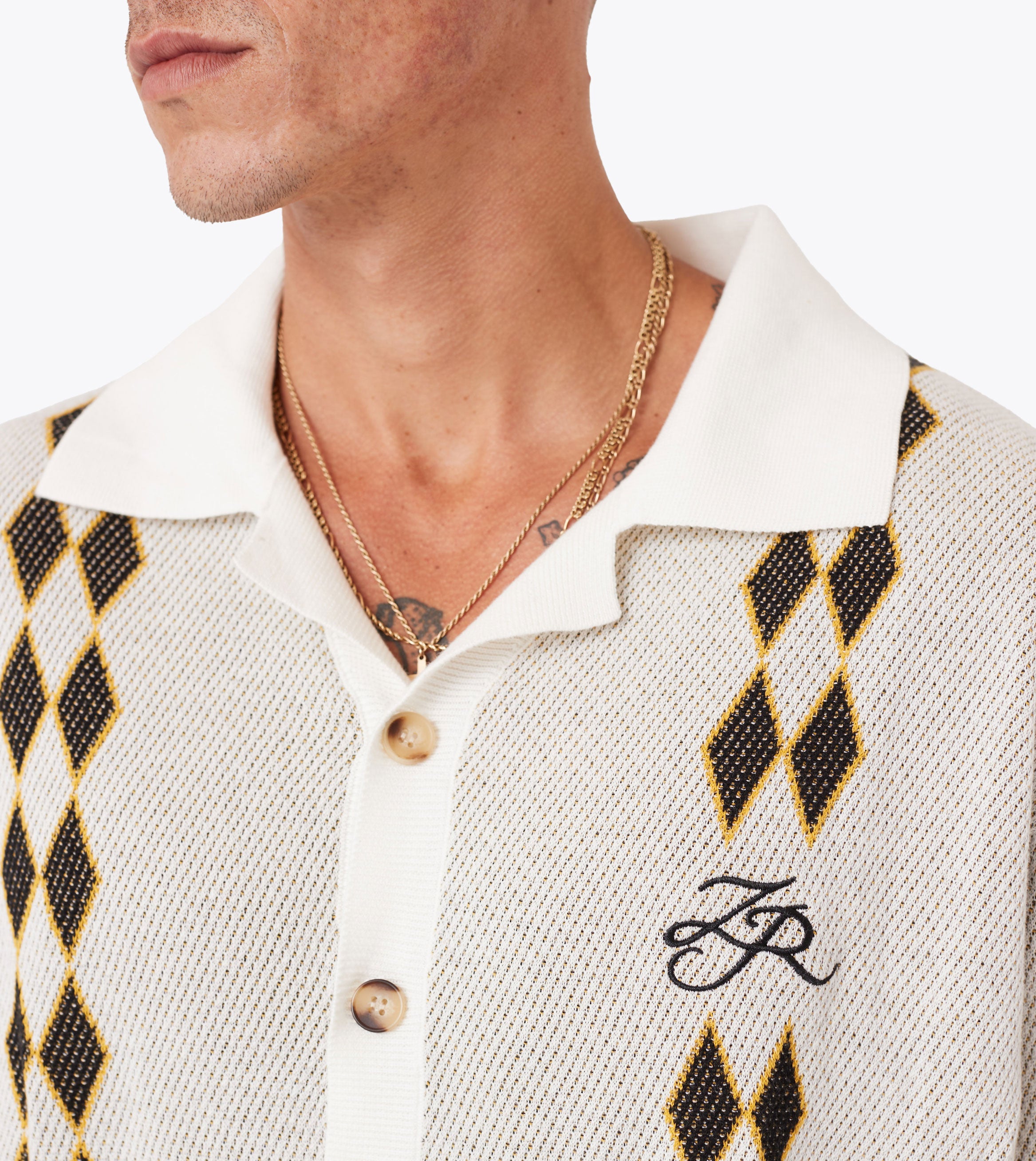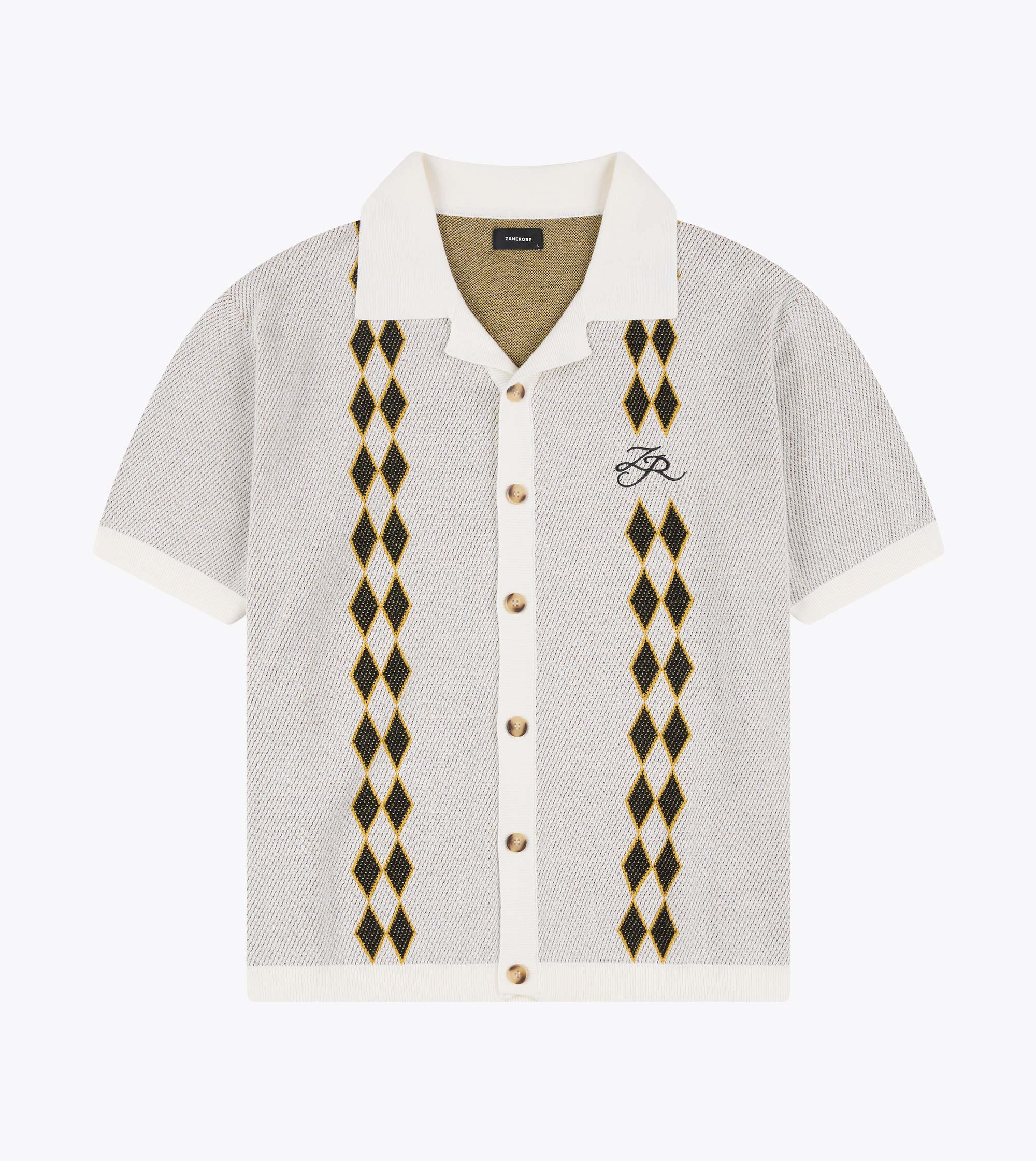 The ZANEROBE Diamond Bowling Knit Shirt in Vintage White is made from 100% cotton sesame knit jacquard, combining effortless style with everyday comfort. Featuring a button-down front, flat knit collar, and cleanly finished hems, it offers a polished yet contemporary aesthetic. A ZR emblem embroidery adds a discreet nod to its distinctive design, making this shirt a standout addition to any wardrobe.