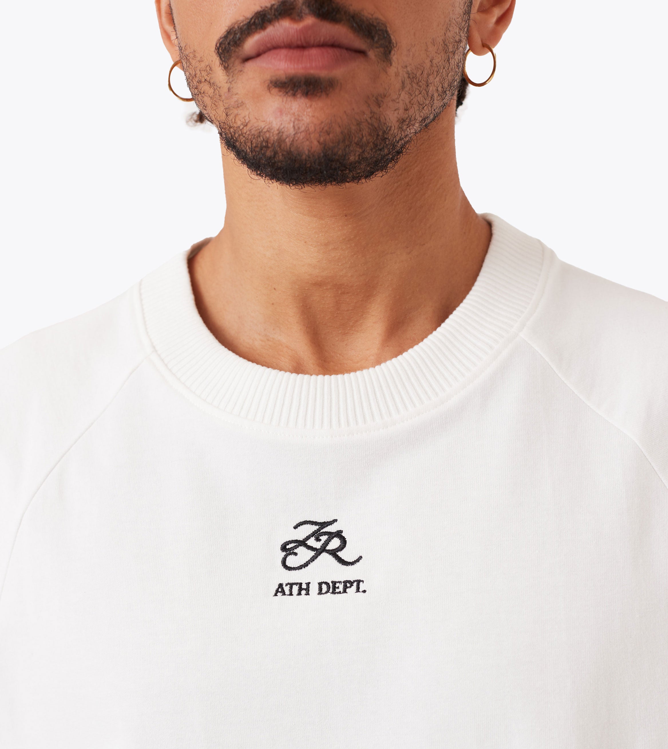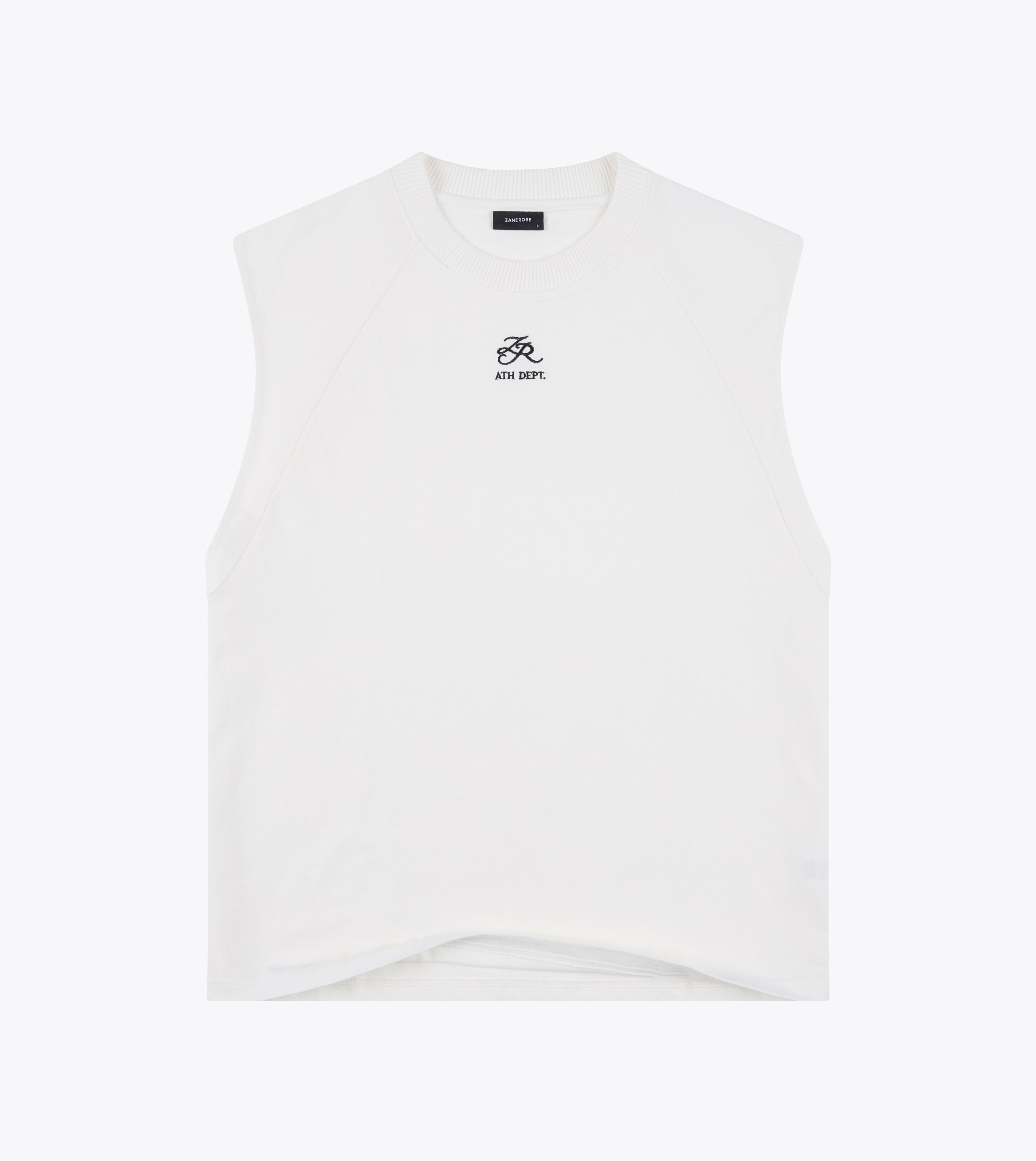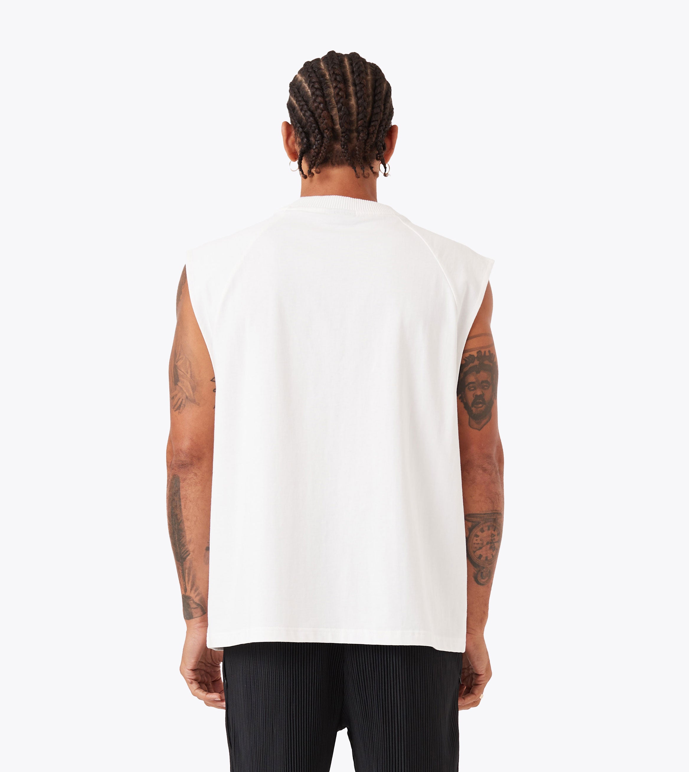 Crafted from 100% heavyweight cotton, the Emblem Muscle Tee in Vintage White features a relaxed oversized silhouette with tonal raglan sleeves, seamlessly blending comfort with a classic minimalist aesthetic. The front showcases an embroidered emblem logo, adding to its understated design, making this muscle tee a must-have piece in any collection.