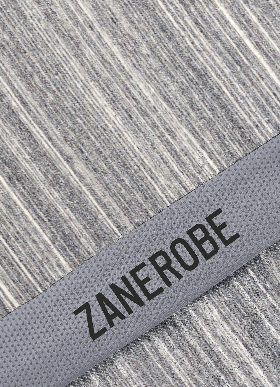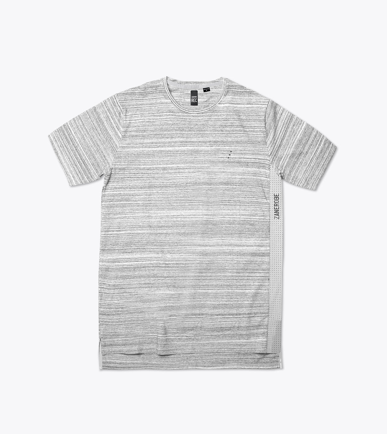 ZANEROBE REC Flintlock Tee Space Grey. Performance crew tee with high stretch-tension fabric. Enables movement with no resistance. Perforated, woven stretch side-body insert for increased air flow, and heat transfer branding. Ideal for warm-up, training & competition.