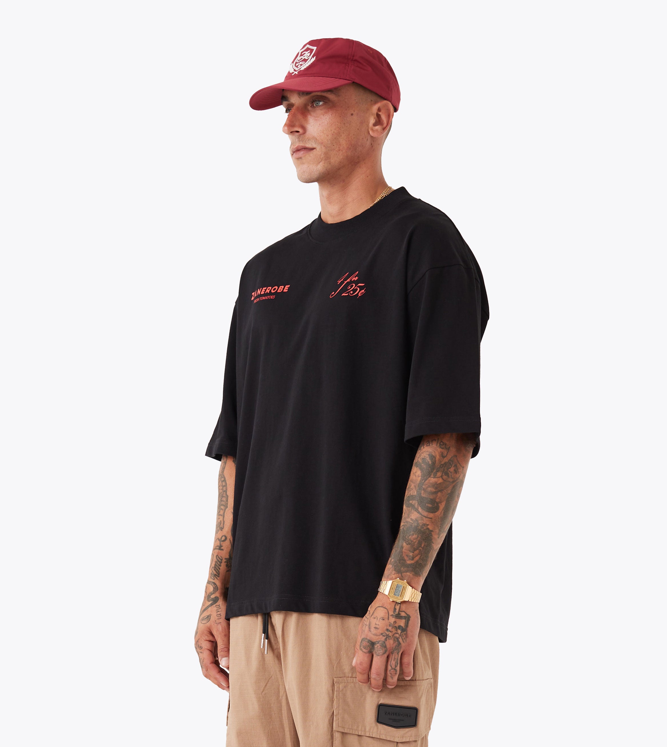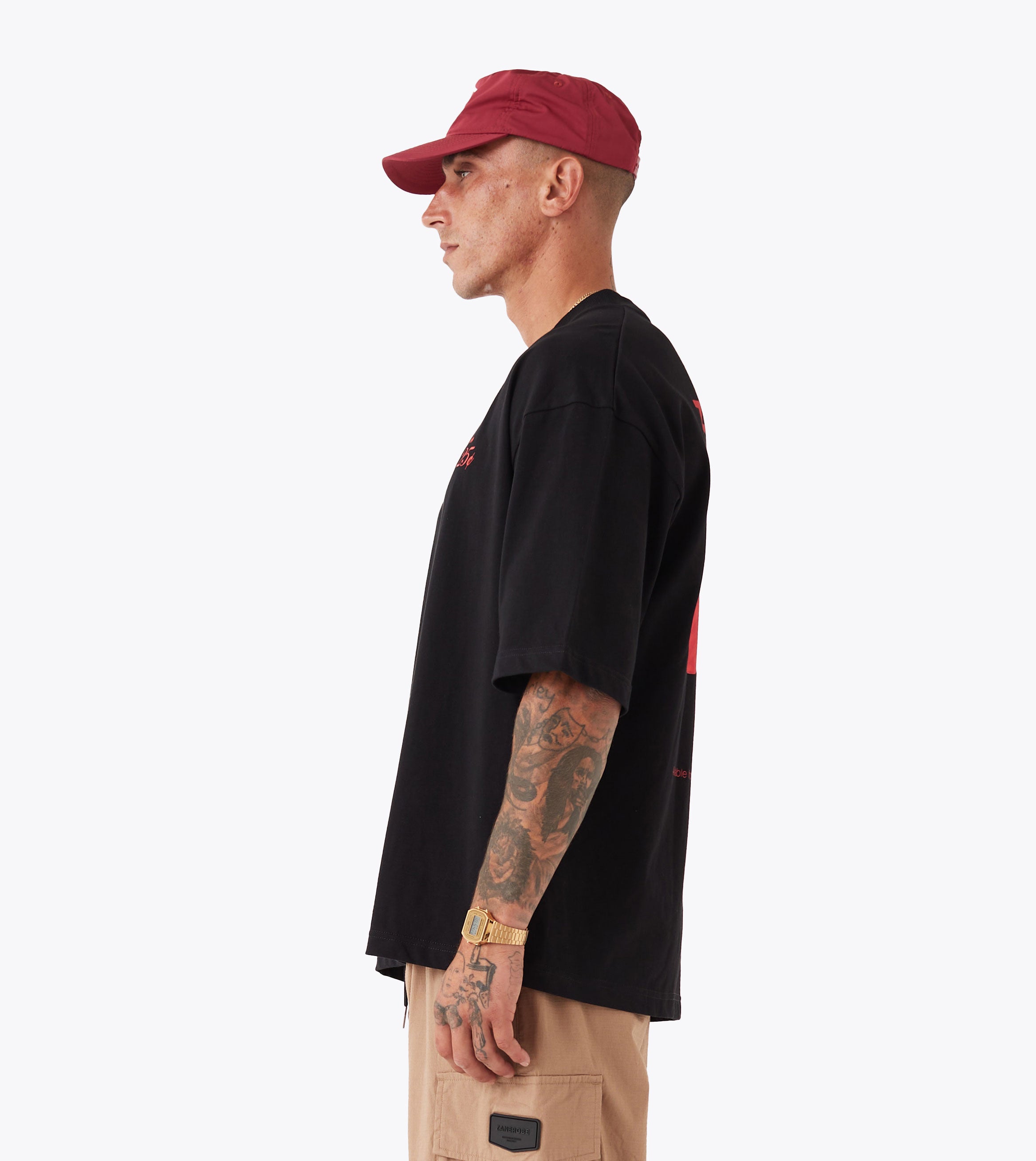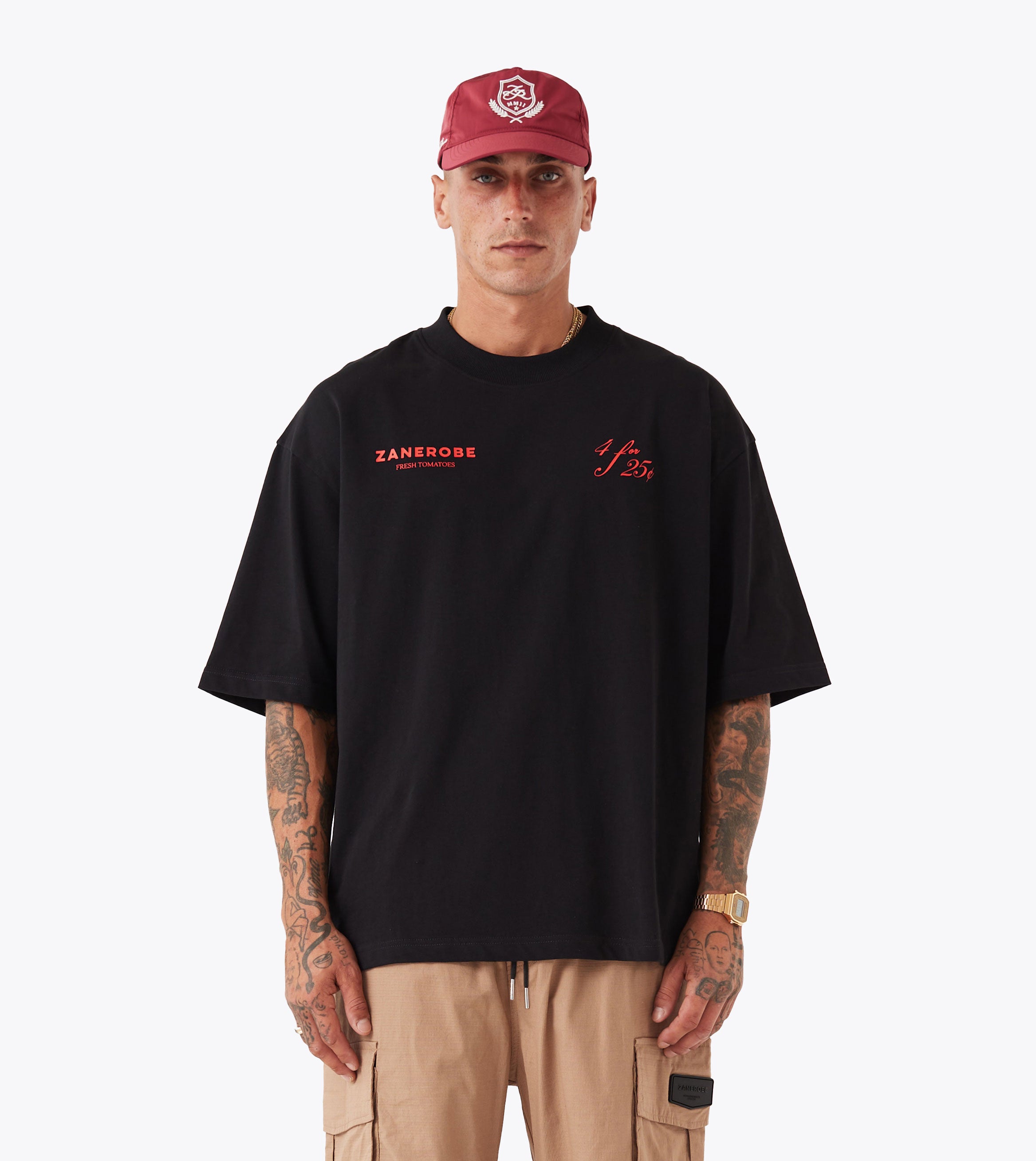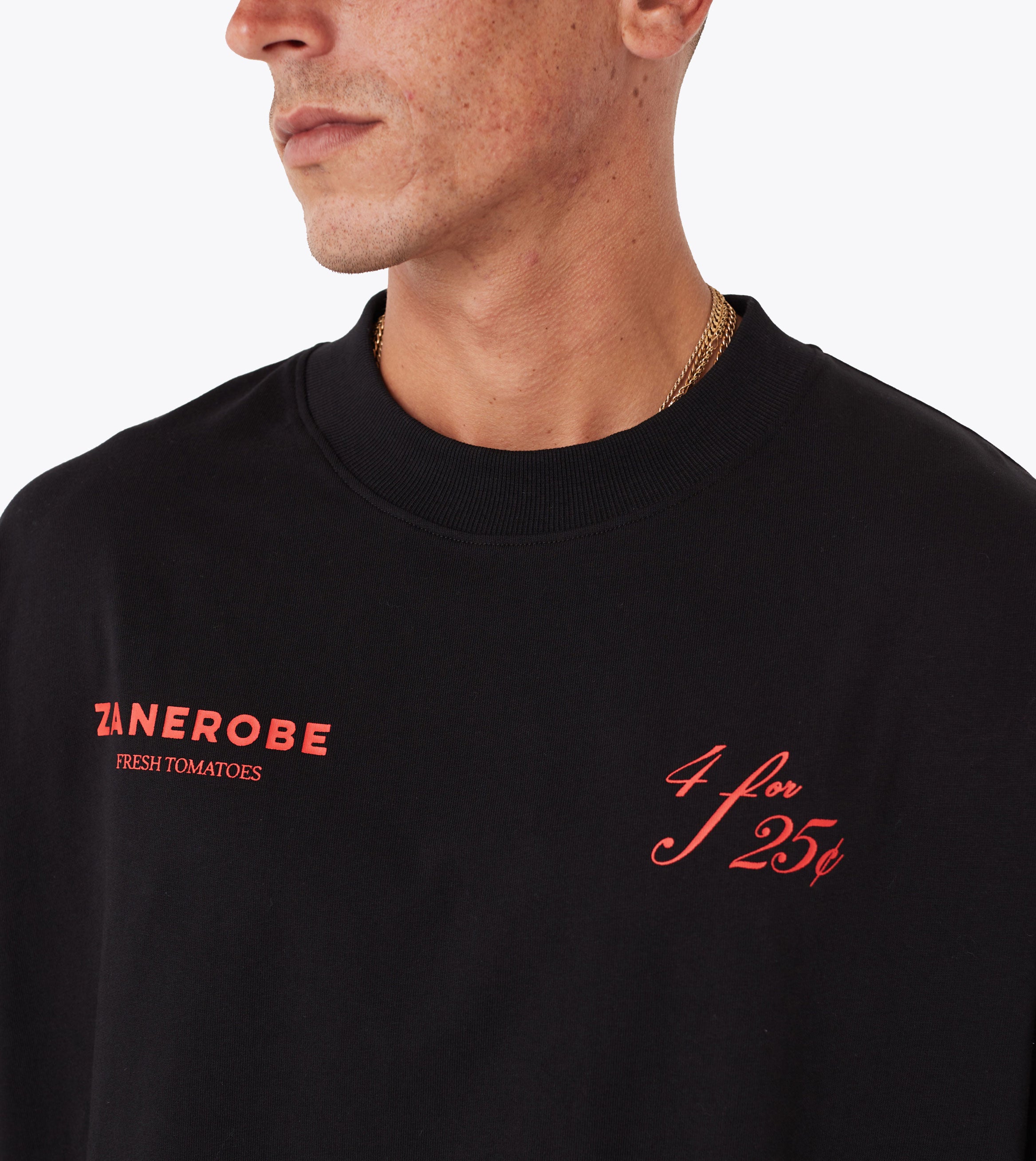 The ZANEROBE Fresh Produce Flow Tee in Black brings a playful edge to everyday dressing. Made from heavyweight 260gsm cotton jersey, it offers a premium hand feel with a structured drape that hangs just right. Featuring an oversized fit with drop shoulders and a thick ribbed neckline, it balances comfort with statement appeal. A subtle front plastisol print sets the tone, while a bold digital graphic on the back delivers unexpected impact. Easy to style, made to stand out.
