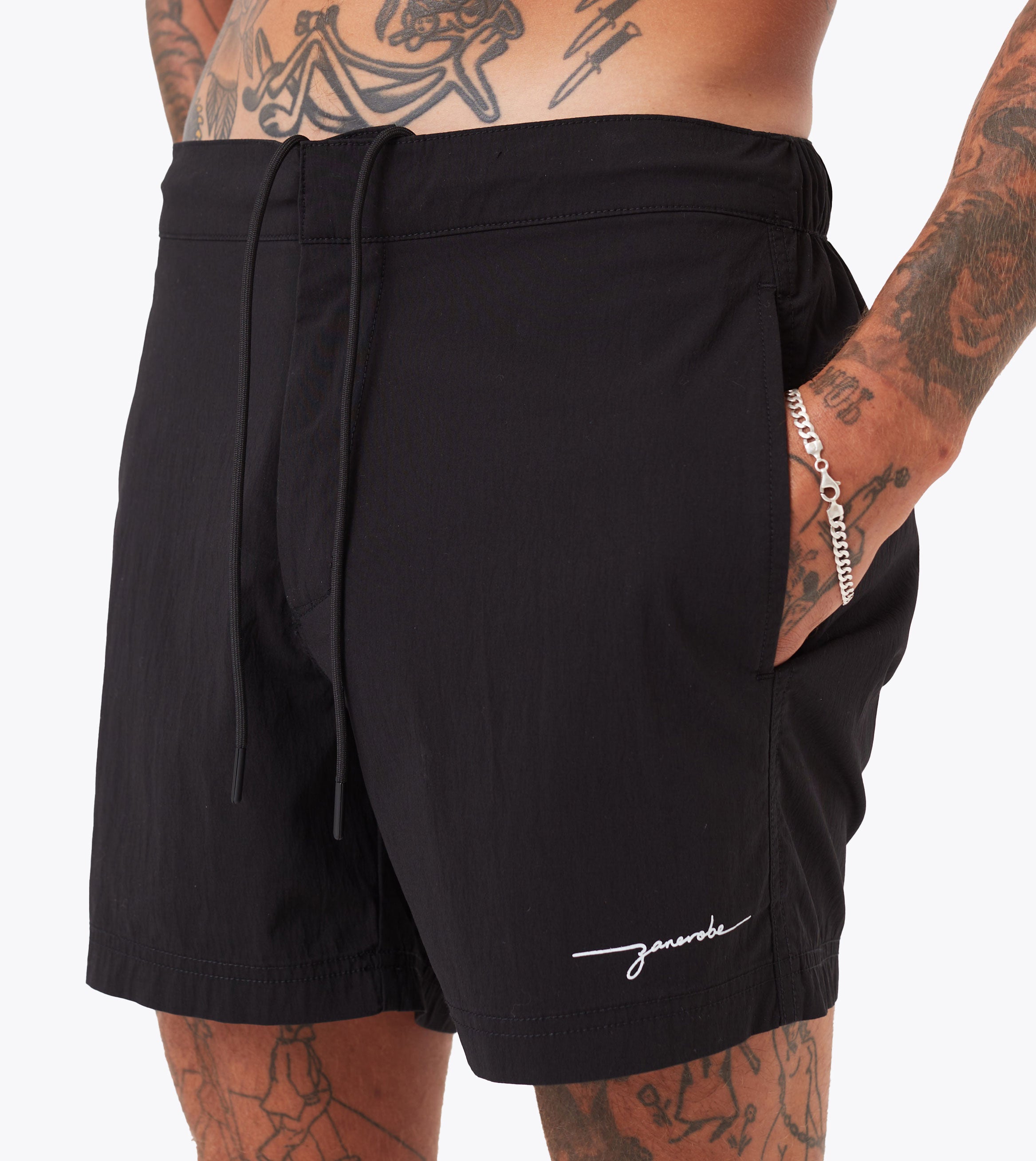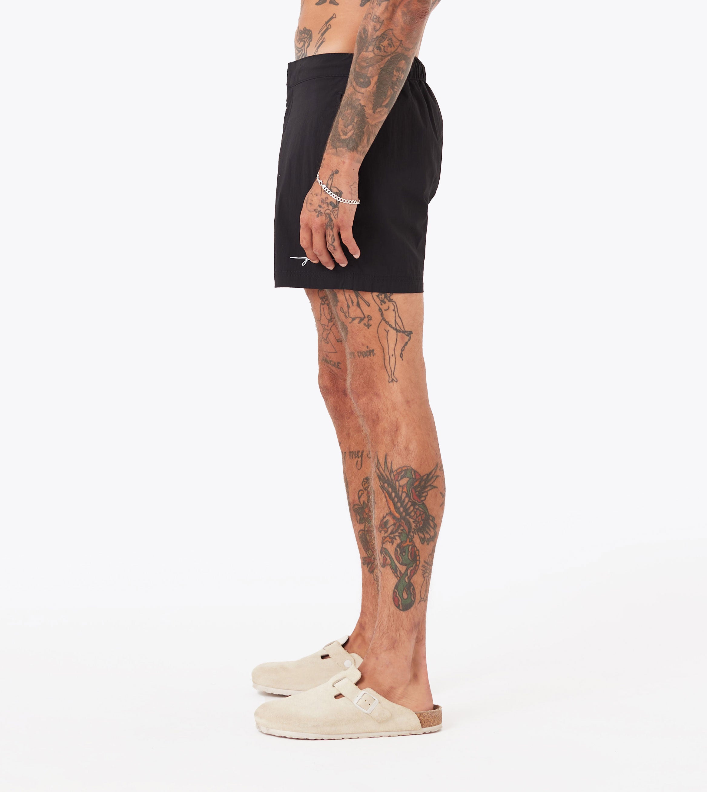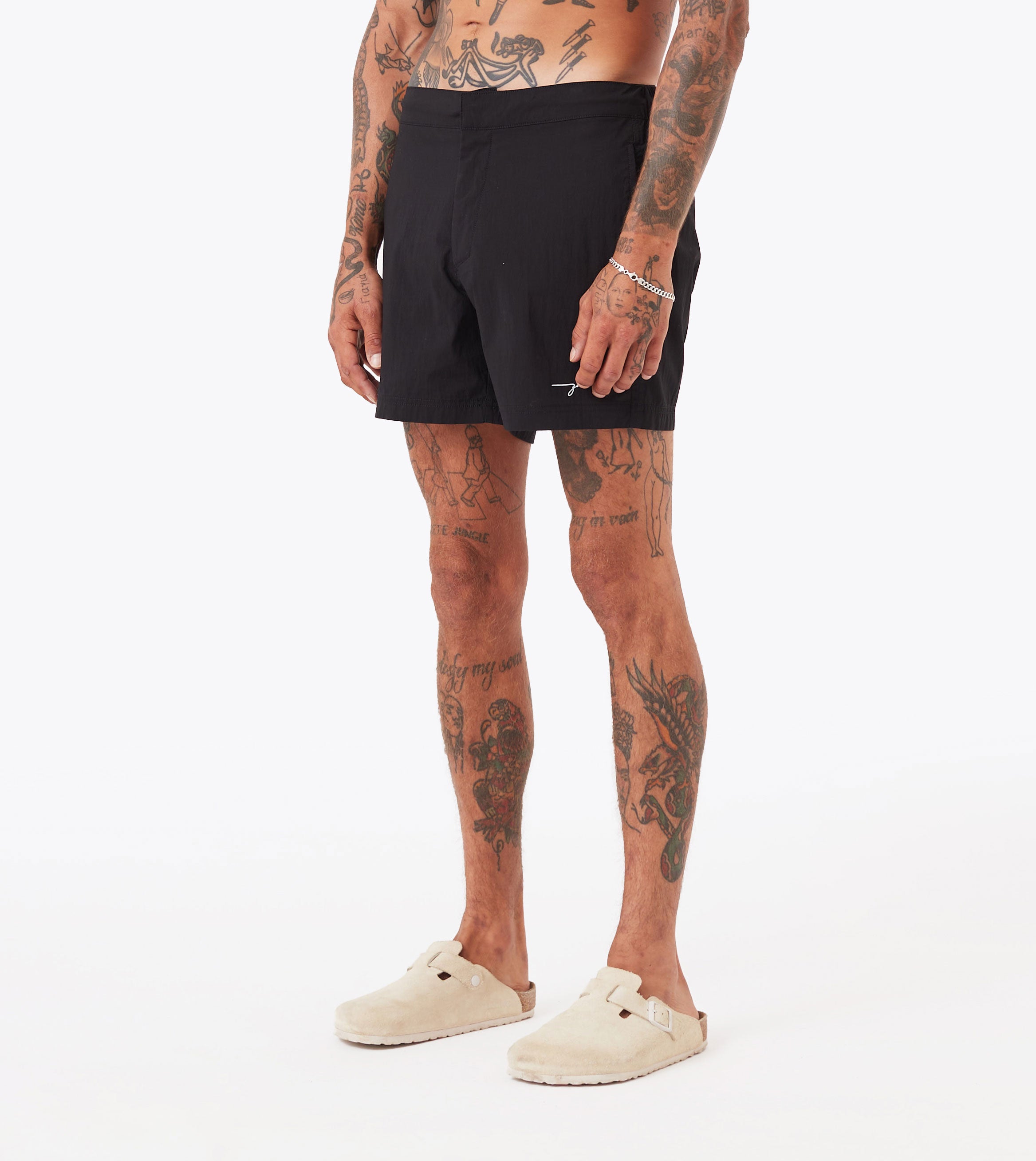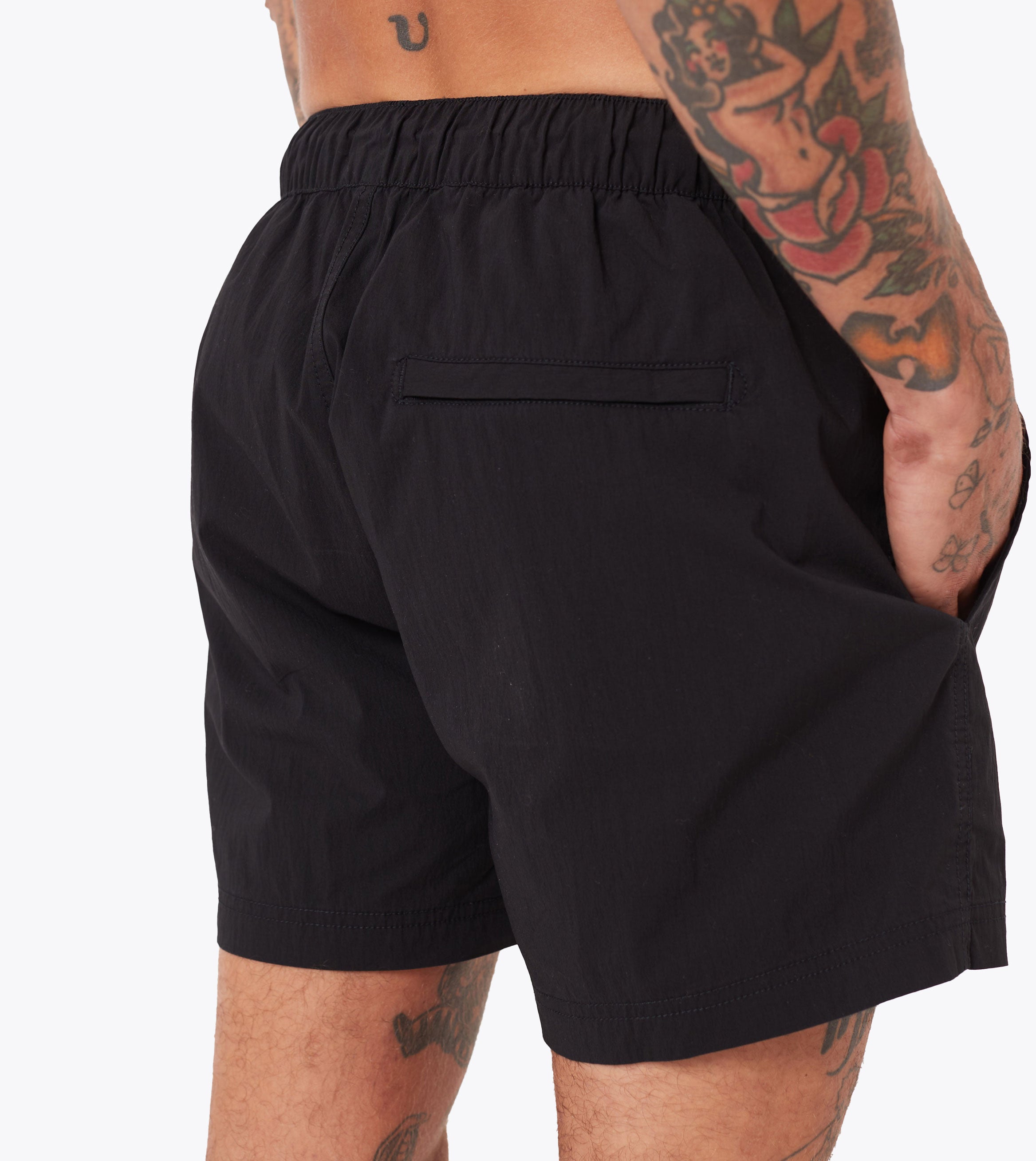 Meet our Holiday Swim Short in Black, made from 65% cotton, 32% nylon, and 3% elastane for lightweight, quick-drying comfort. The semi elastic waistband, internal drawcords, and snap button/zip closure ensure a secure and adjustable fit. With a shorter length and convenient pockets, these shorts are perfect for any sunny getaway. Wear them with a ribbed tank and a plain over shirt for a clean look.