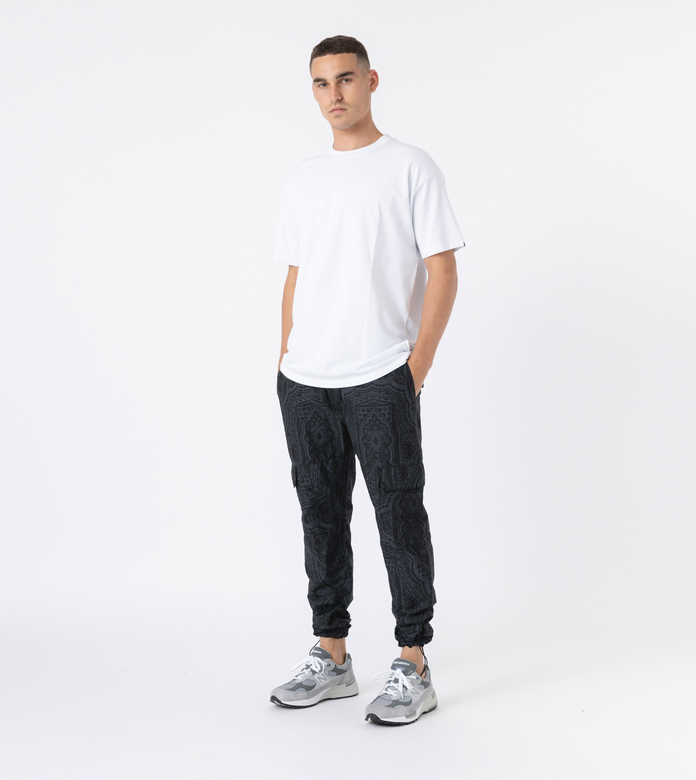 The ZANEROBE Jumpa Cargo Pant in Dk Grey/Black are a lightweight utilitarian pant that can be worn relaxed or tapered by tightening the ankle toggle. Complete the fit with our signature Box Tee.