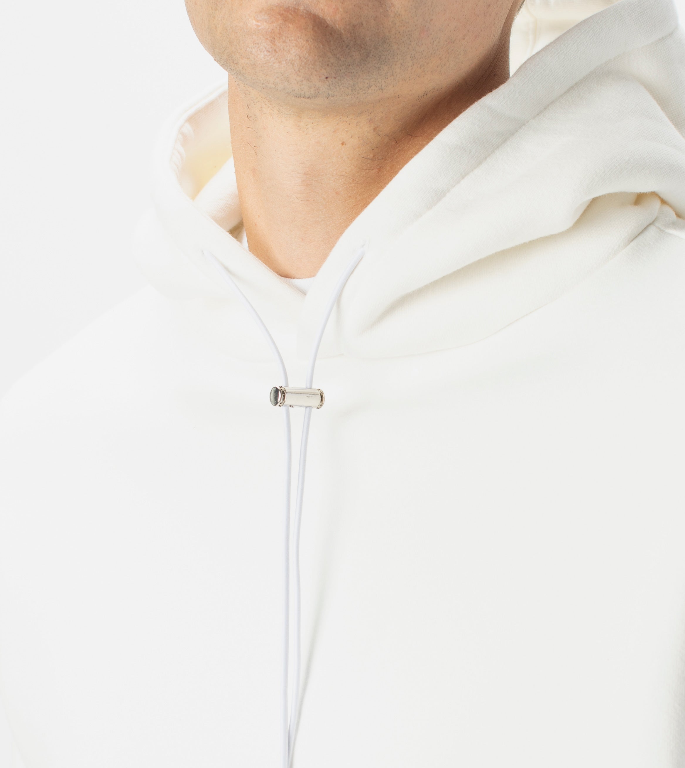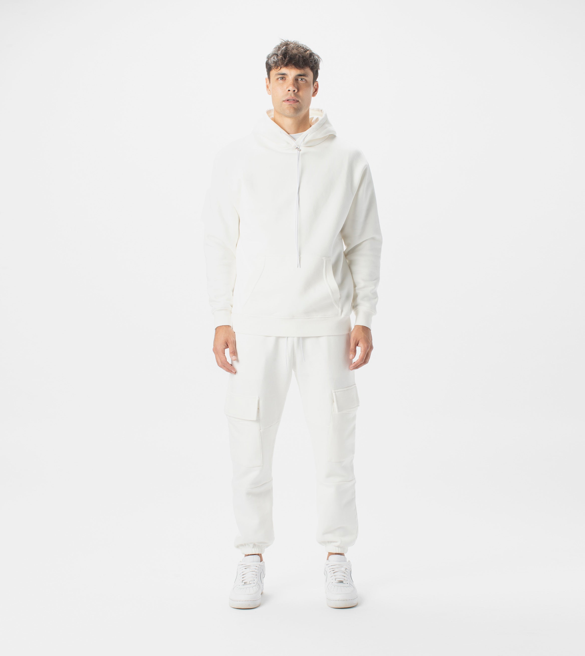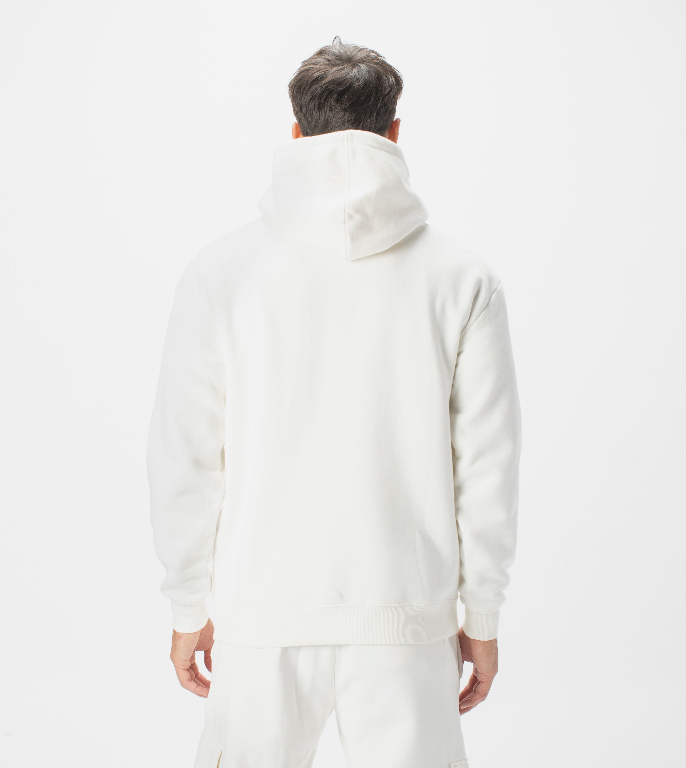 The ZANEROBE Lowgo Hood Sweat in Milk - Exclusive to ZANEROBE.com Oversized retro style with a fleece fabrication. We wear with our the matching Jumpa Cargo or Sureshot Fleece Joggers.