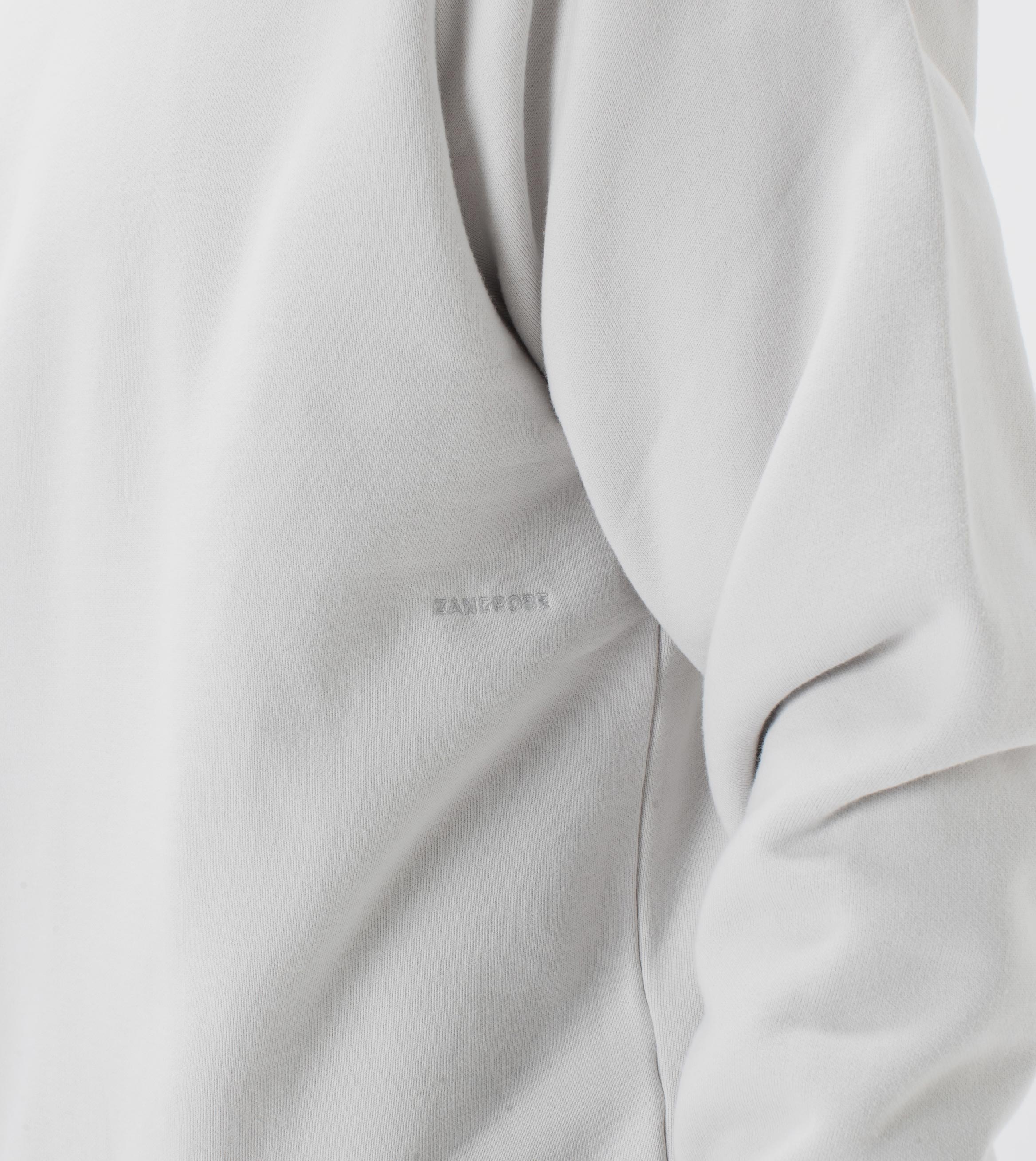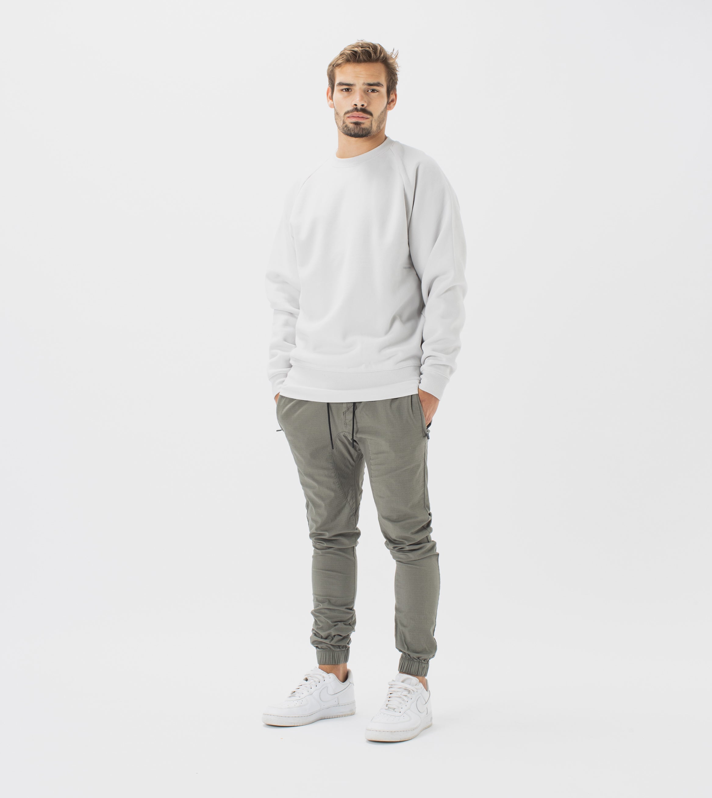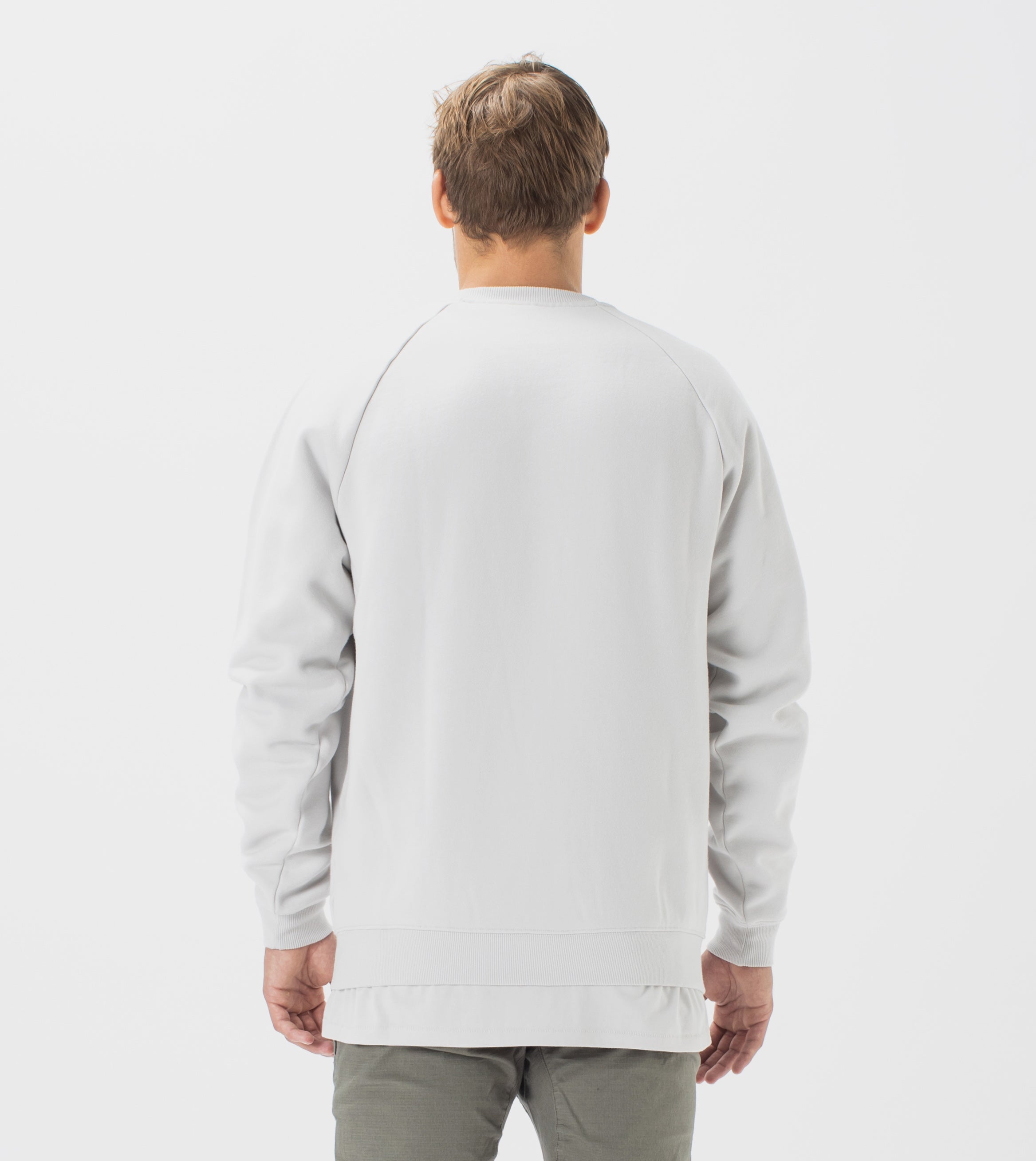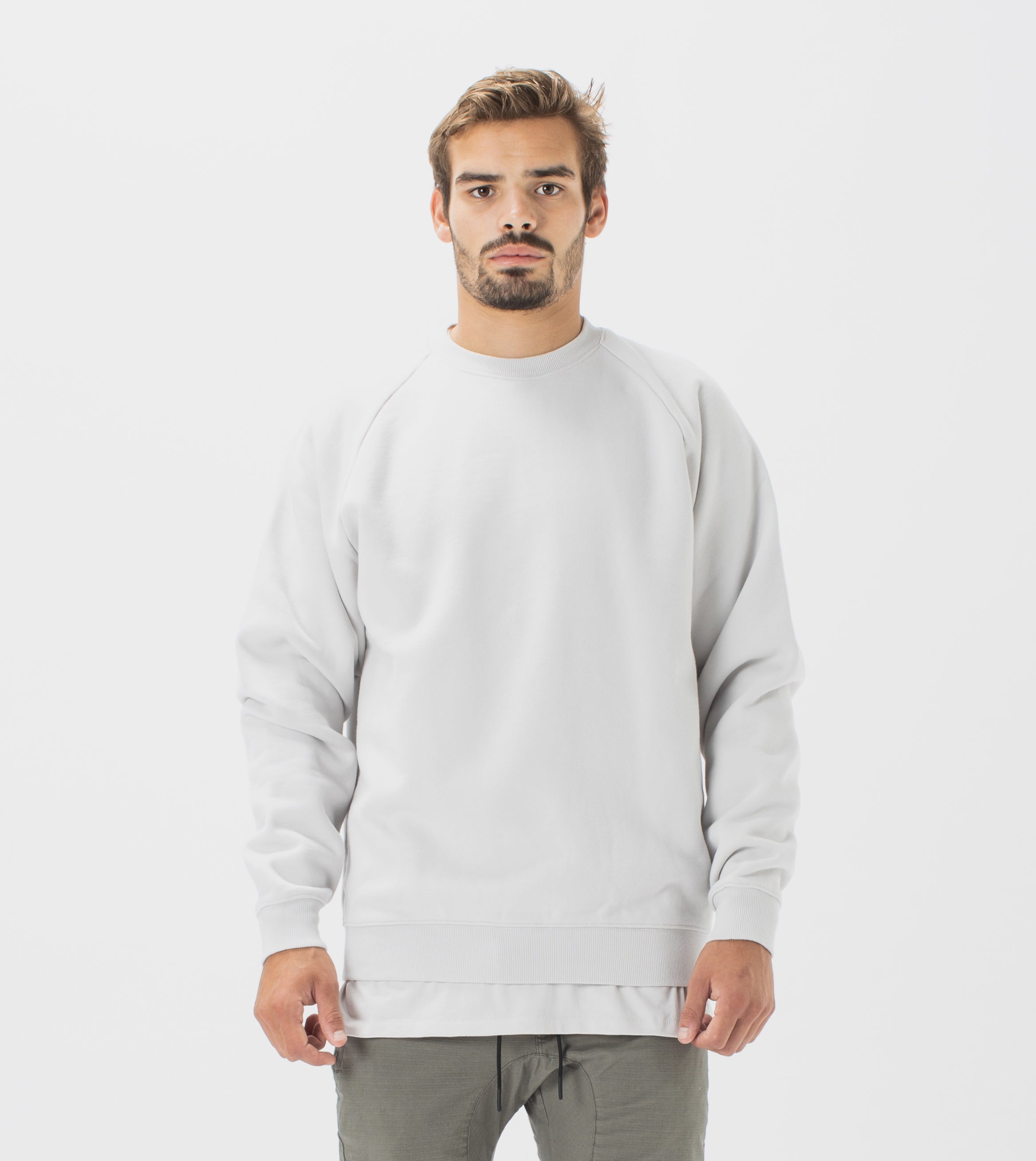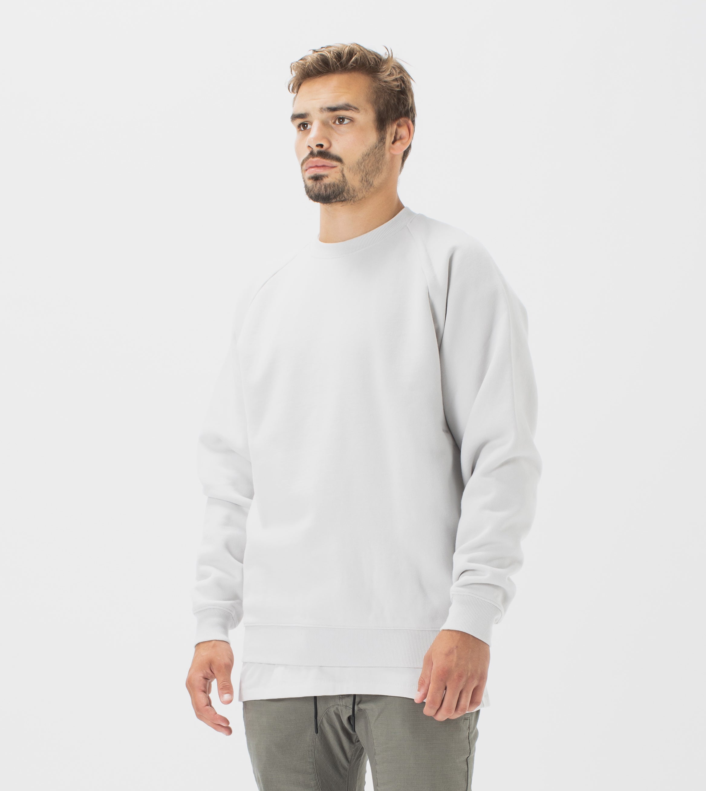 The ZANEROBE Lowgo Raglan Crew Sweat in Frost - Signature style with fleece fabrication. We wear with a pair of Kyoto Chinos or Signature  Sureshot Joggers.