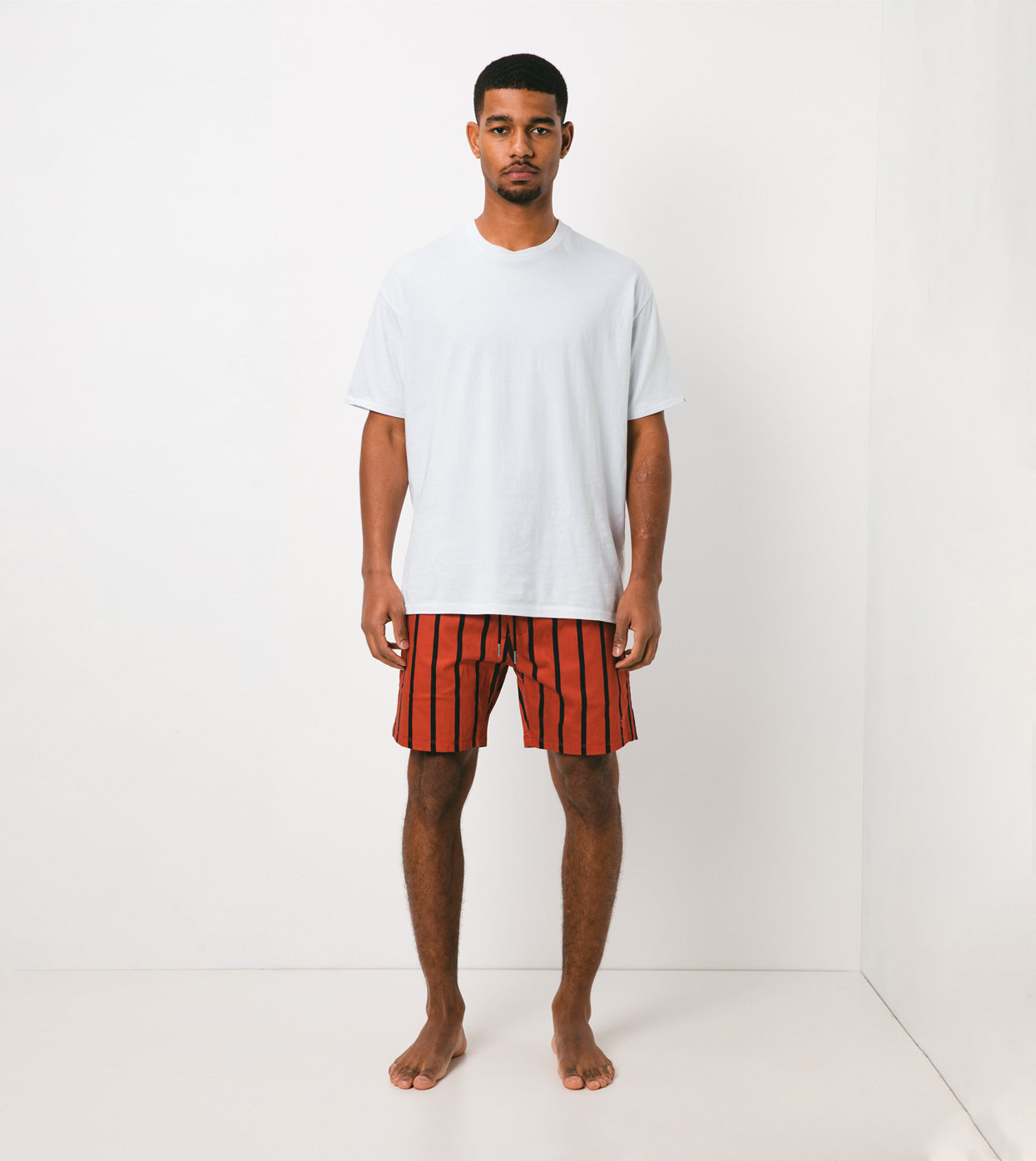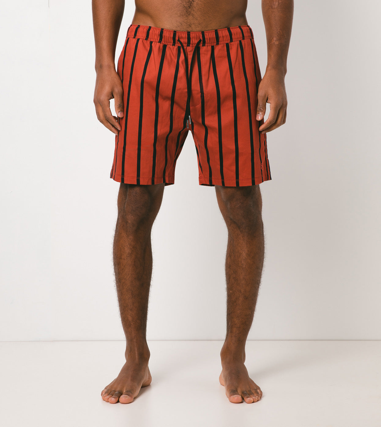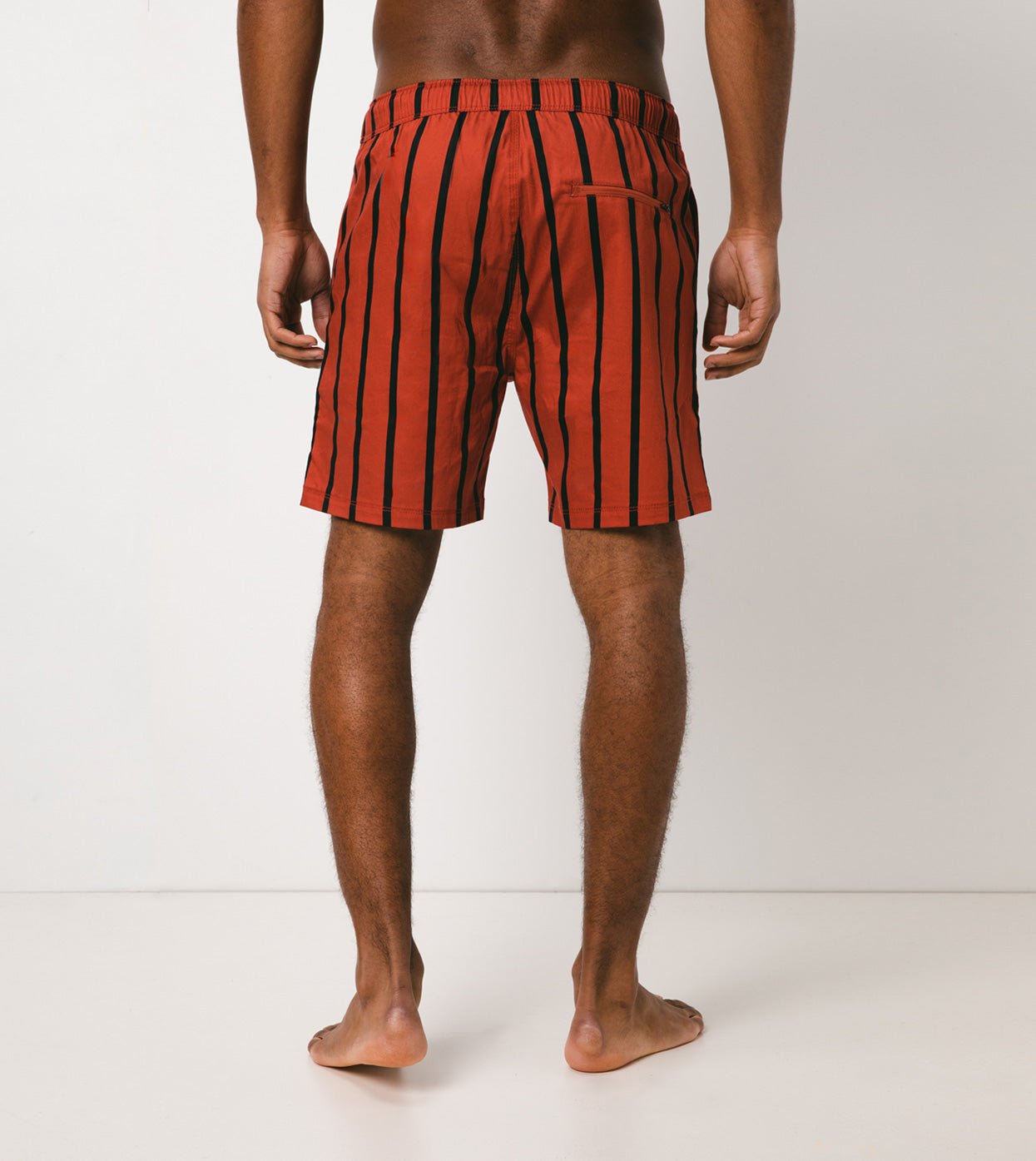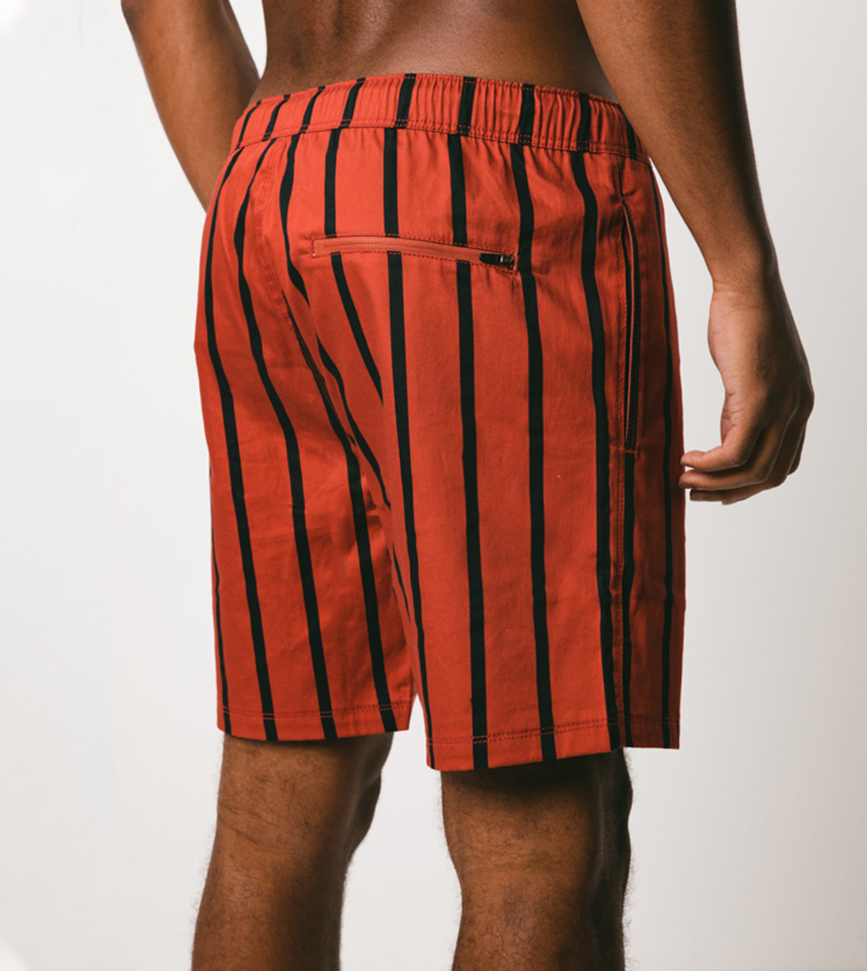 The ZANEROBE Pinstripe Laguna Short in Clay/Vintage Black - Regular fit, constructed from 54% Cotton, 40% Nylon & 6% Elastane. Features vertical stripe pattern, elastic waistband, drawcord, mesh lined side pockets, back pocket with zip closure & embroidered logo detail.