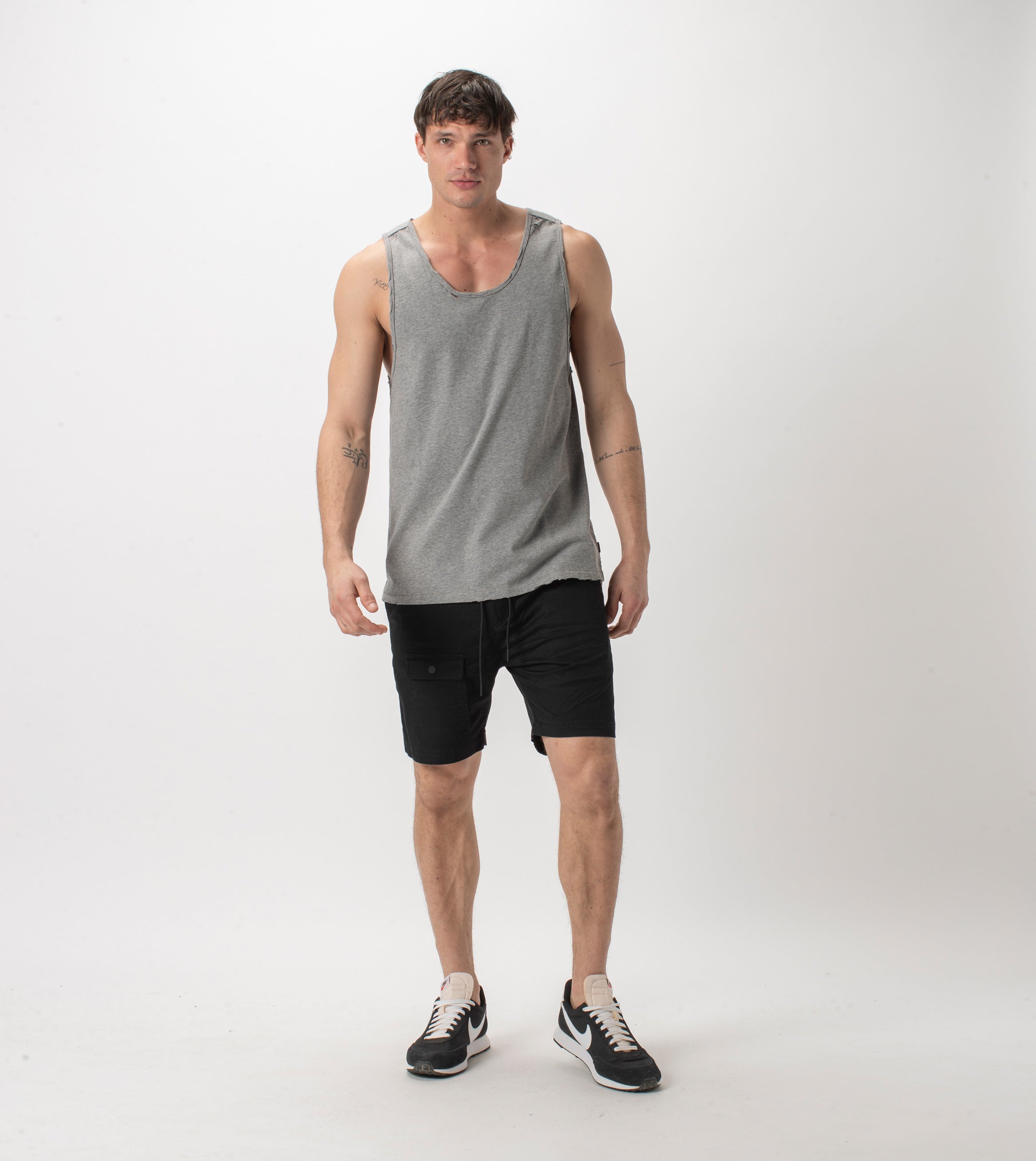 The ZANEROBE Ripped Rugger Tank in Dk Grey Marle - Signature relaxed Tee, we wear with our classic Sureshot Fleece Joggers.