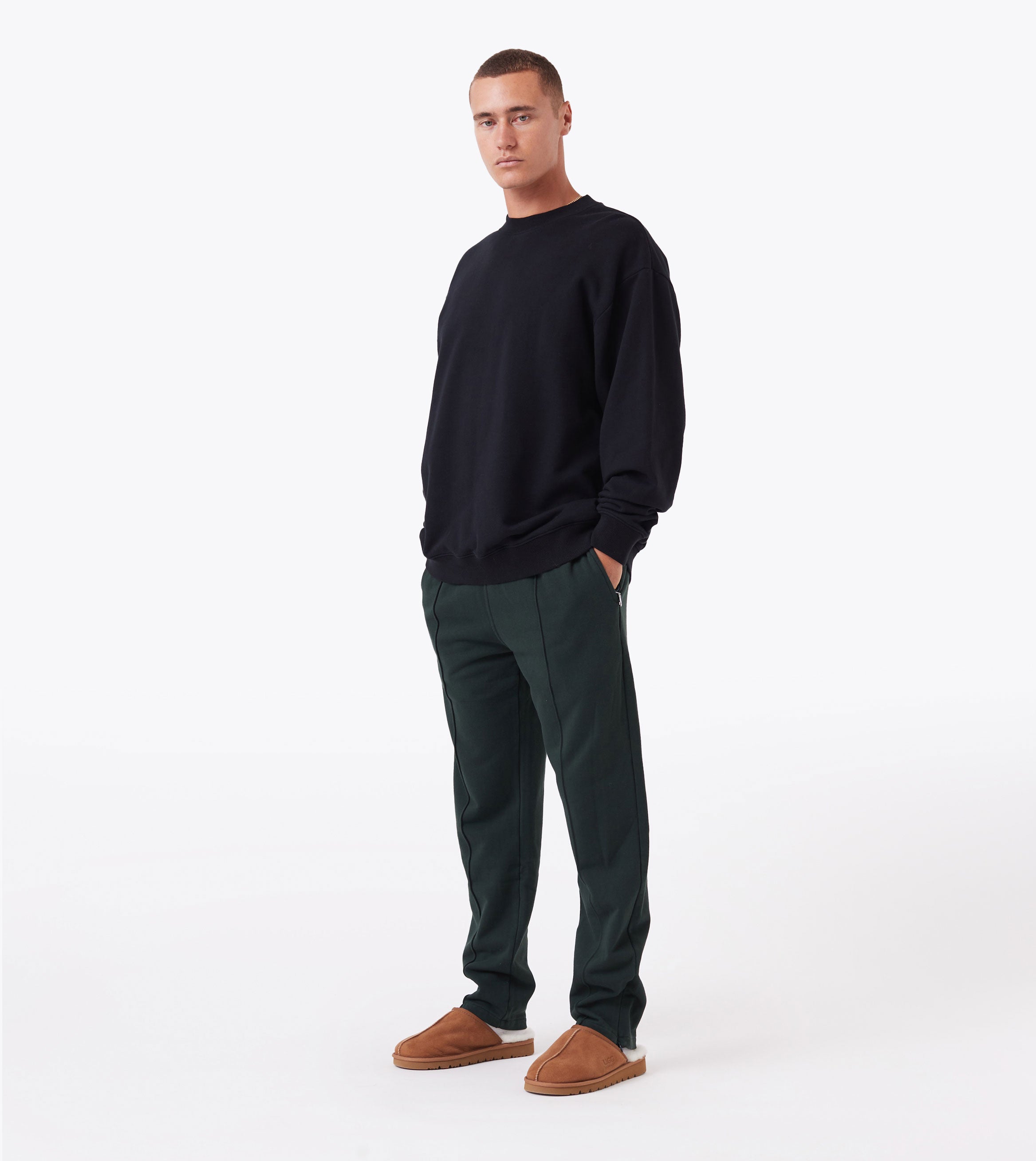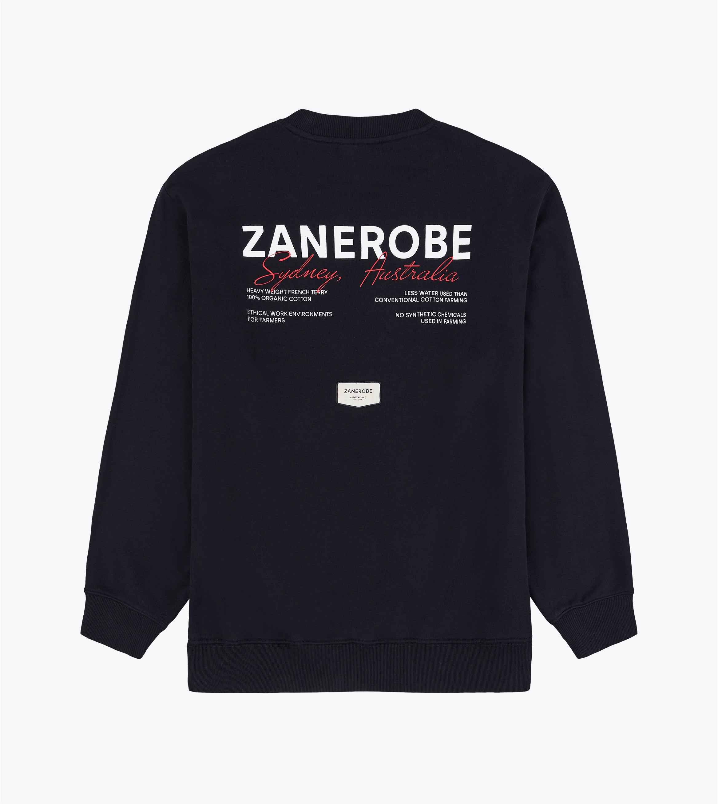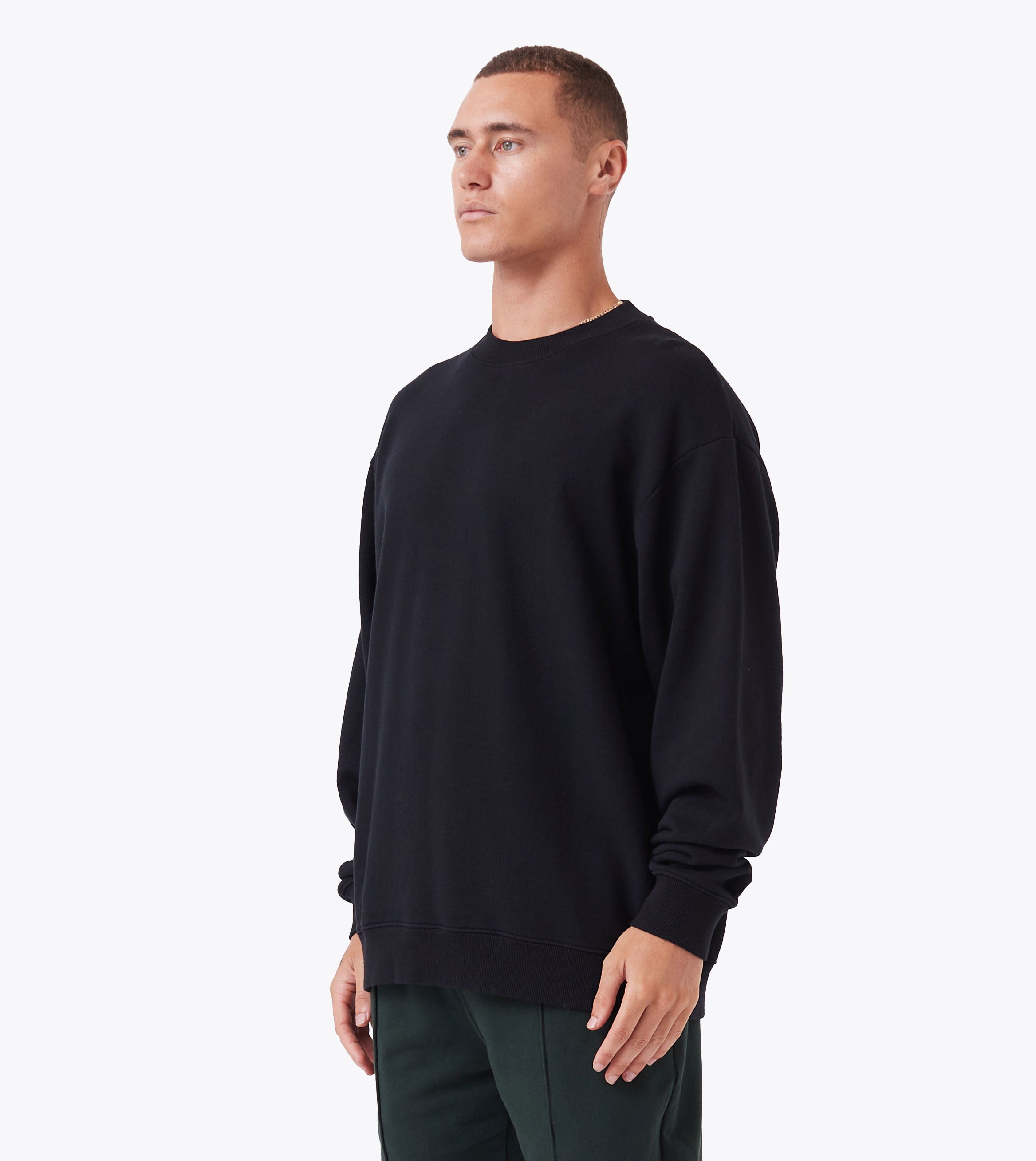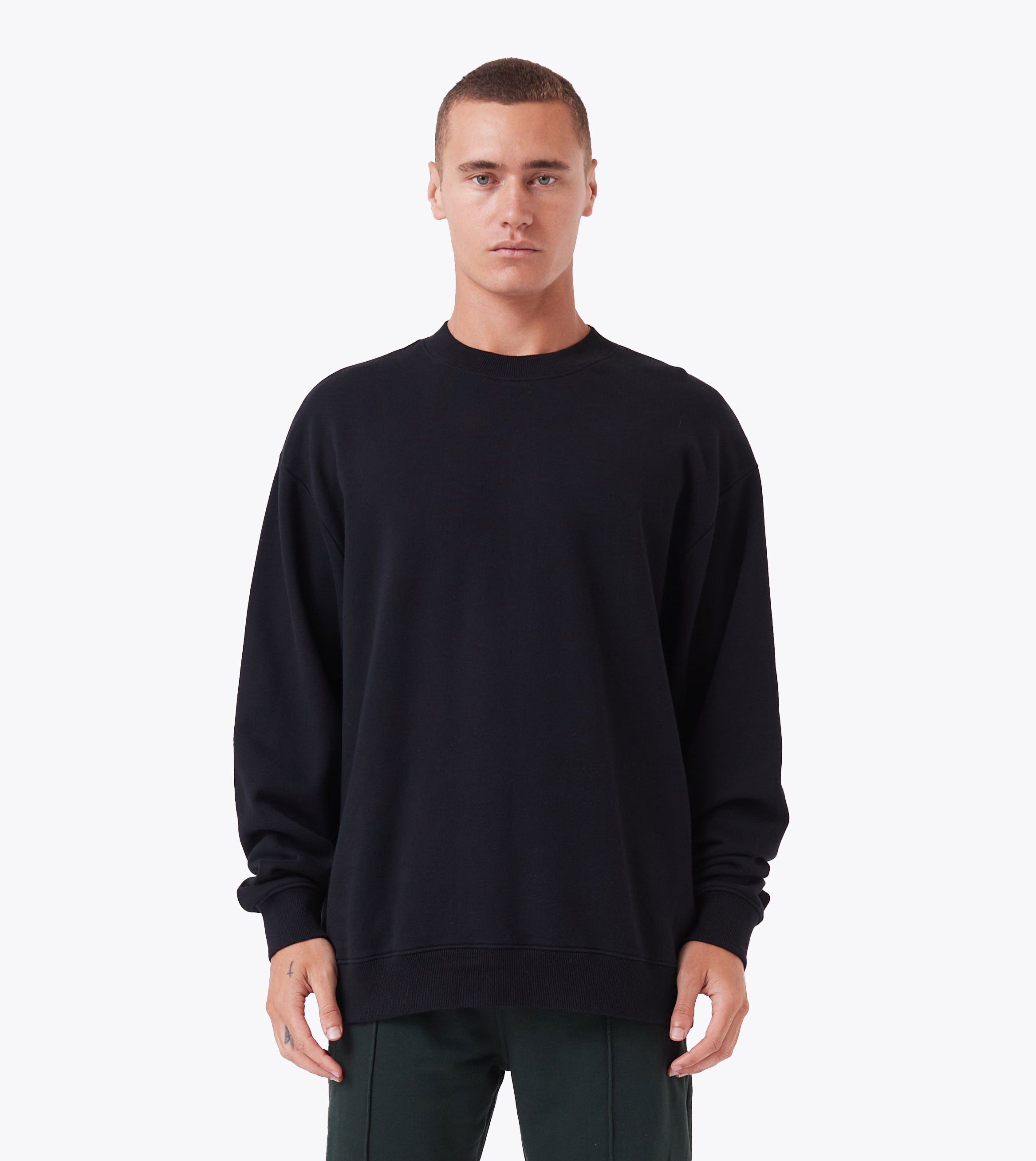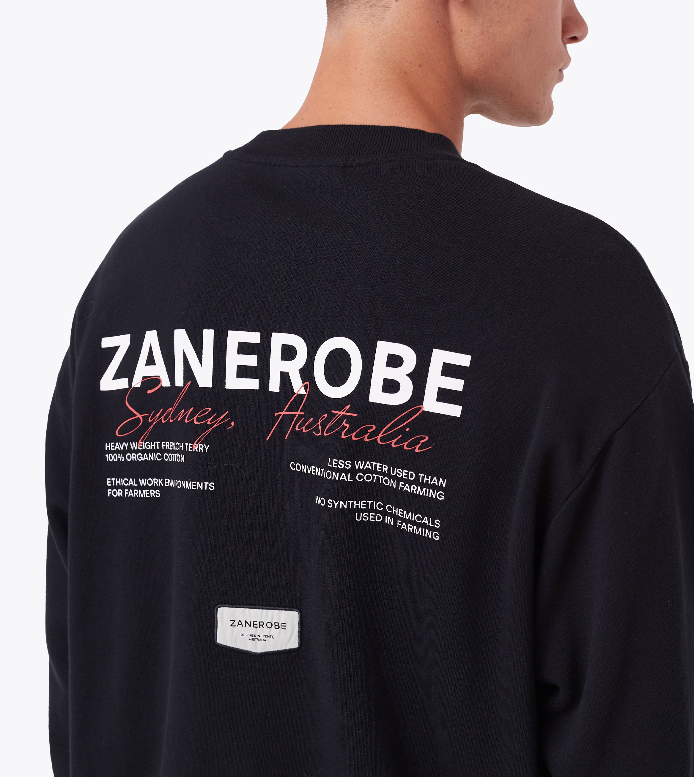 The ZANEROBE Script Orgo Crewsweat Black is made from 100% Organic Cotton French Terry, offering a modern and comfortable look with its drop shoulder, oversized fit, and relaxed hem. For a clean and effortless look, pair it with some relaxed fit Box pants.