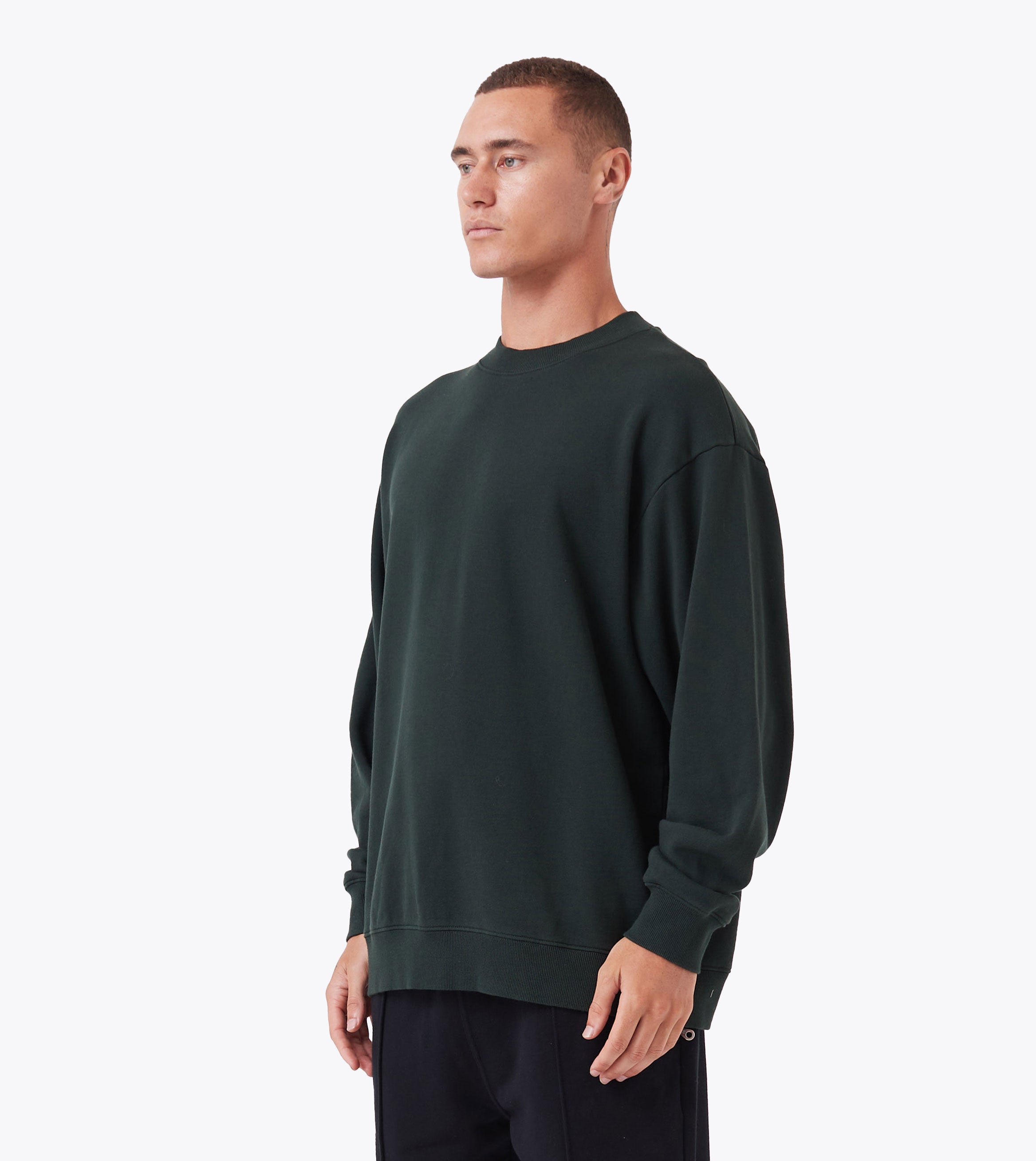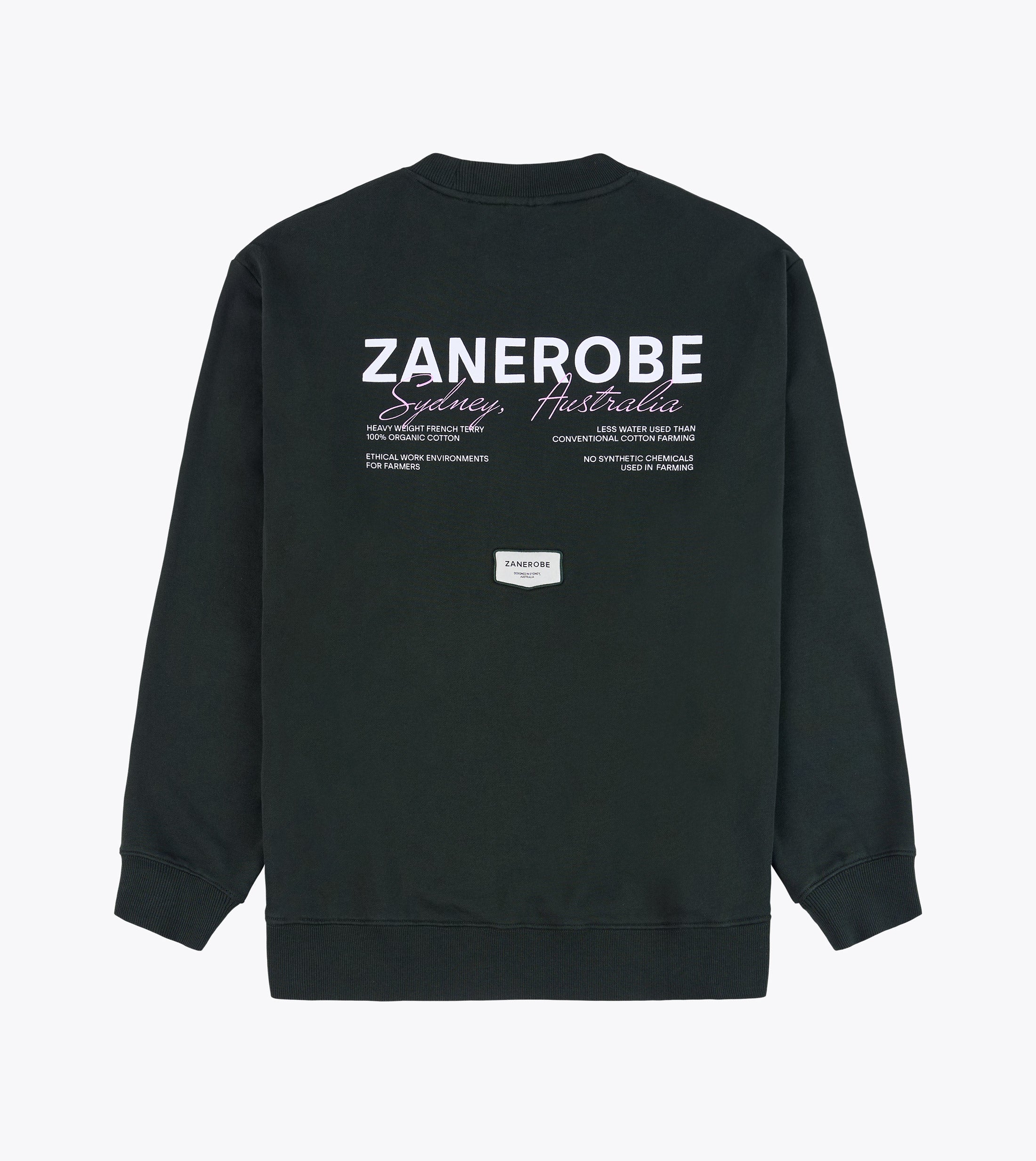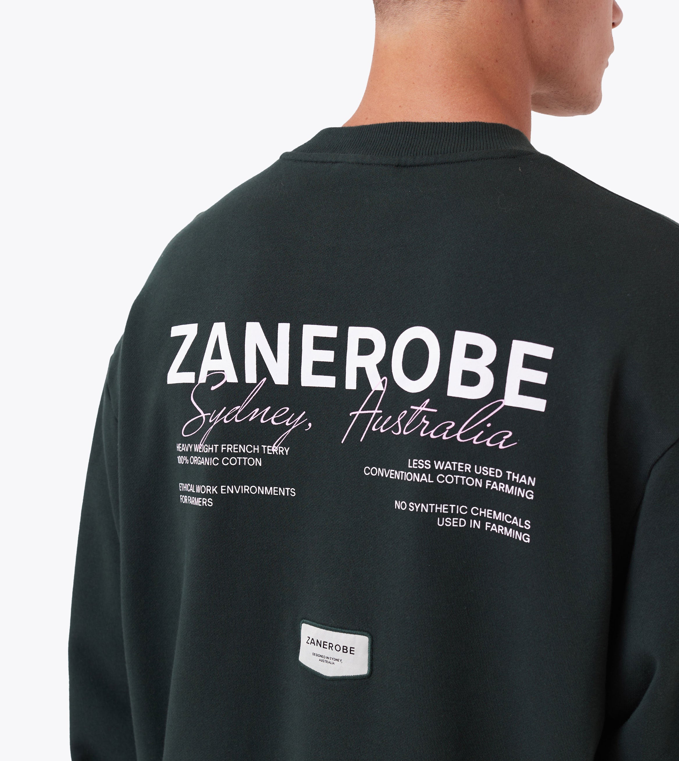 Crafted from 100% Organic Cotton French Terry, the ZANEROBE Script Orgo Crewsweat in Forest guarantees a modern and relaxed look with its drop shoulder, oversized fit, and relaxed hem. The sustainable fabric choice not only ensures a feeling of luxury but also promotes environmental consciousness. For an effortlessly look, simply pair it with the relaxed fit Box pants.