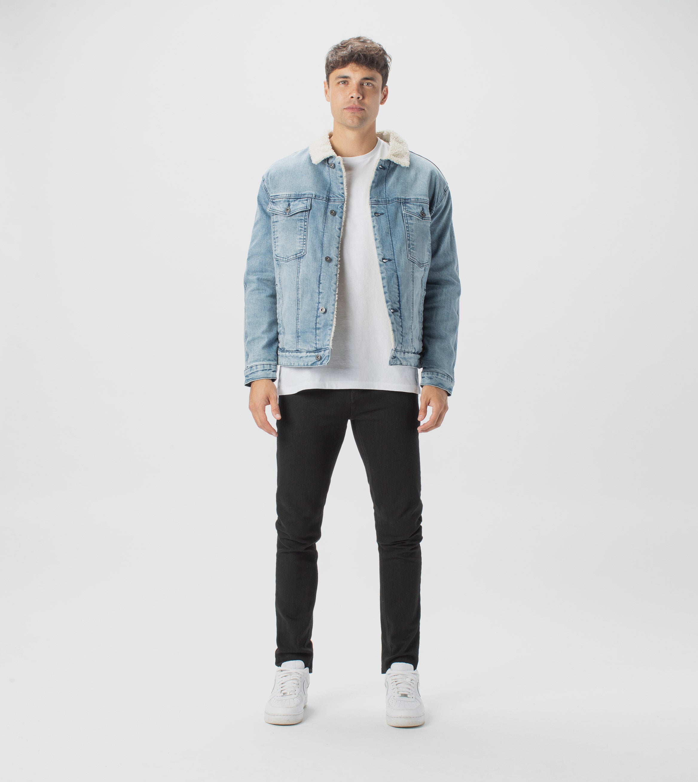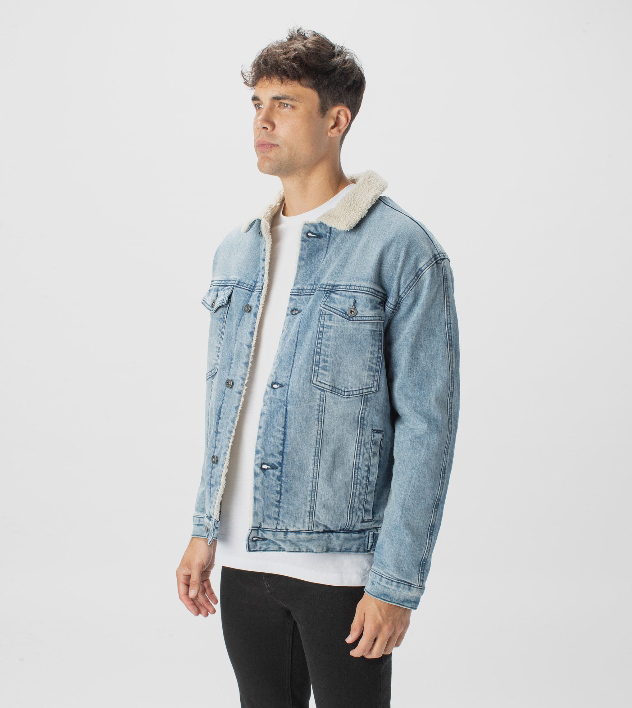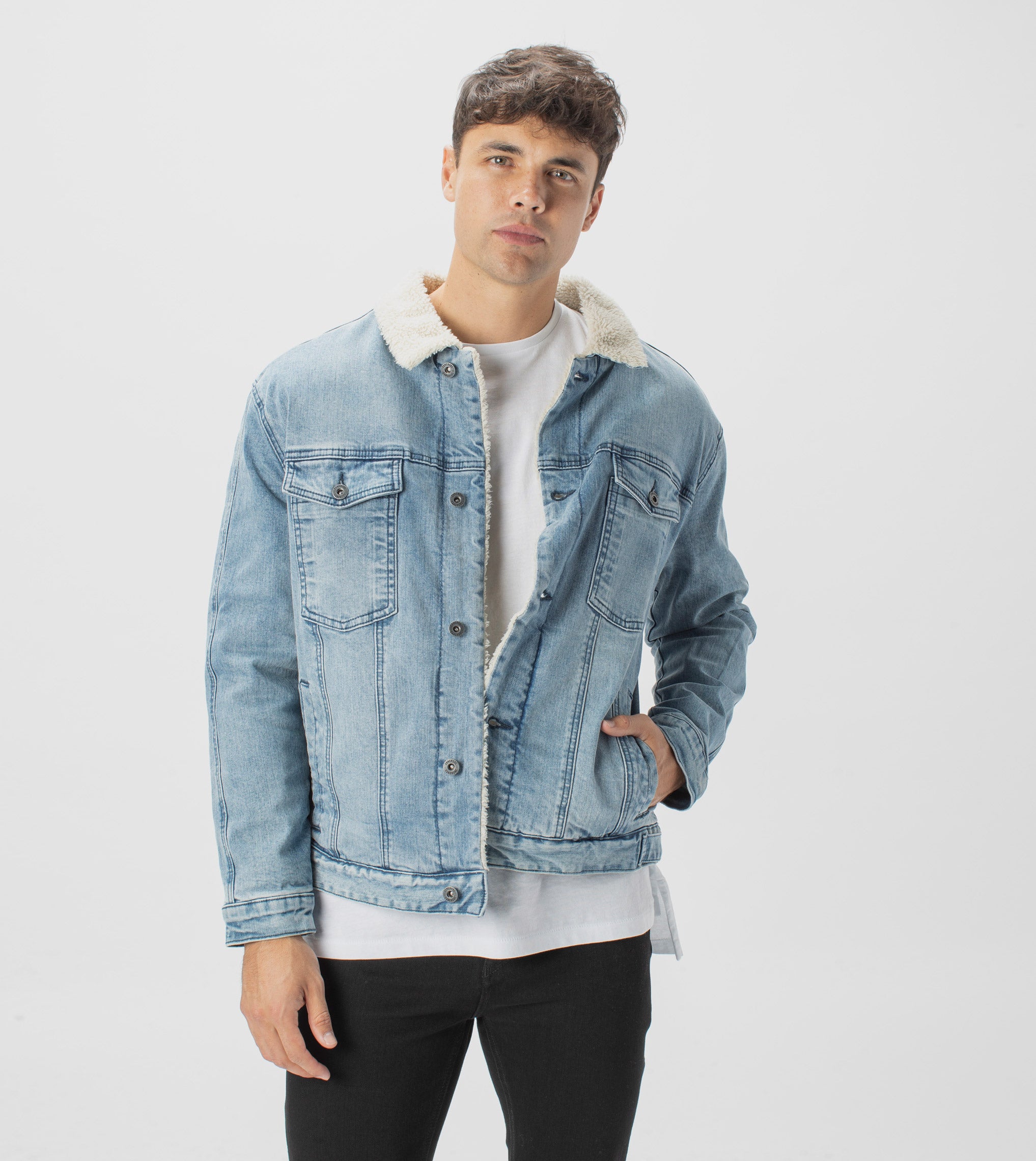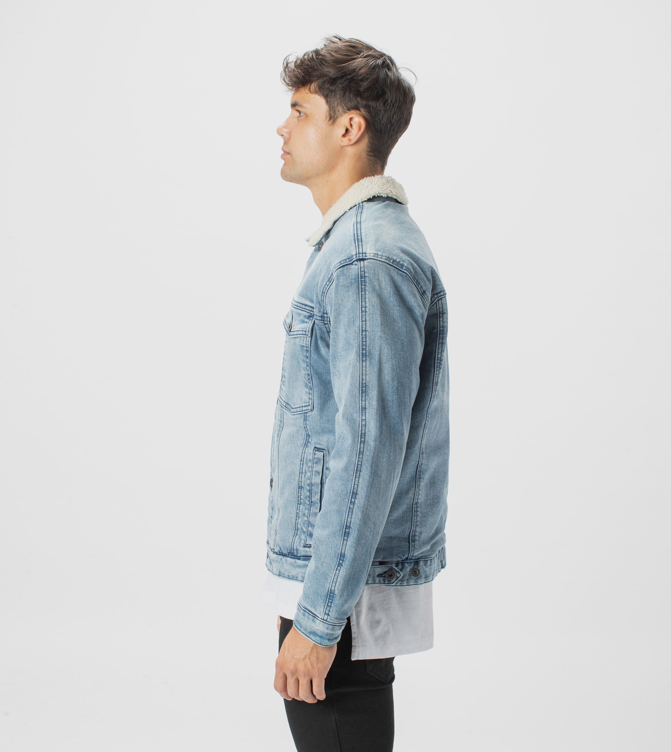 • Rigid denim fabrication - 100% Cotton Denim fully lined 100% Polyester Sherpa