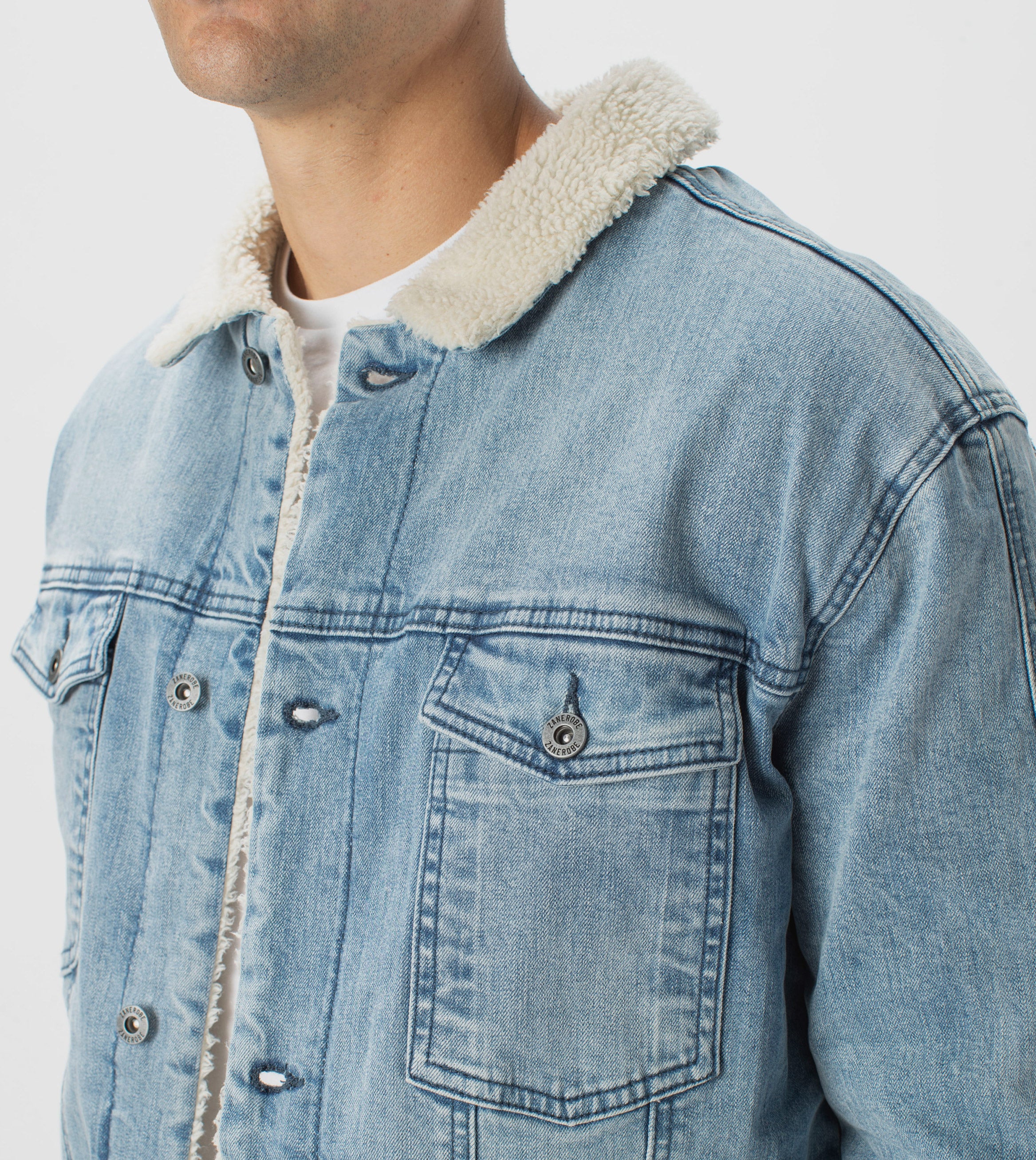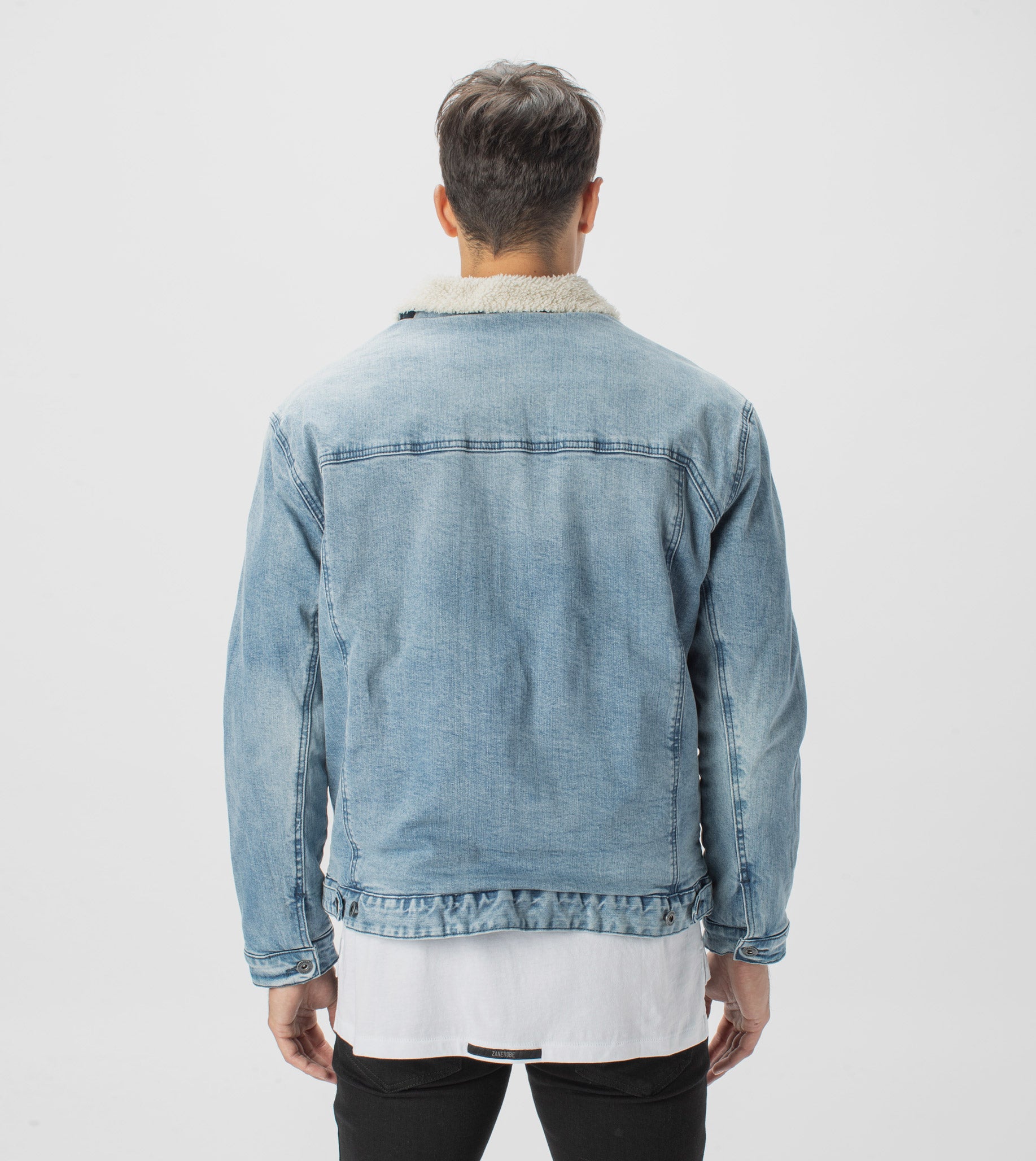 The ZANEROBE Sherpa Denim Jacket in Mineral Blue - We wear with our classic Sureshot Fleece Joggers.