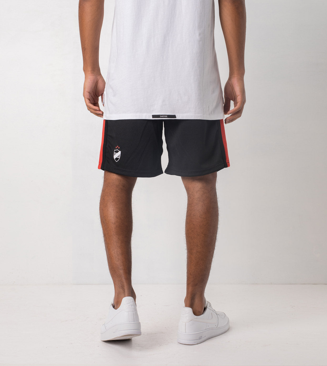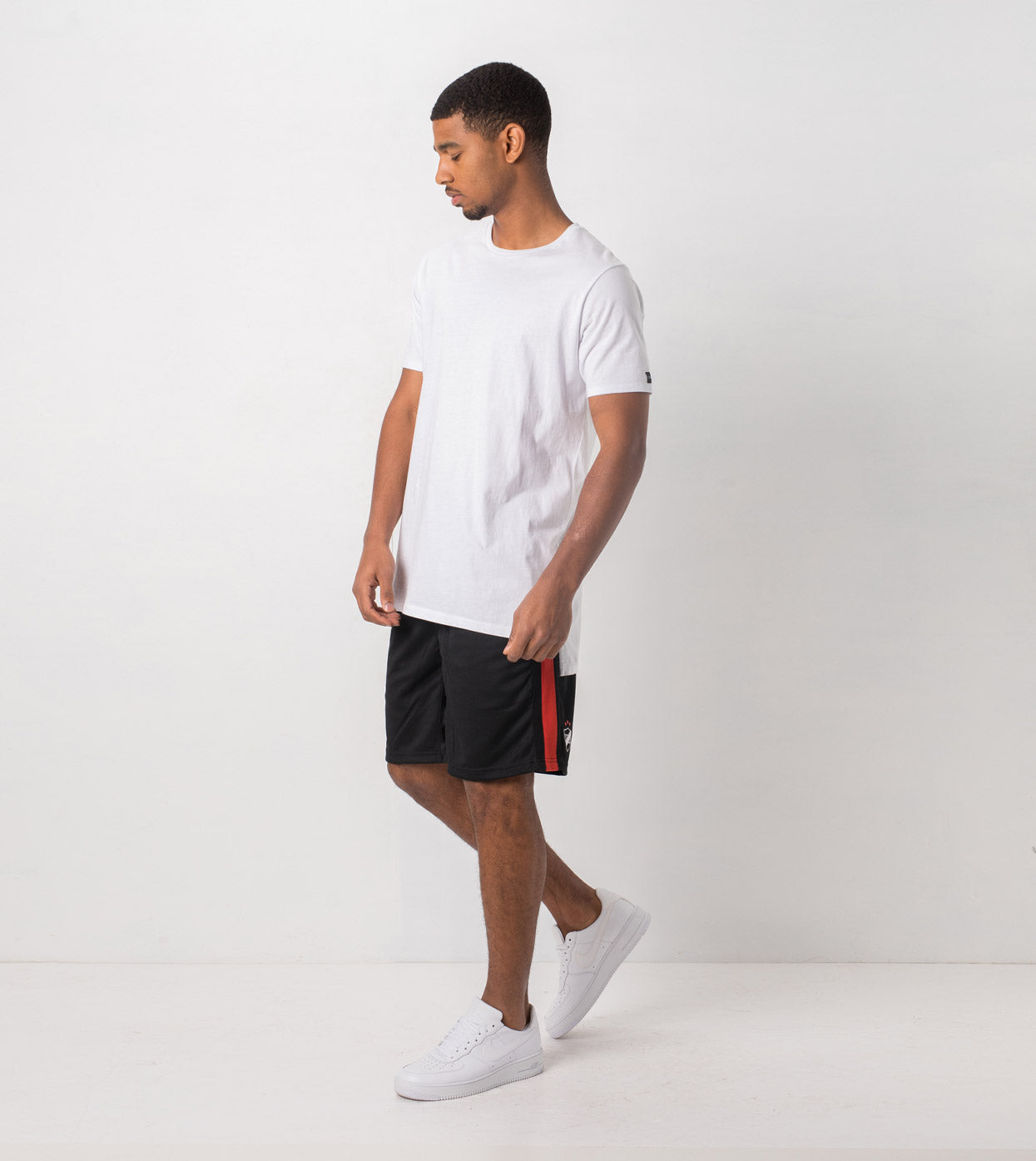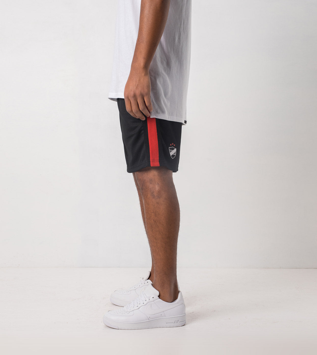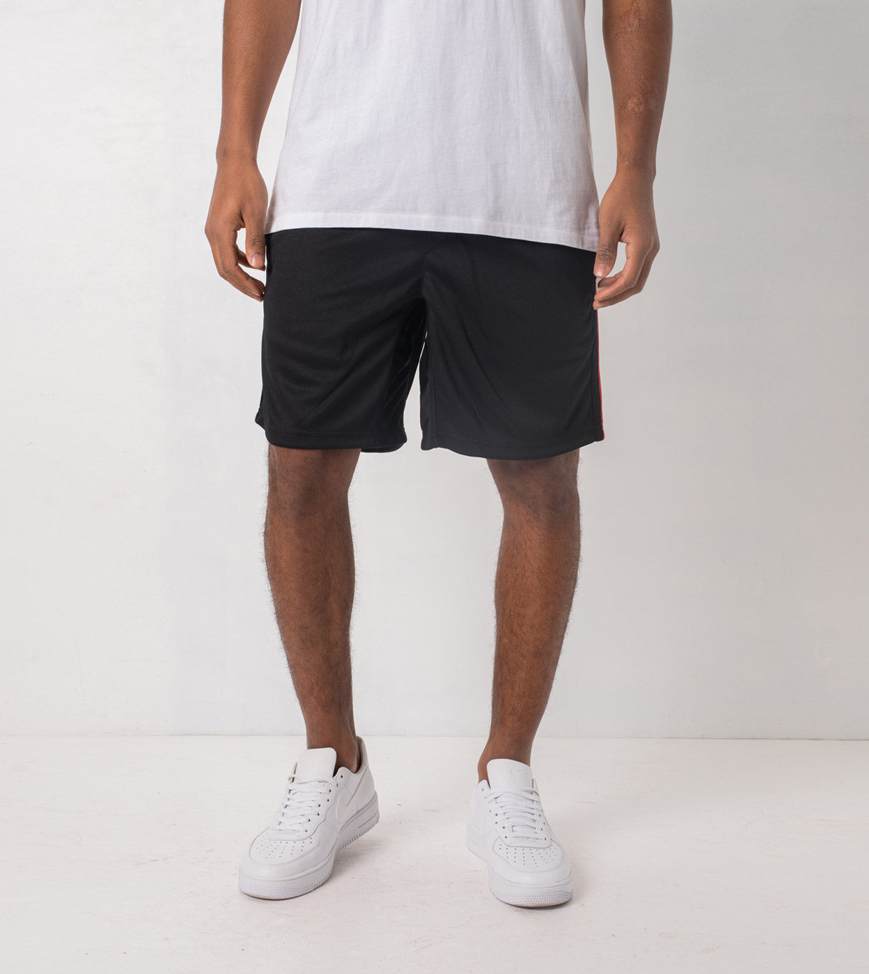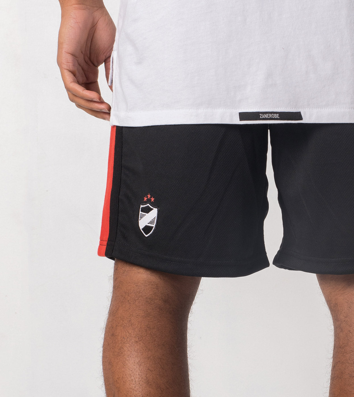 The ZANEROBE Sideline Short in Black/Vintage Red - polyester mesh fabric, relaxed fit, concealed auto lock zip side pockets, side stripe tape detail, shield embroidered applique patch, drawstring waist and sporty tech trims. We wear with our signature Flintlock Tee.