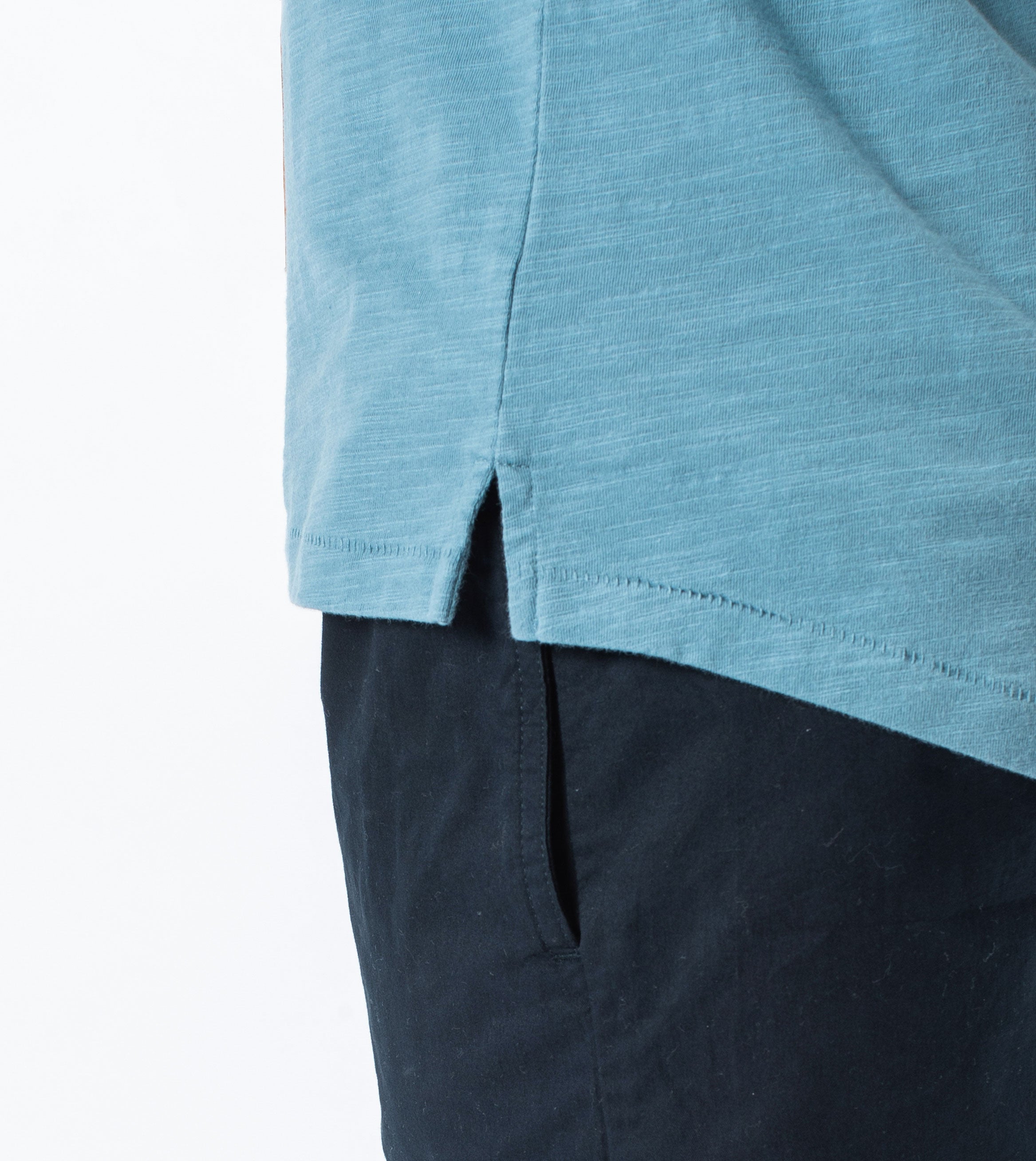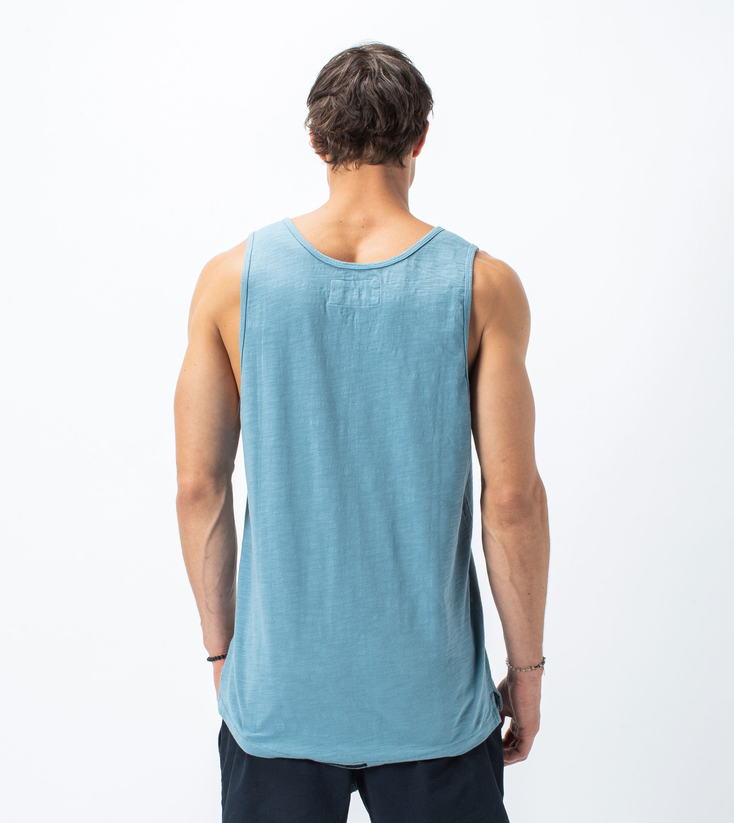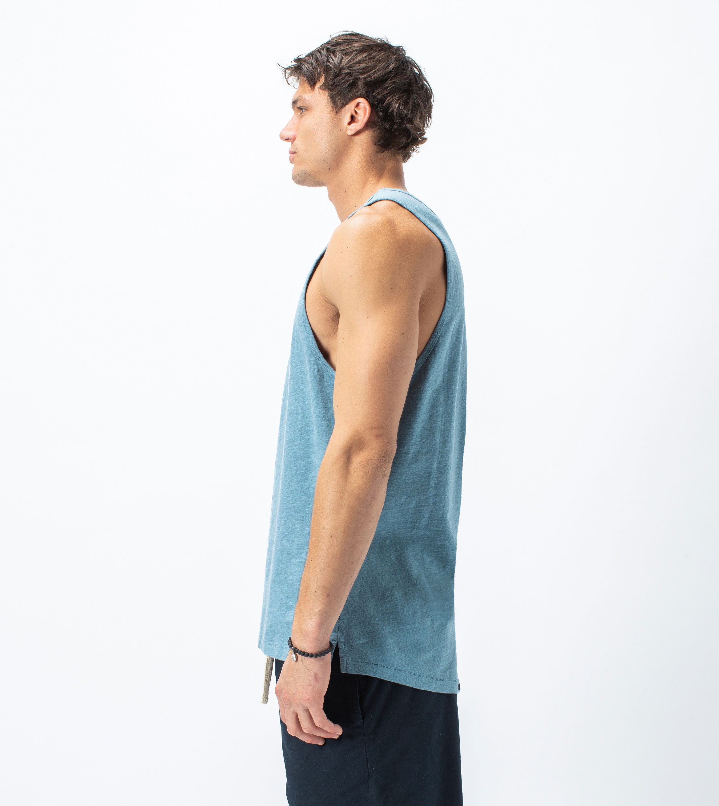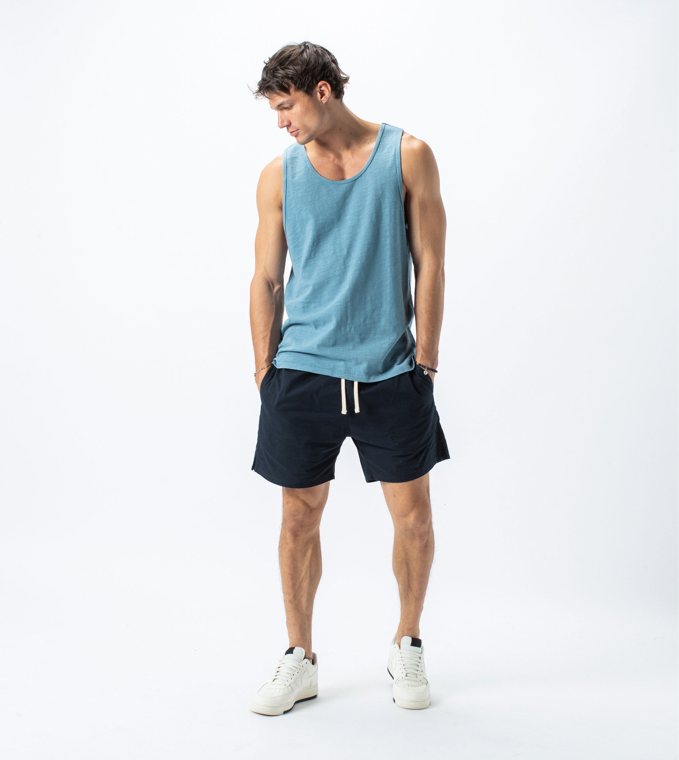 The ZANEROBE Slub Rugger Tank in Ocean - constructed in heavyweight 100% cotton jersey textured slub, features regular length front with extended curved back hem, side vent & finished with self binding. We wear with the ZANEROBE Zephyr Shorts.