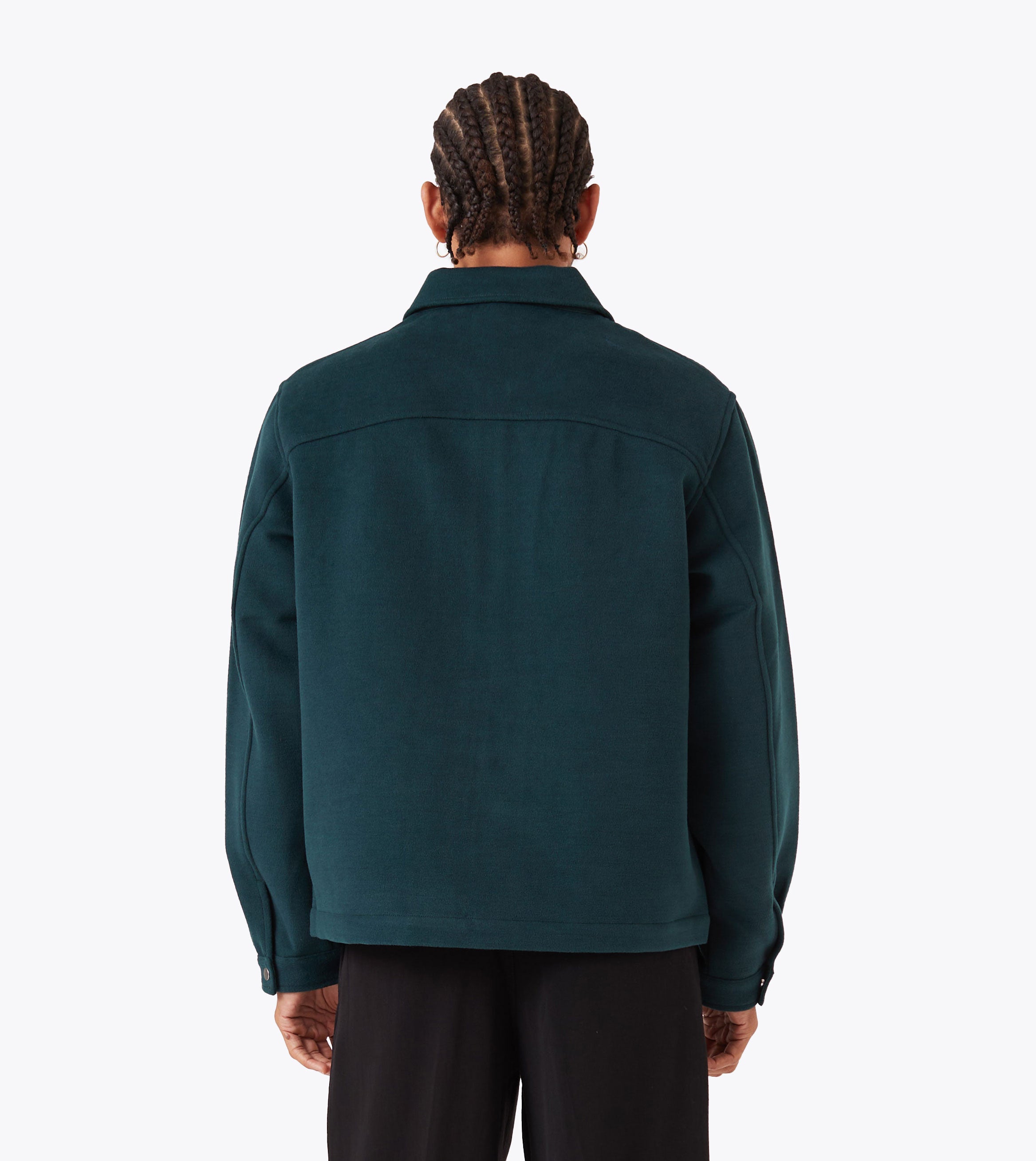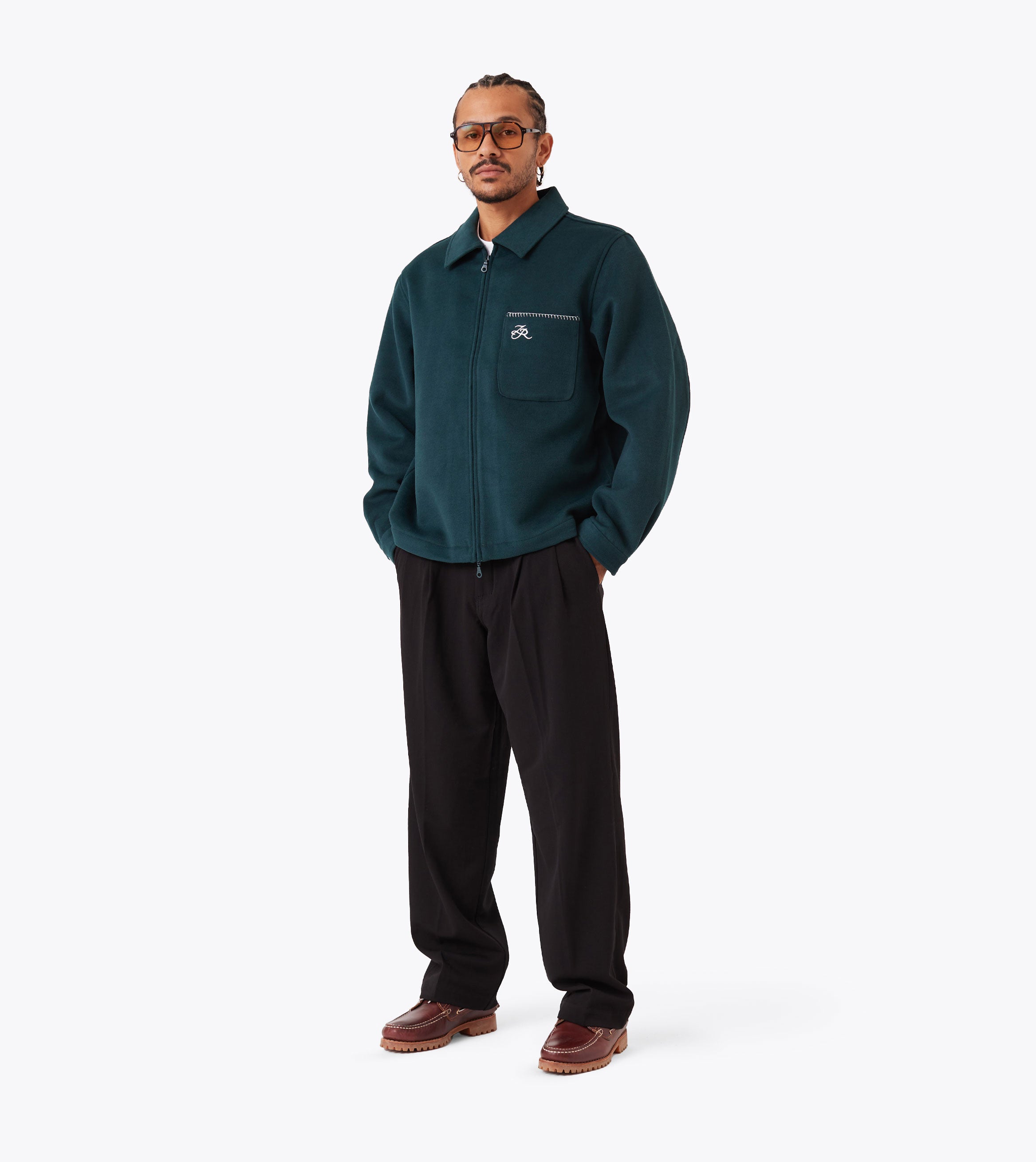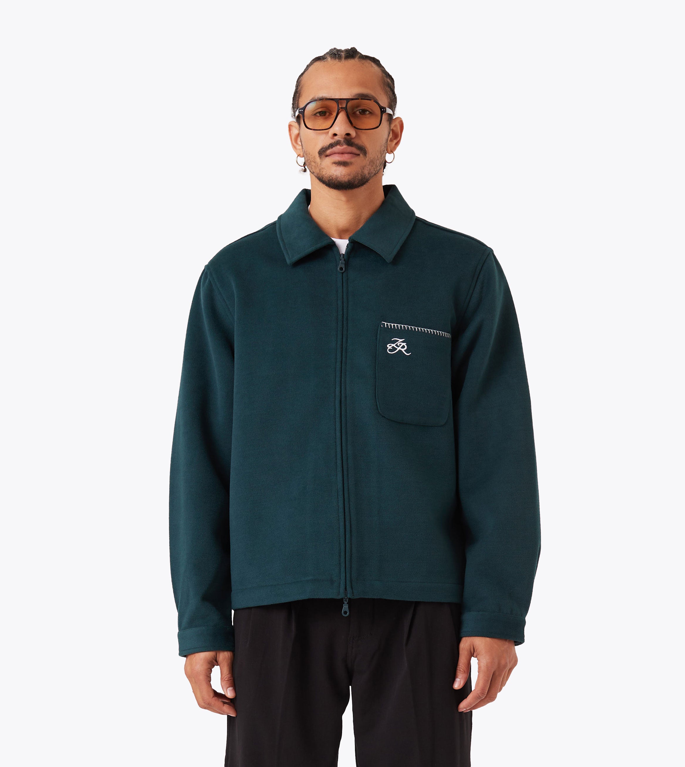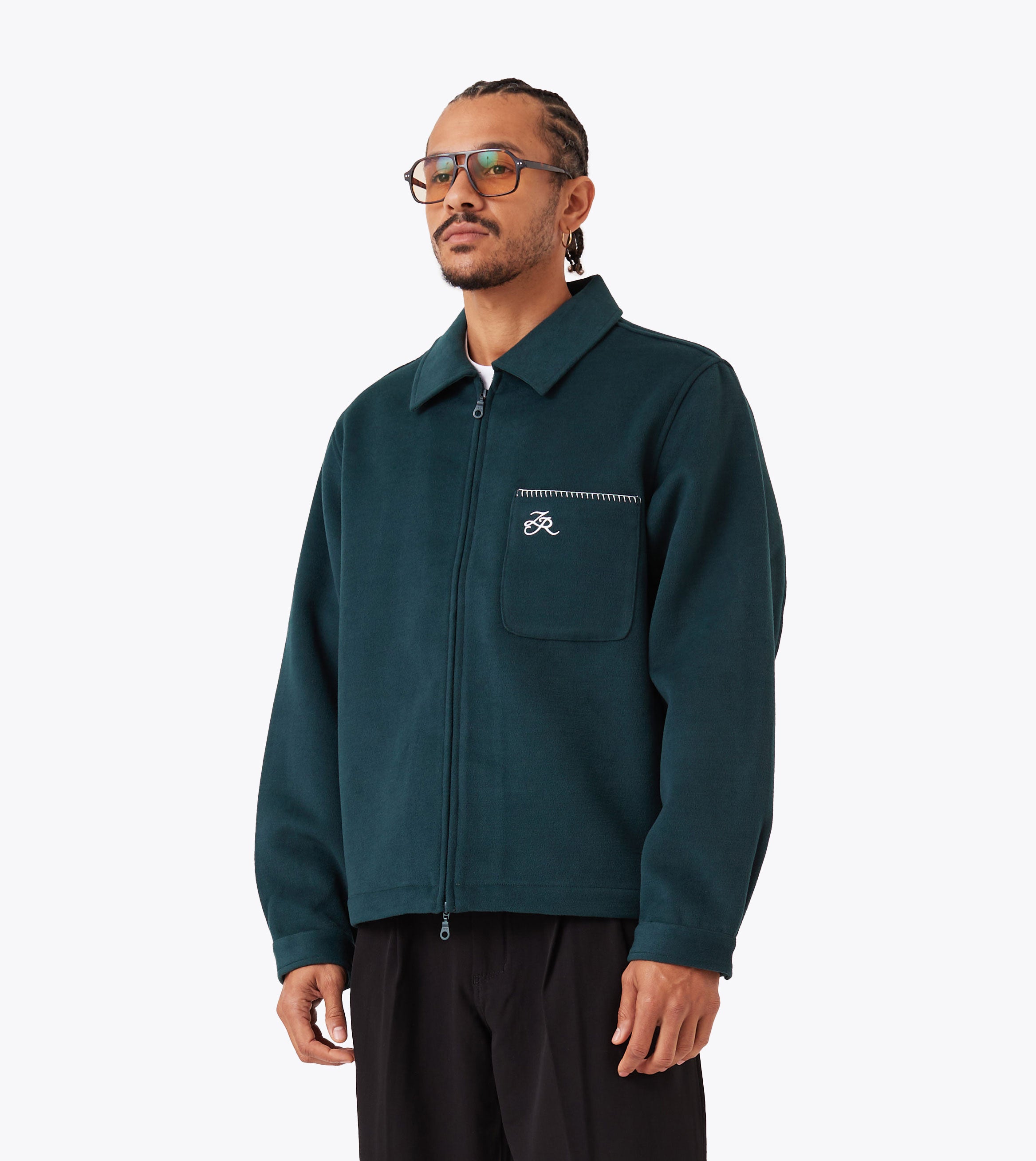 The ZANEROBE Stitched Overshirt in Forest is a sleek and modern take on classic layering. Crafted from a durable 80% polyester and 20% rayon melton fabric, it features a concealed double-ended zipper at the front for a clean look. The patch pocket with blanket stitch and ZR emblem embroidery adds a touch of detail, while the signature curved back yoke and cropped length enhance its contemporary edge. Finished with a standard collar, this over shirt offers both style and function.