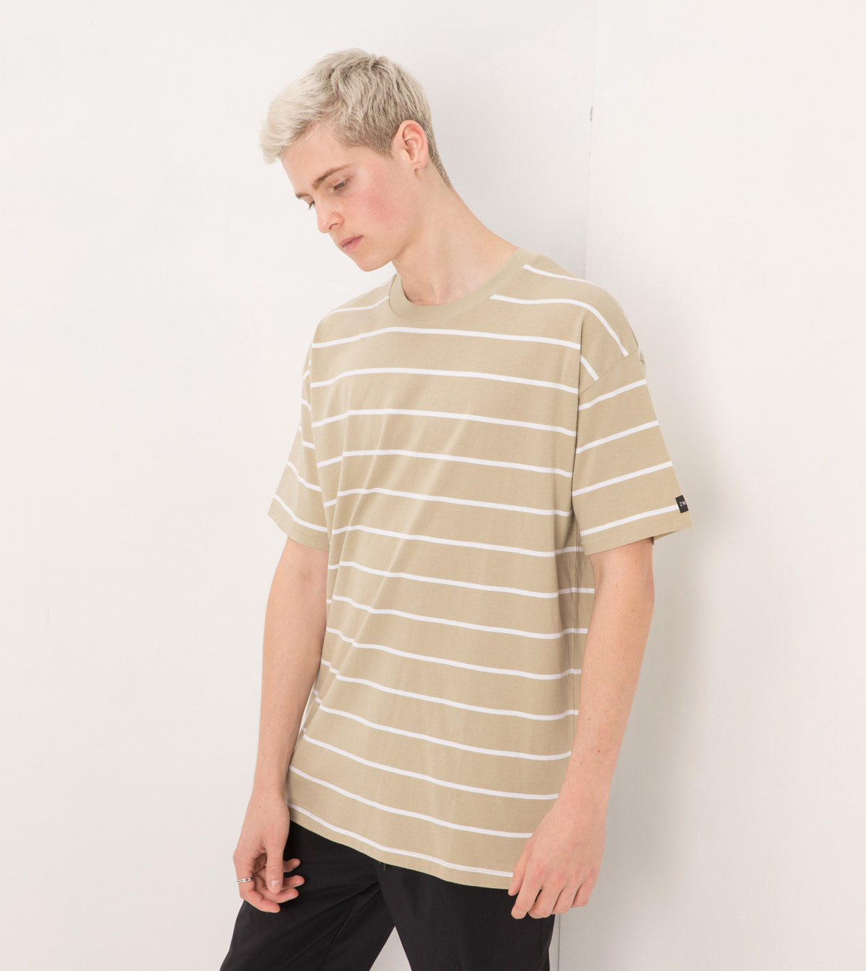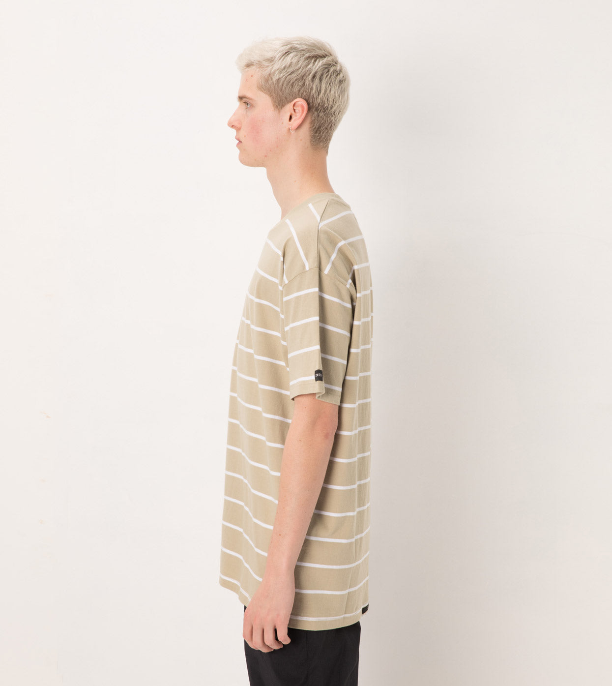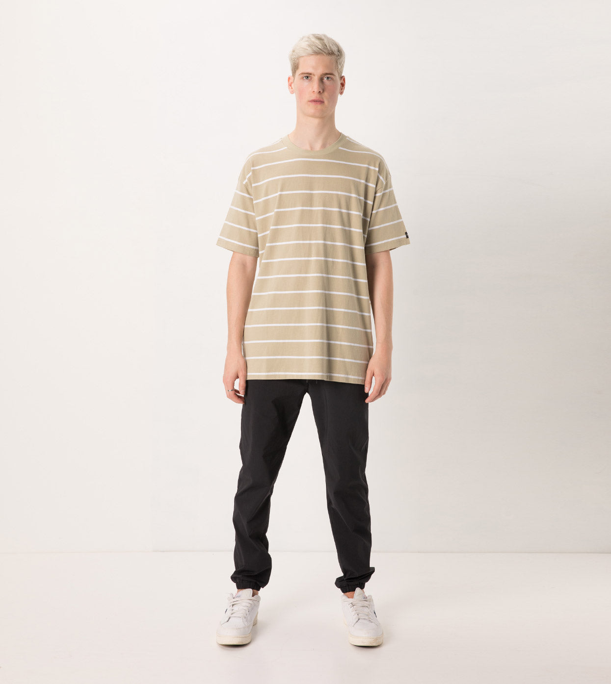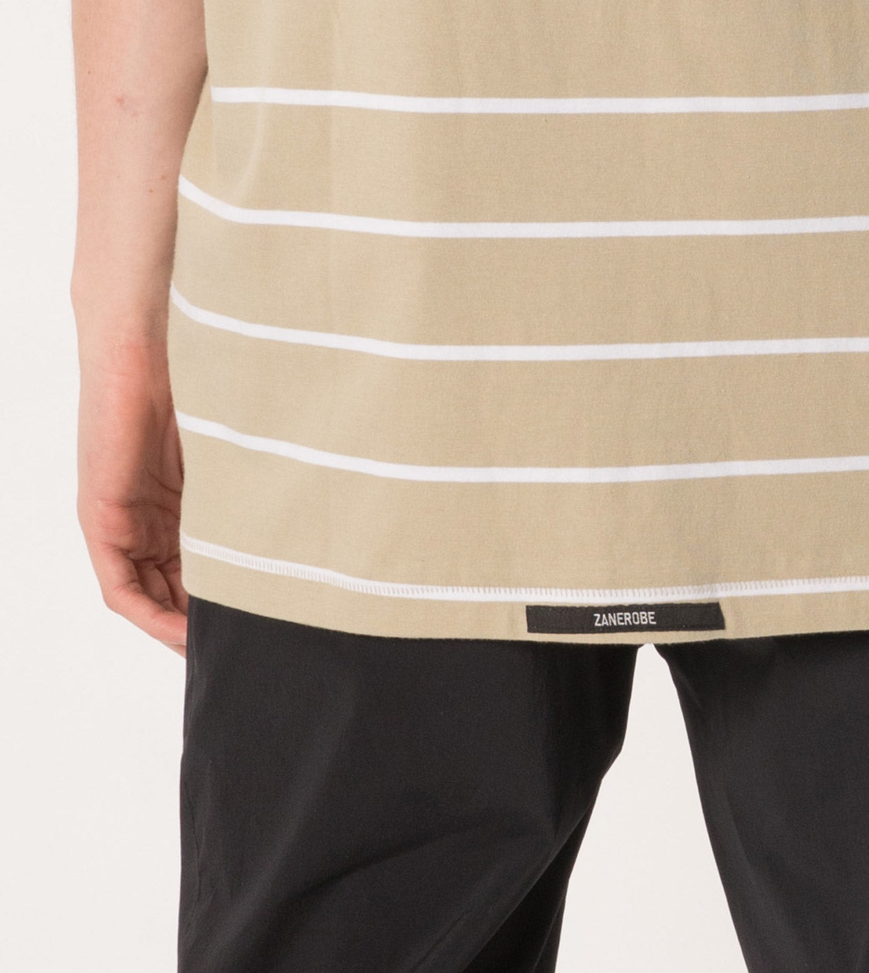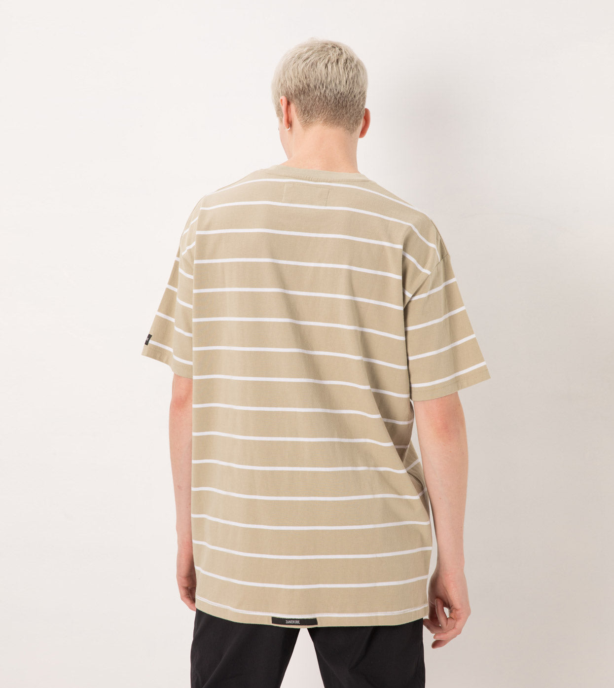 The ZANEROBE Stripe Box Tee in Moss/White - constructed in heavyweight jersey, boxy fit, straight hem & slightly thicker rib neckline. We wear with our Jumpshot Joggers.