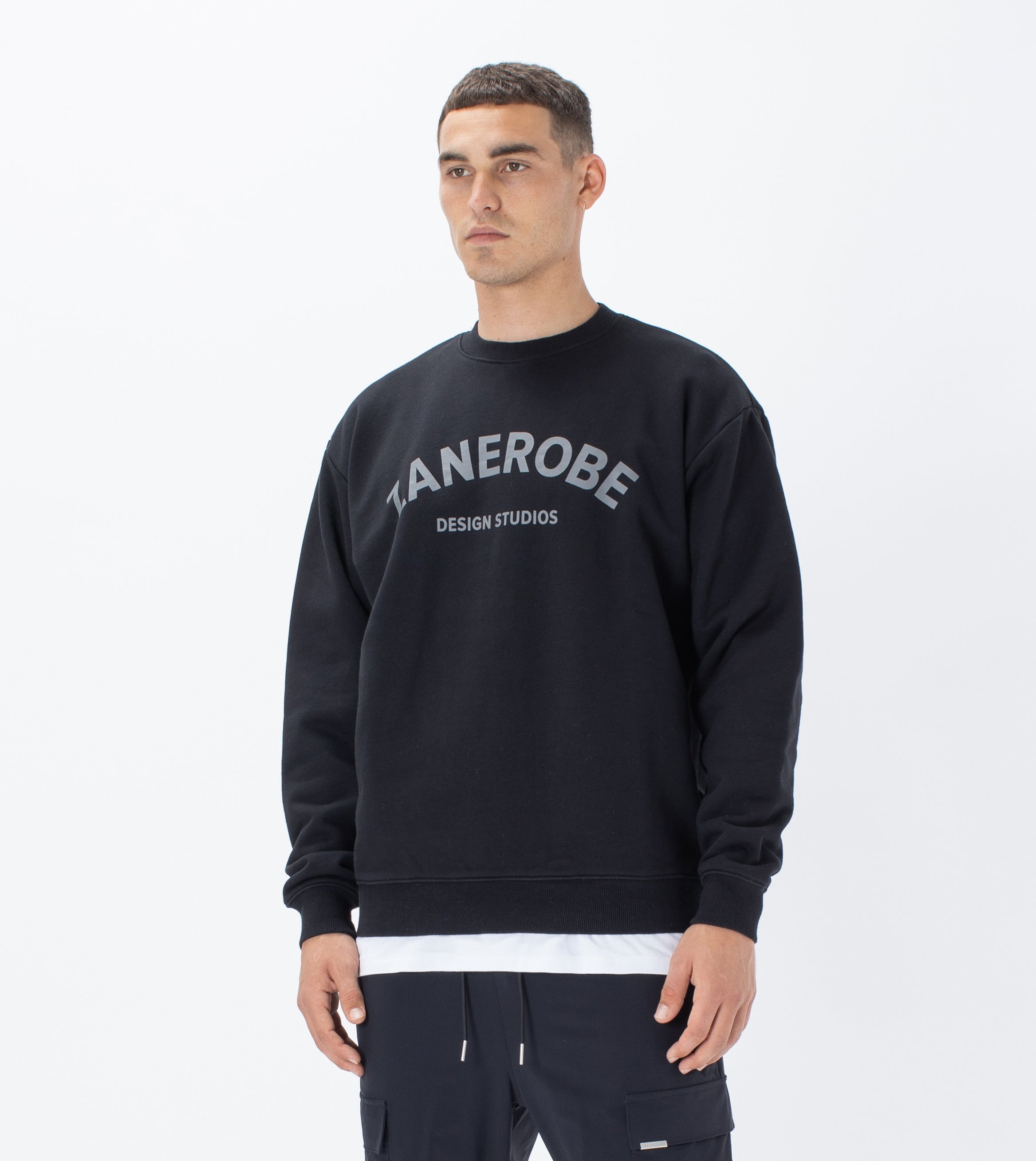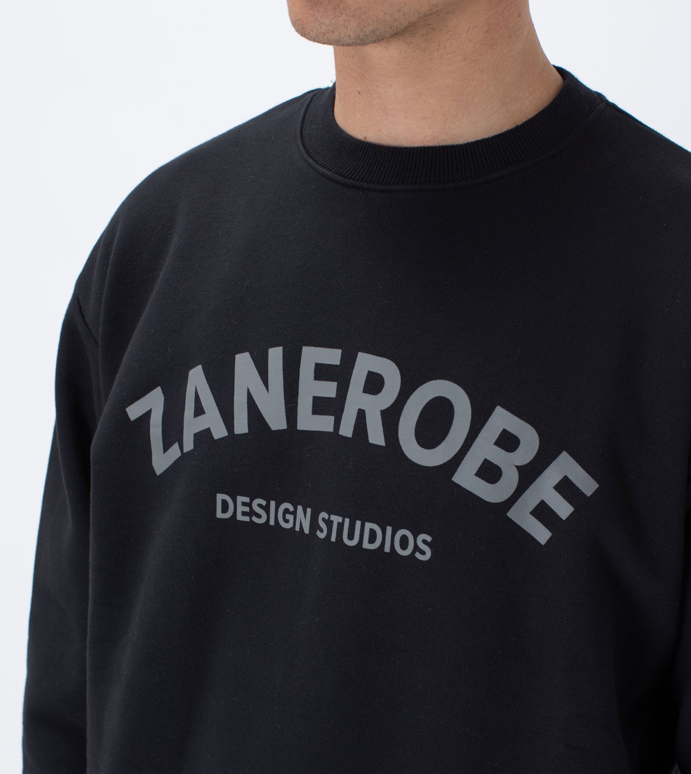 The ZANEROBE Studios Lowgo Crew Sweat in Black - Signature style with fleece fabrication. We wear with our classic Sureshot Jogger.