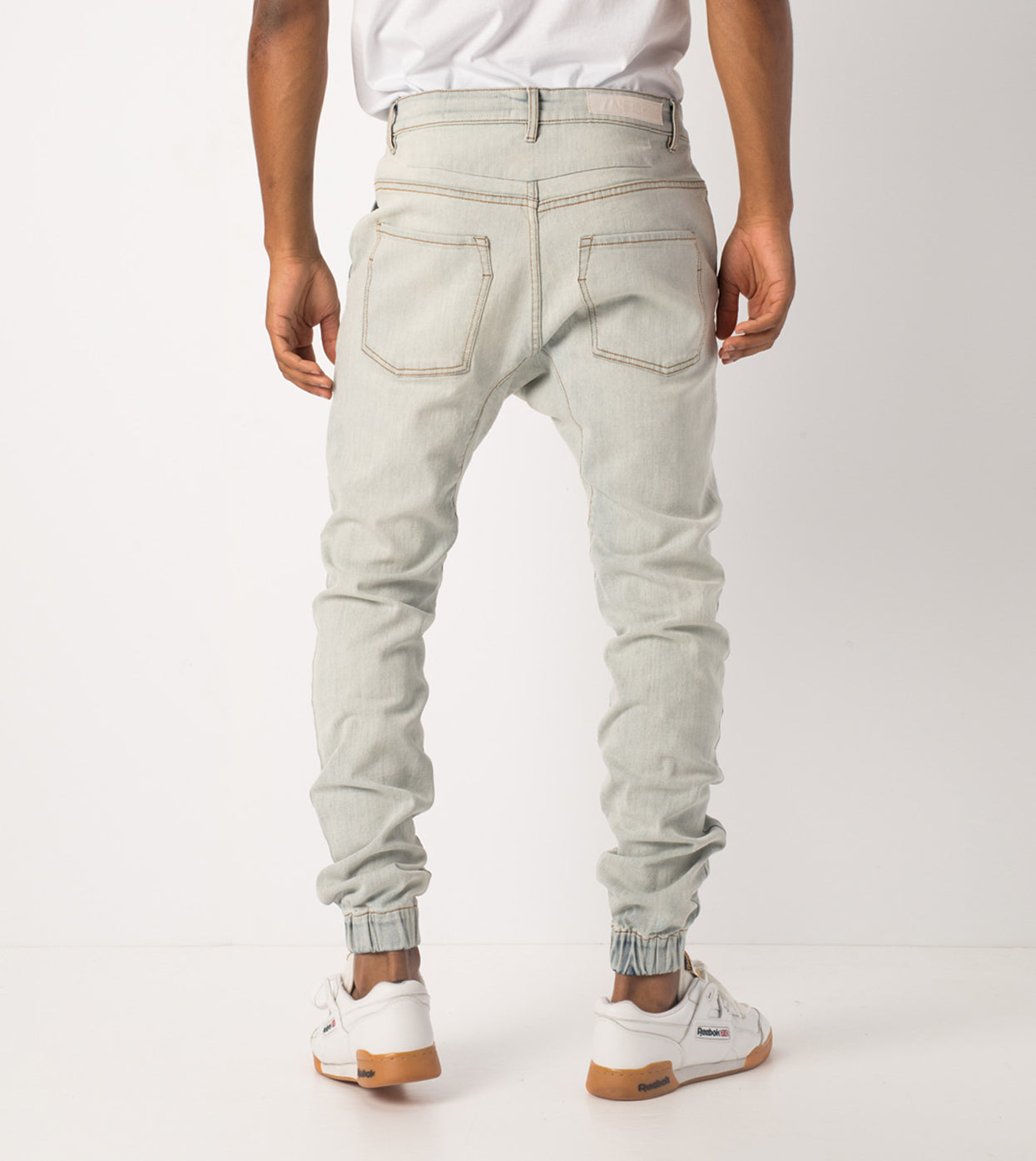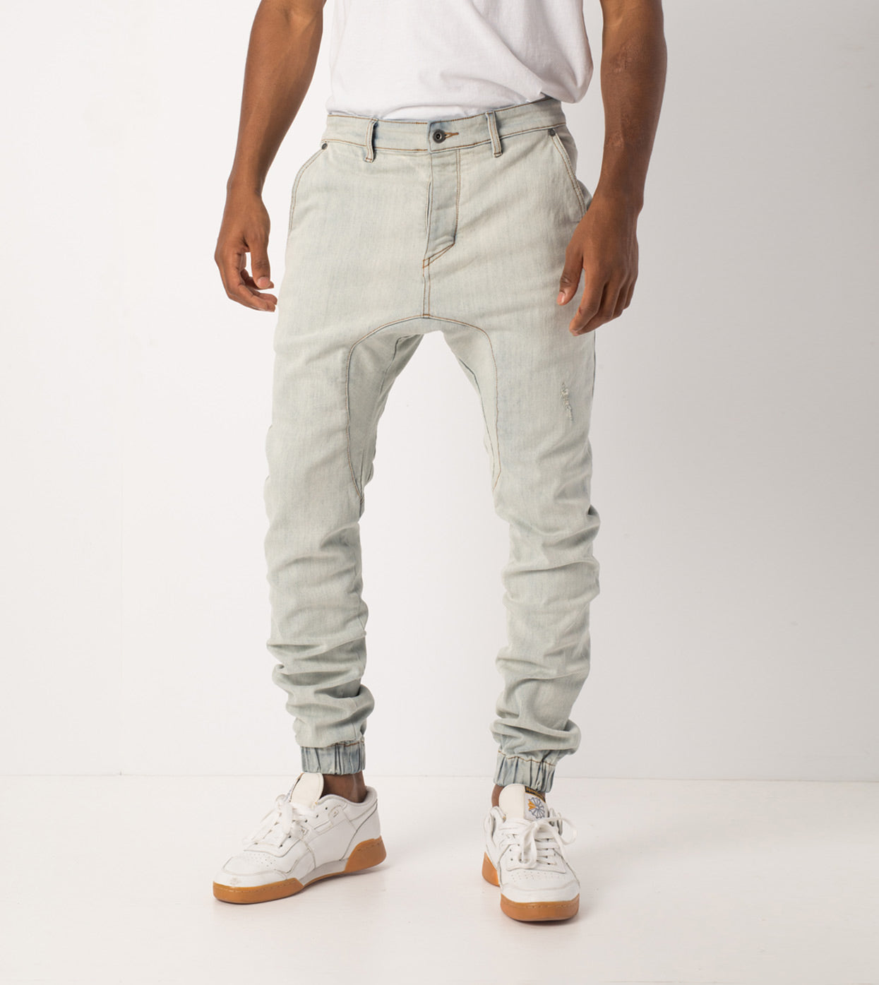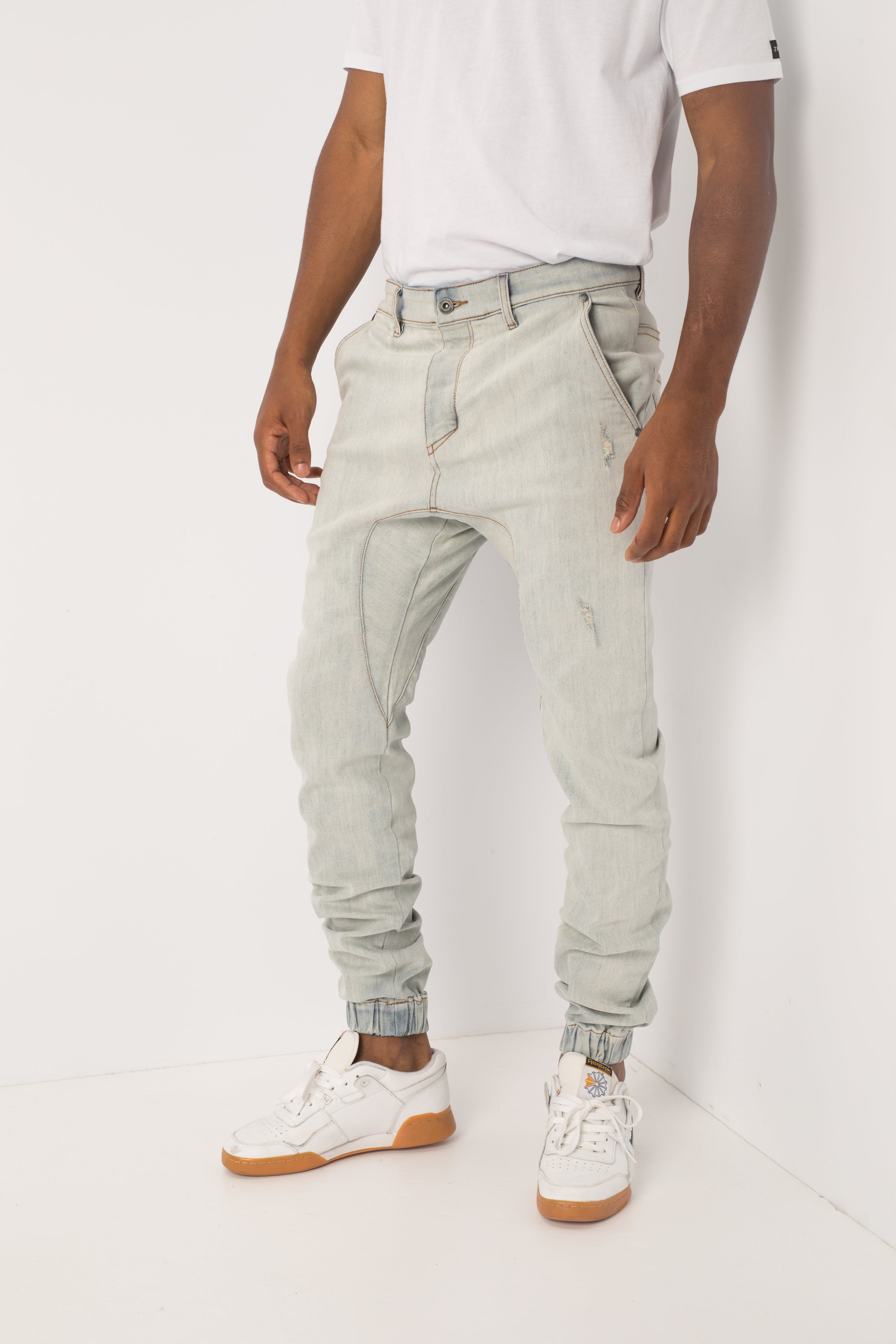 The ZANEROBE Sureshot Denimo in Blonde Wash - signature denim jogger pant, constructed waist, button fly, signature crotch panel, relaxed rise, tapered fit through leg, elastic cuff, hand distressed details, chino style pockets, constructed from 74% cotton, 16% polyester, 9% rayon, 1% elastane. We wear with a basic Flintlock tee.