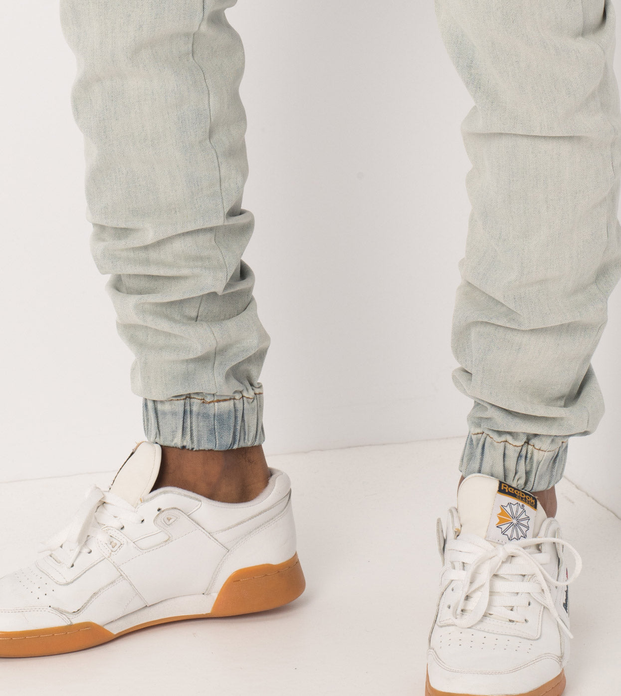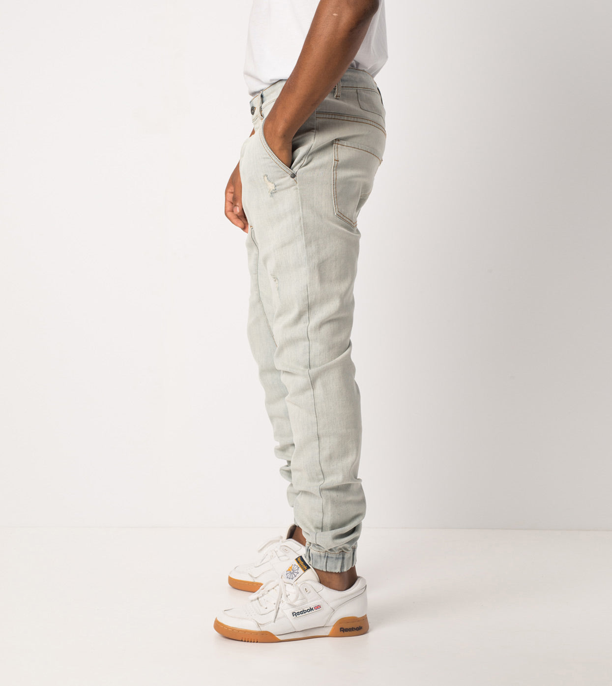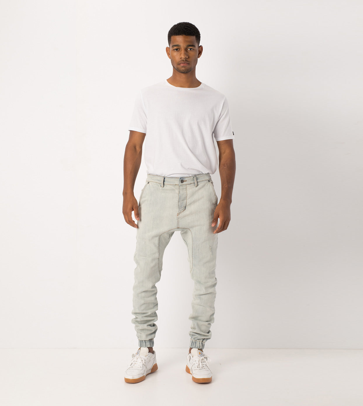 The ZANEROBE Sureshot Denimo in Blonde Wash - signature denim jogger pant, constructed waist, button fly, signature crotch panel, relaxed rise, tapered fit through leg, elastic cuff, hand distressed details, chino style pockets, constructed from 74% cotton, 16% polyester, 9% rayon, 1% elastane. We wear with a basic Flintlock tee.