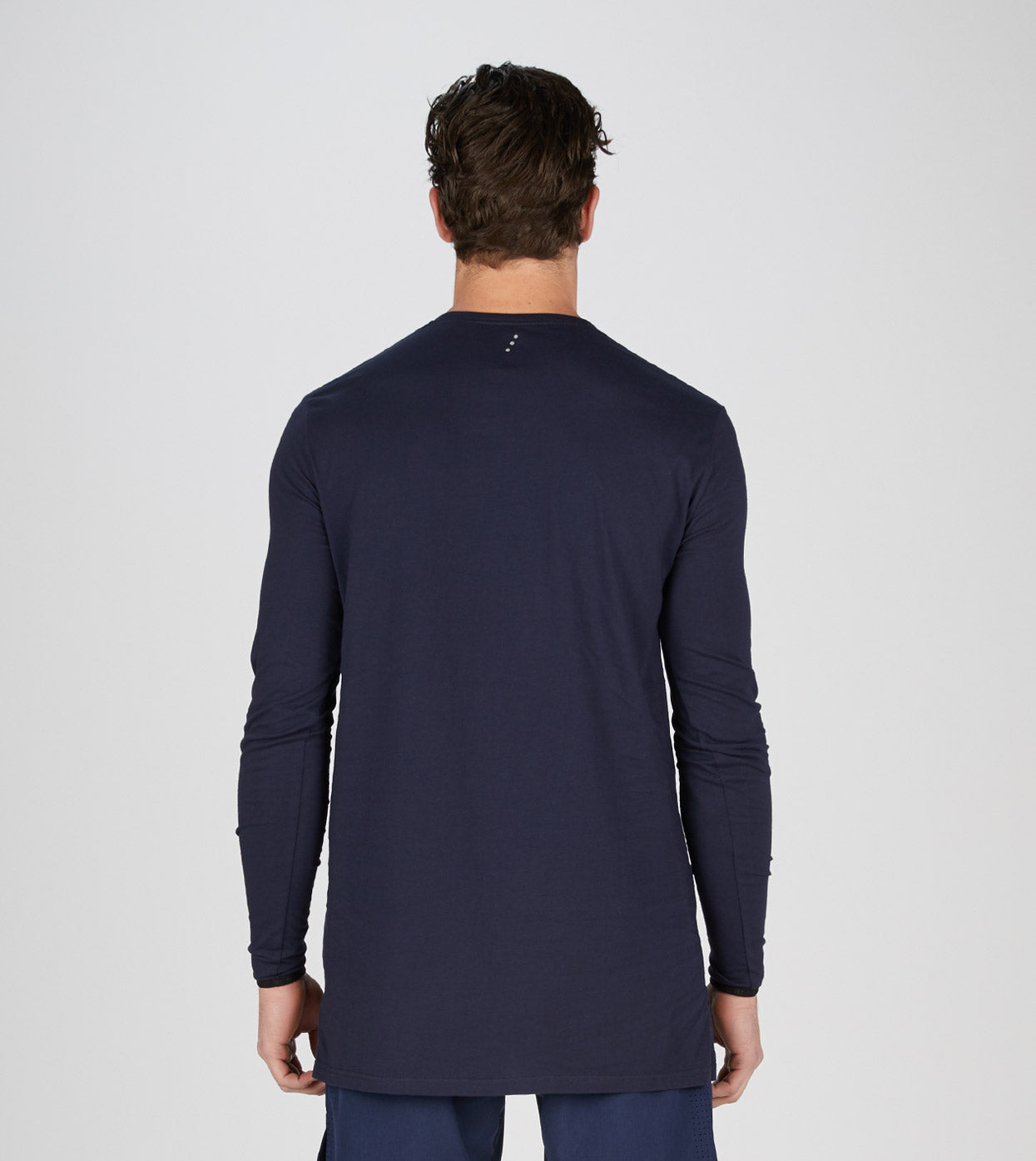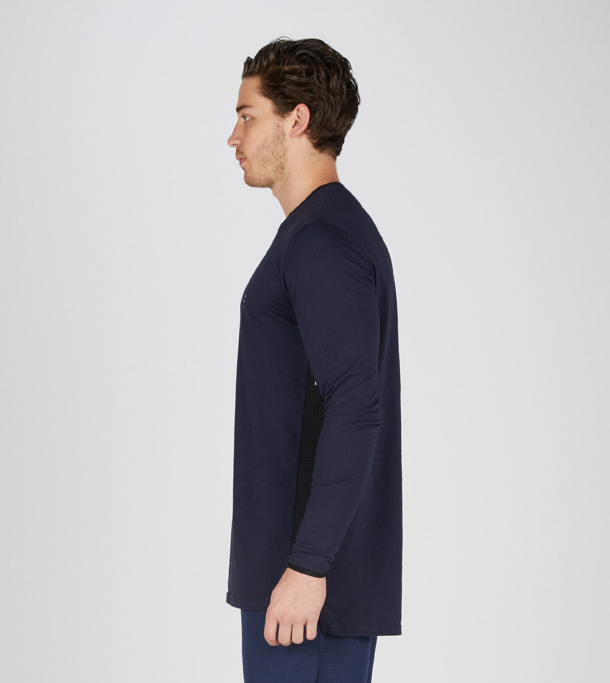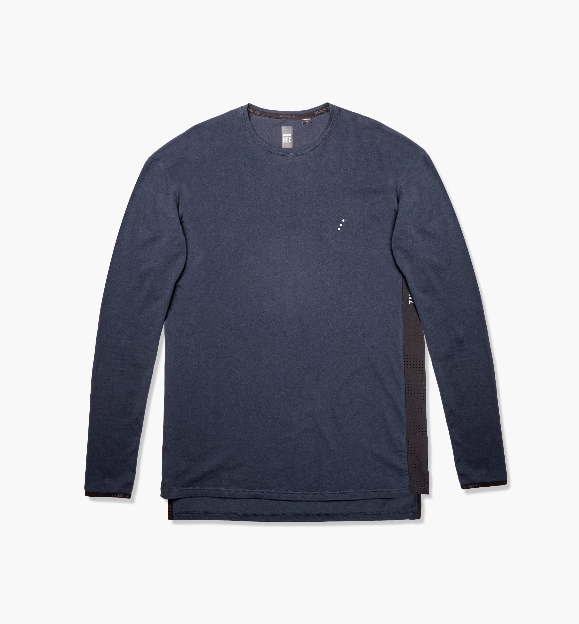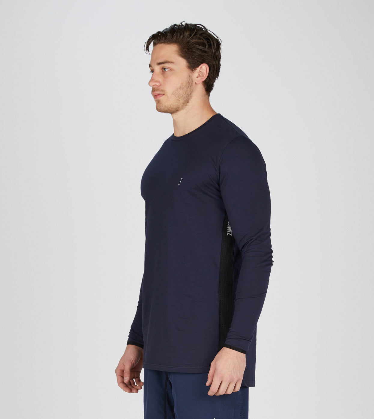 The ZANEROBE Tech Flintlock LS Tee in Midnight - Long sleeve performance mid-layer with tech stretch tension and memory. Enables movement with no resistance, climate controlled for training comfort. Perforated stretch side-body insert, reinforced branded cuff, high density rubber REC ‘three-dot’ logo print on chest. Perfect for warm-up, training, competition and recovery.