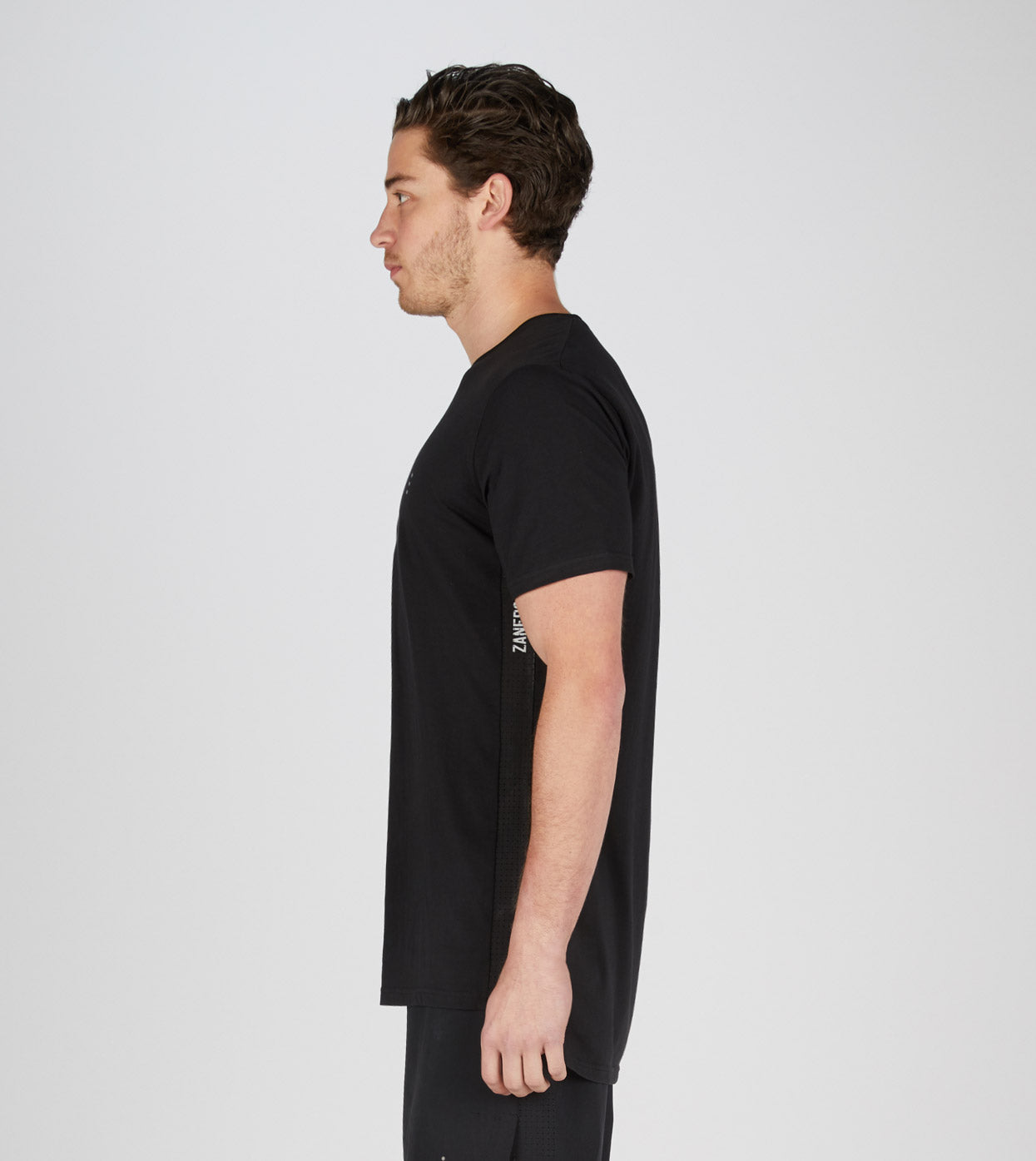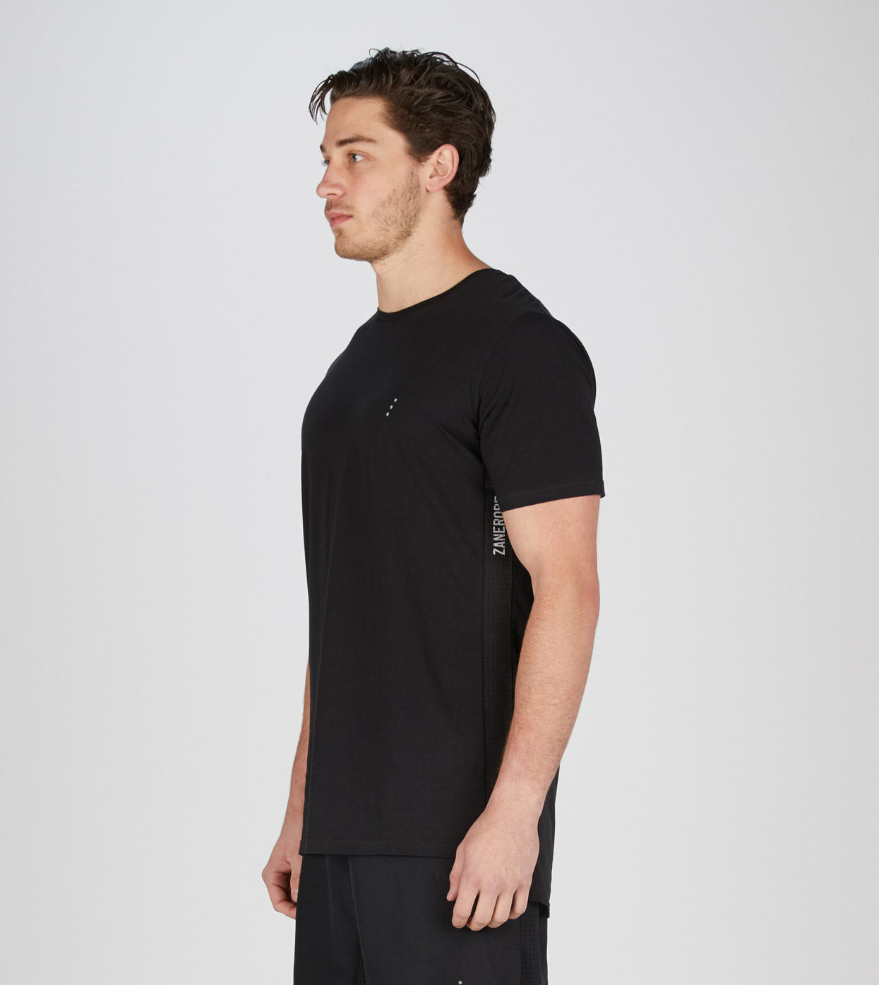 Performance crew tee with tech stretch tension and memory. Enables movement with no resistance, climate controlled for training comfort. Perforated stretch side-body insert, high density rubber REC 'three-dot' logo print on chest. Perfect for warm-up, training and competing.