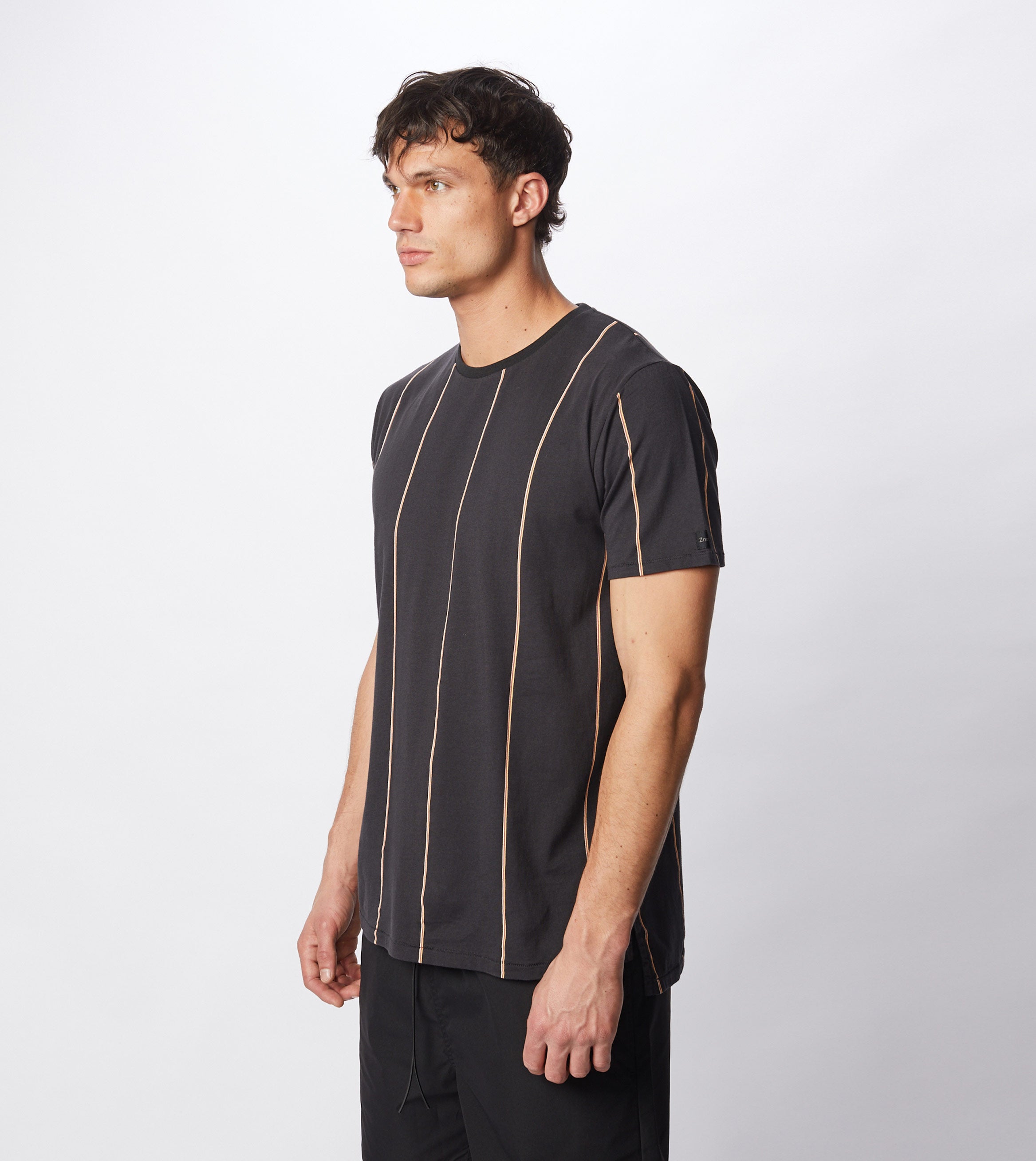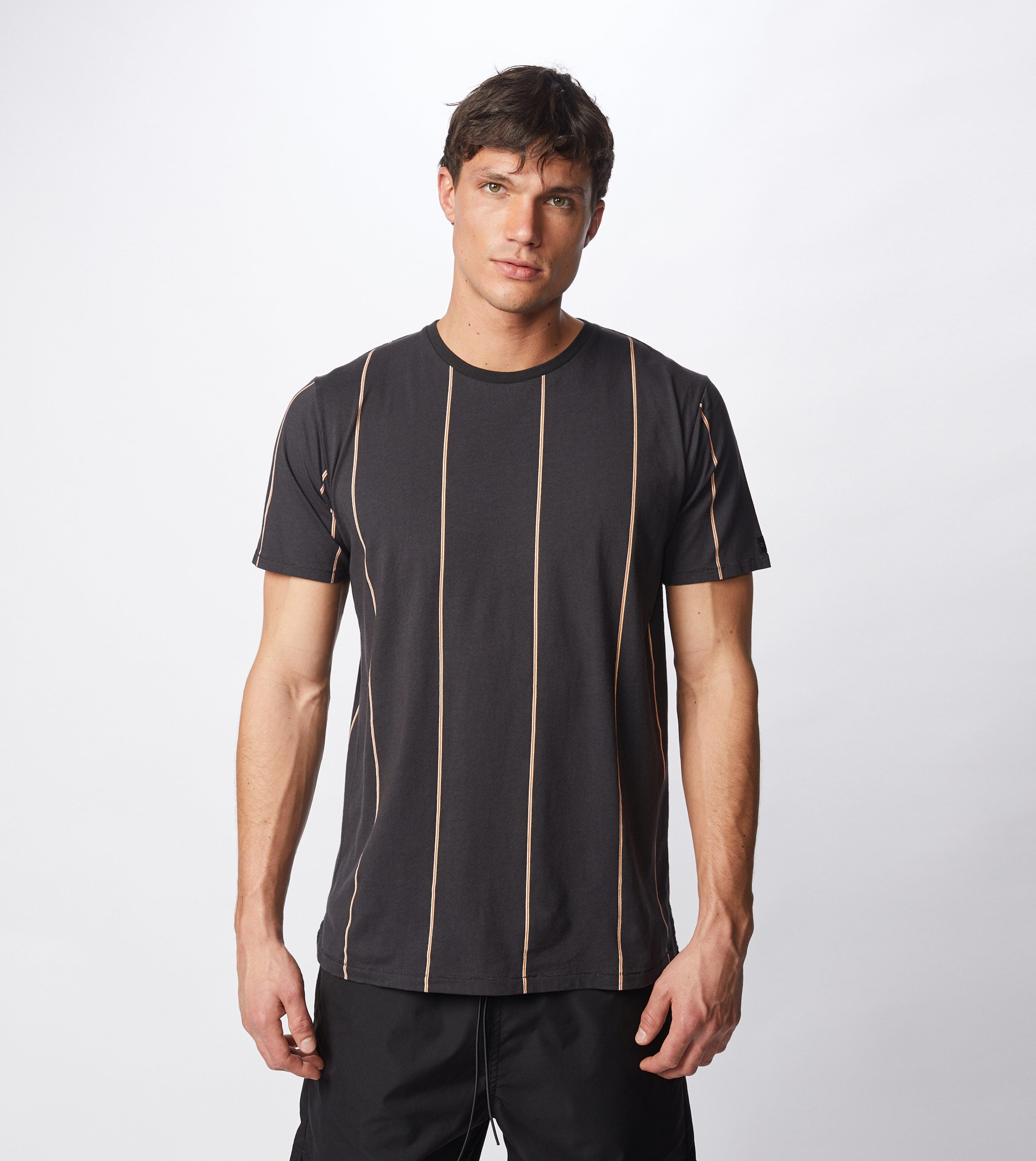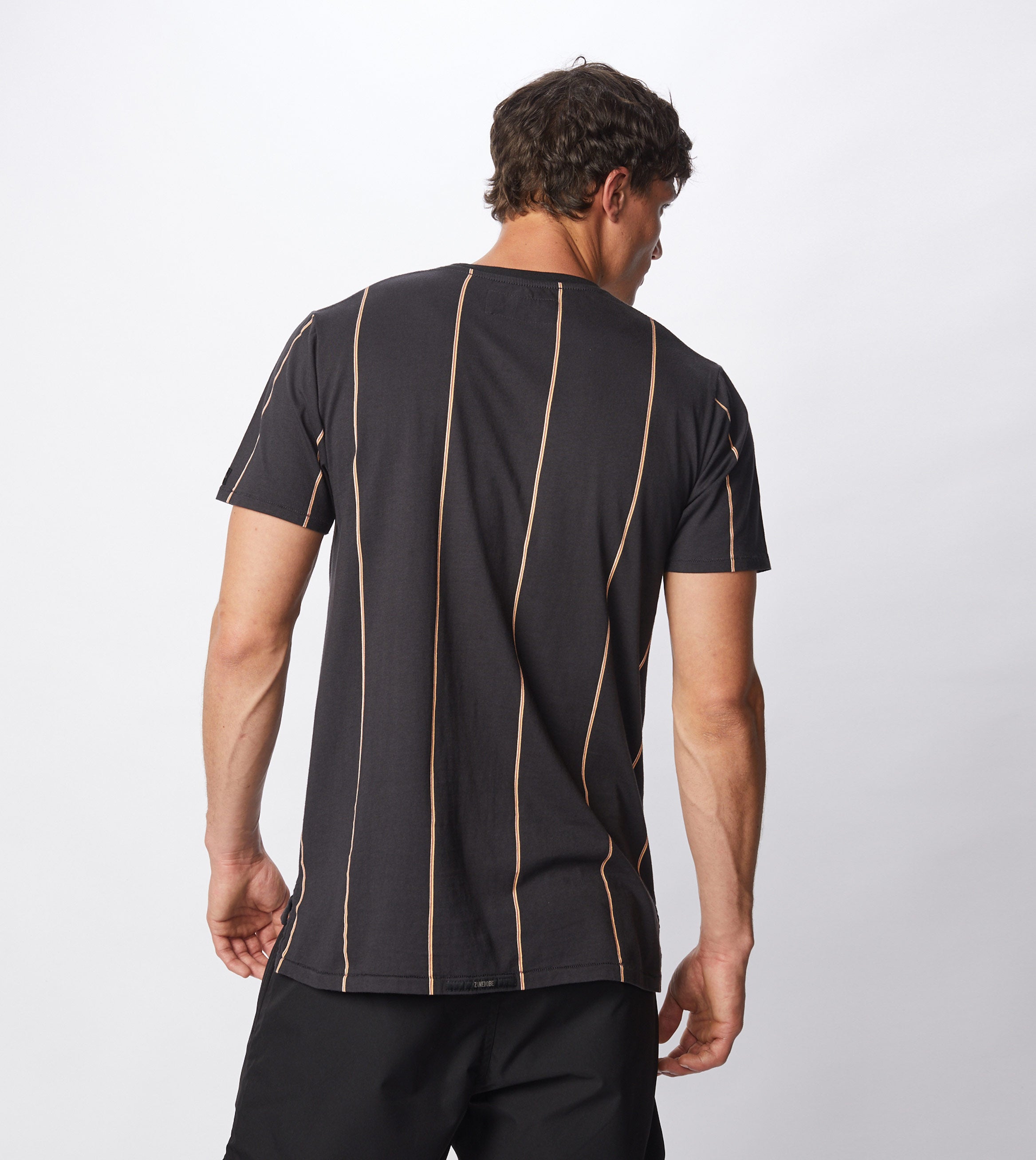 The ZANEROBE Tri-Stripe Flintlock Tee in Black/Mango - our best selling Tee silhouette in a stripe print.  We wear ours with our classic Sureshot Jogger or some skinny ZANEROBE jeans.