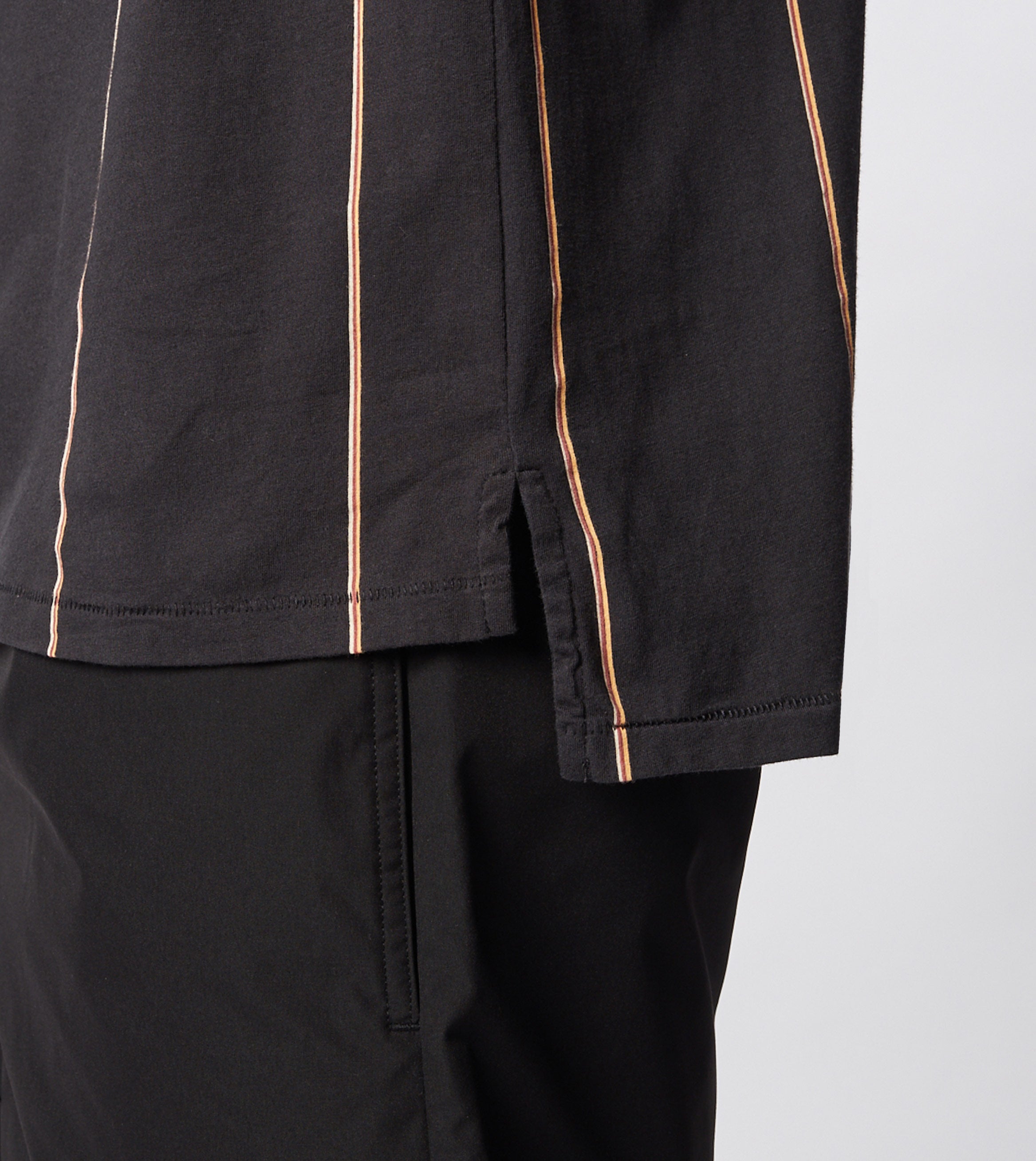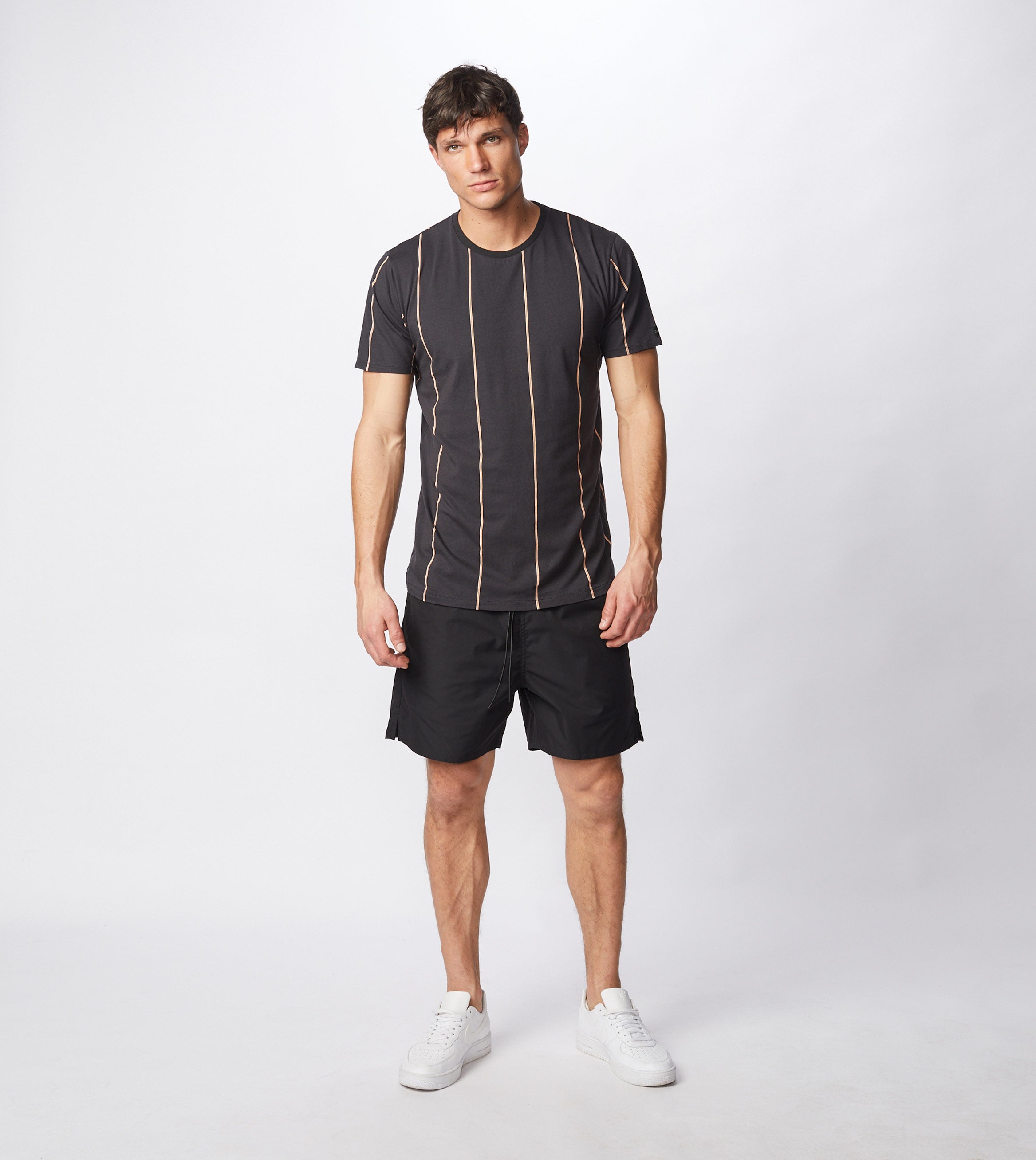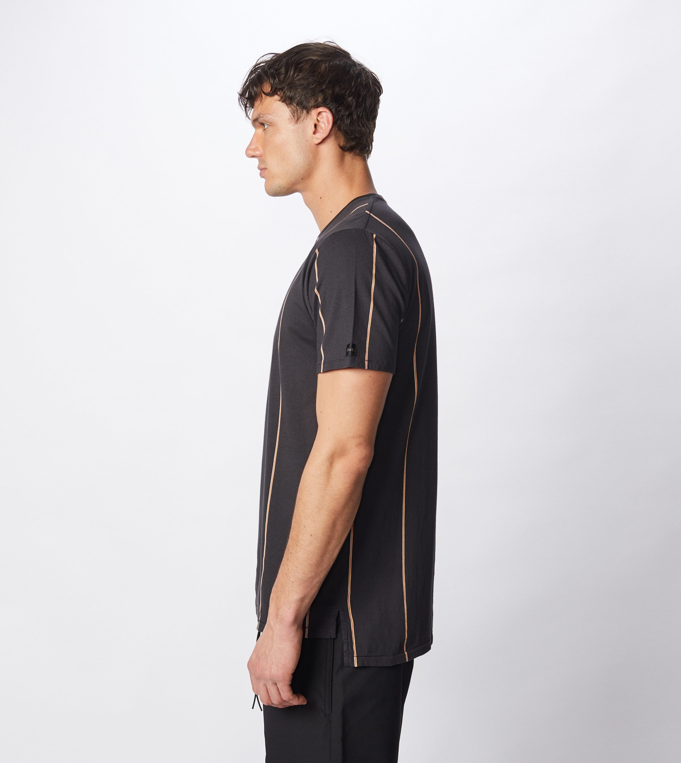 The ZANEROBE Tri-Stripe Flintlock Tee in Black/Mango - our best selling Tee silhouette in a stripe print.  We wear ours with our classic Sureshot Jogger or some skinny ZANEROBE jeans.