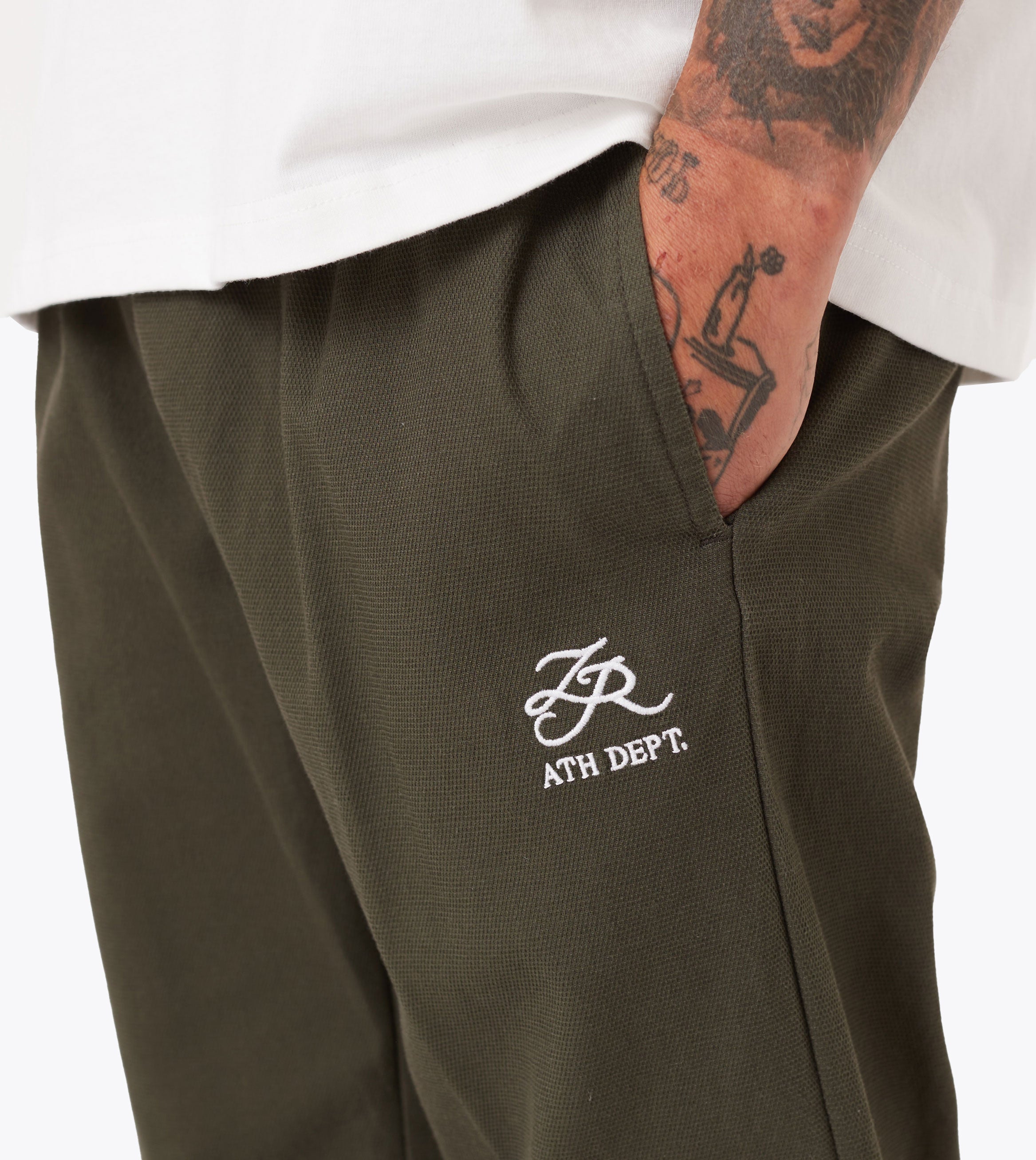 The ZANEROBE Warm-Up Pant in Olive is crafted from a durable nylon, cotton, and elastane honeycomb dobby fabric, offering both comfort and stretch. With an elastic waistband and internal drawcords, these pants provide a customizable fit for all-day wear. Finished with ZR Ath. Dept satin stitch embroidery, they combine sleek design with functional style for your everyday essentials.